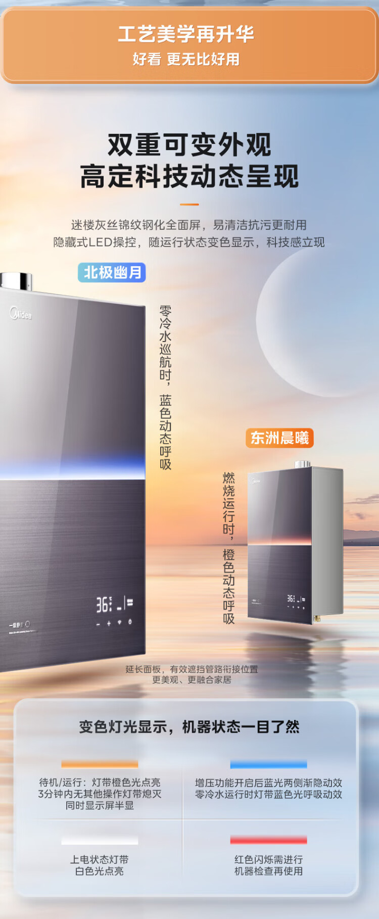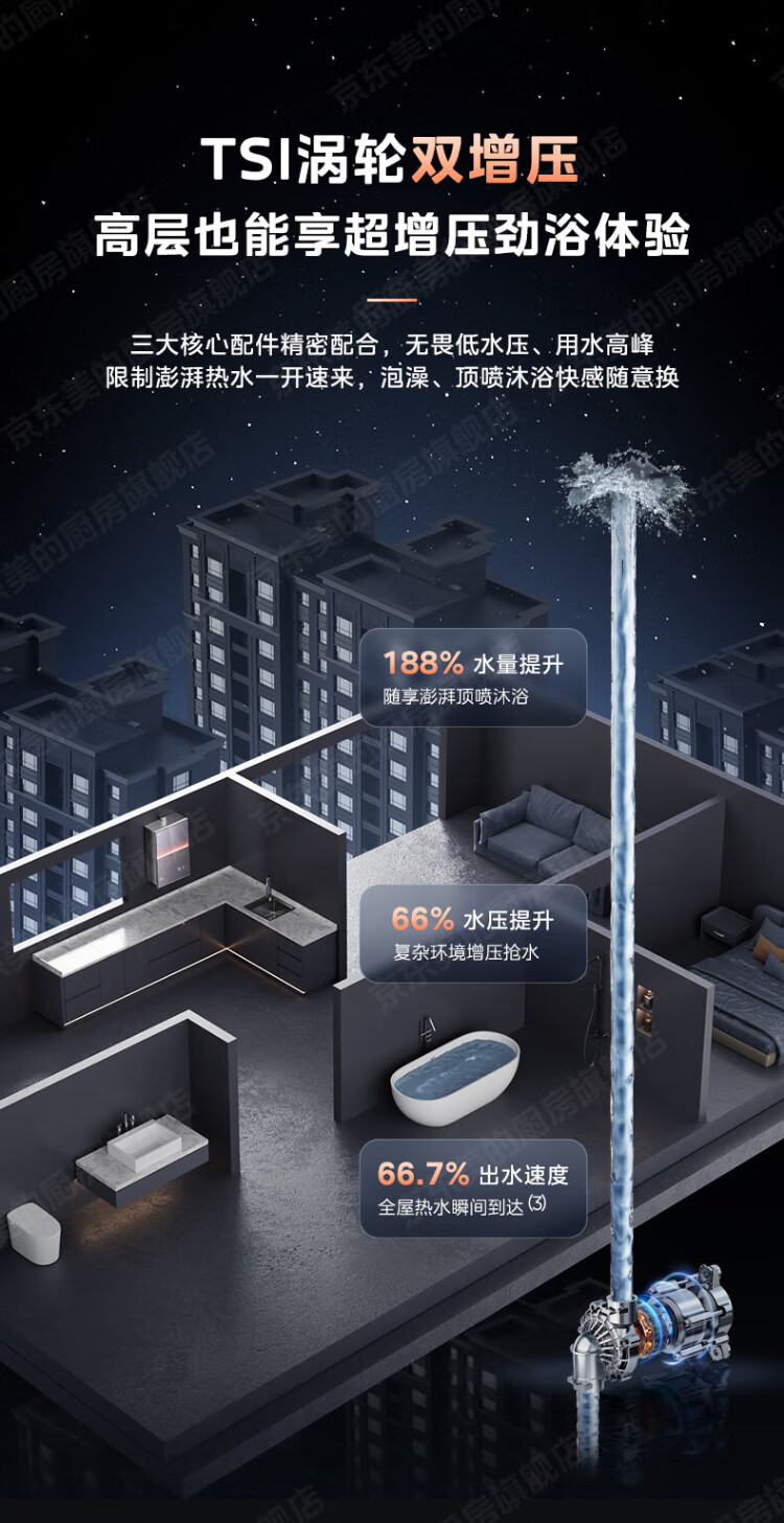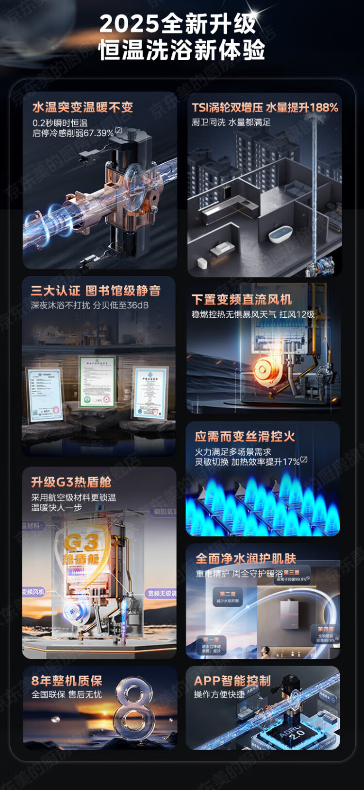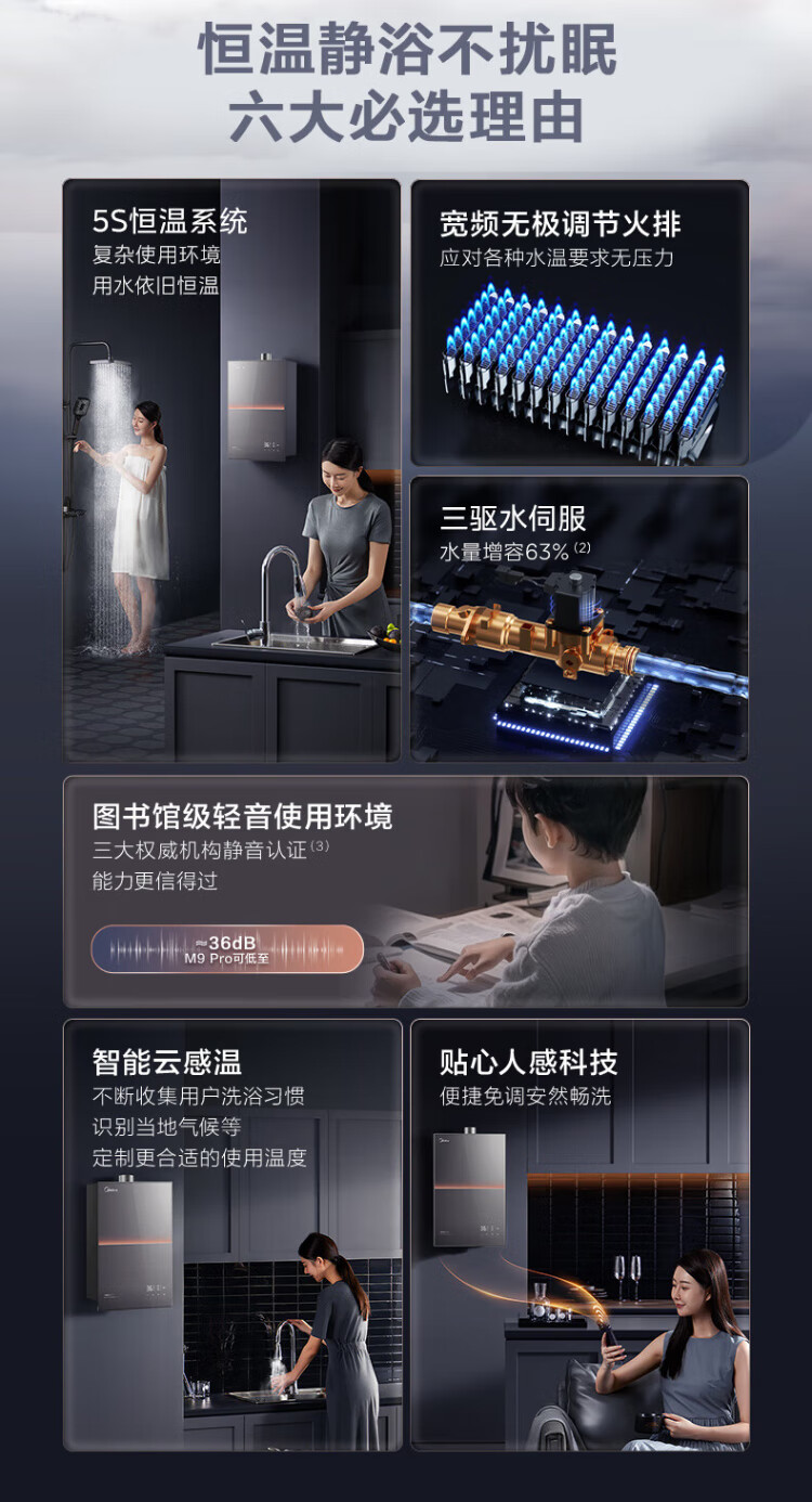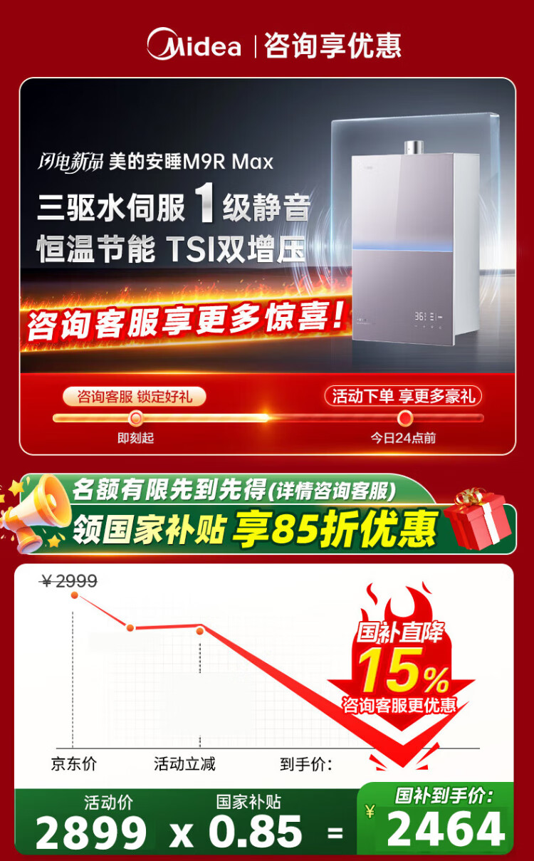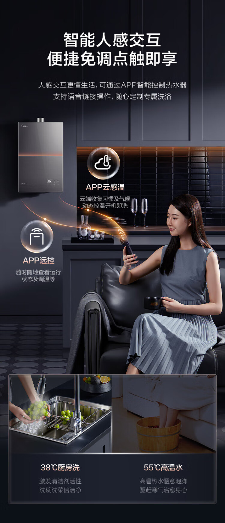 Midea's new product M9RMax gas water heater TSI dual supercharger, three-wheel drive water servo, first-level silent 16-liter natural gas under-mounted fan ECO energy saving, sleep series zero cold feeling 16L TSI dual supercharger M9R Max