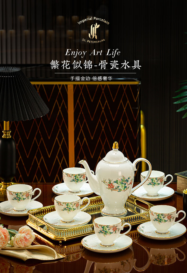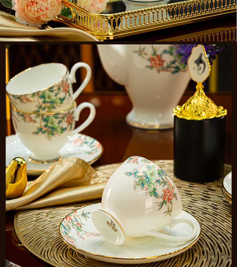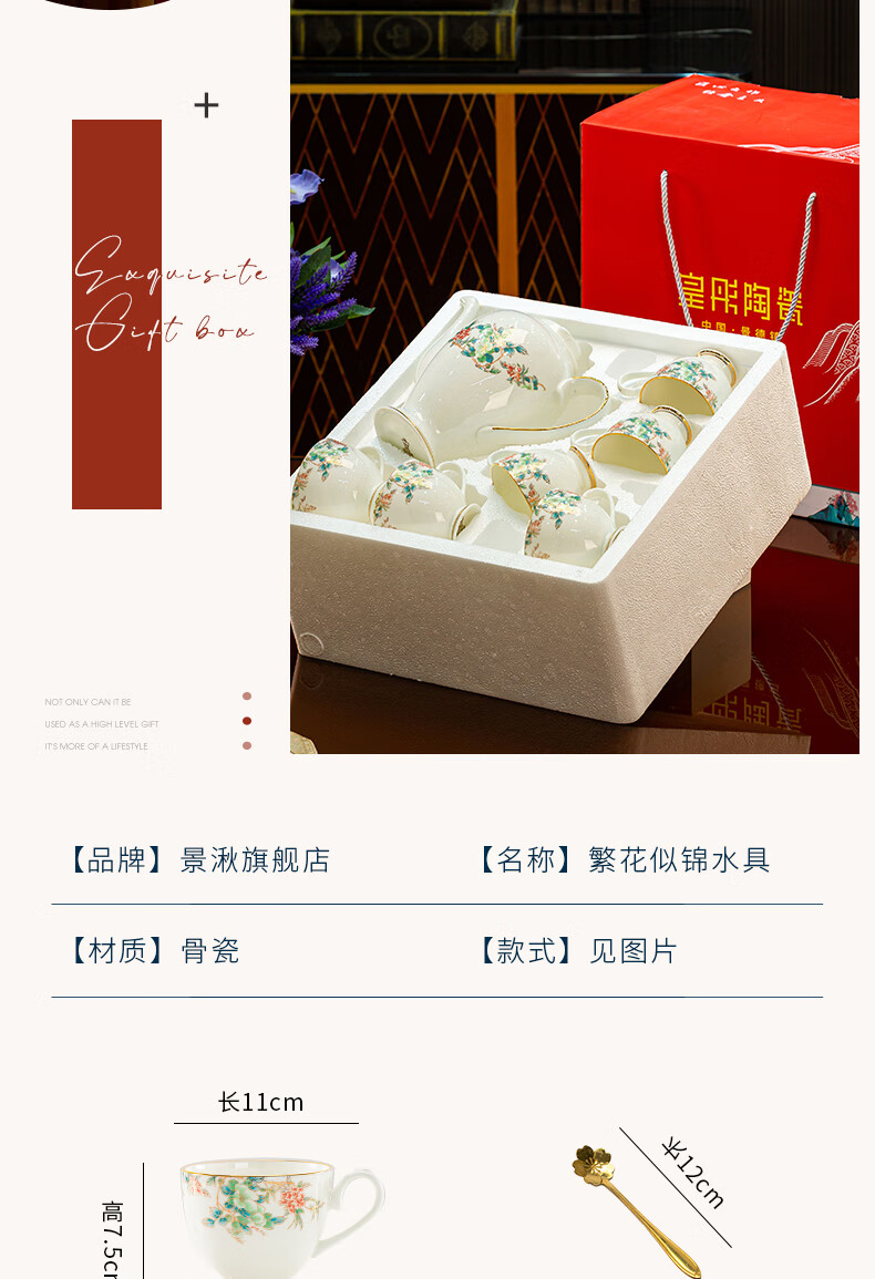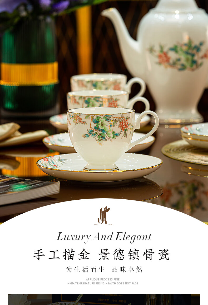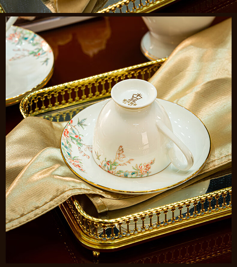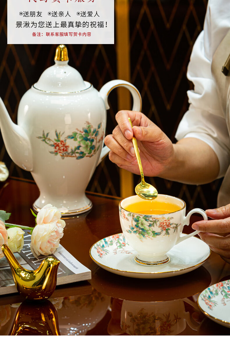 Jingqiu underglaze color high-end water set Jingdezhen high temperature bone china tea set water cup kettle complete set household gift box underglaze color flowery water set 13 pieces