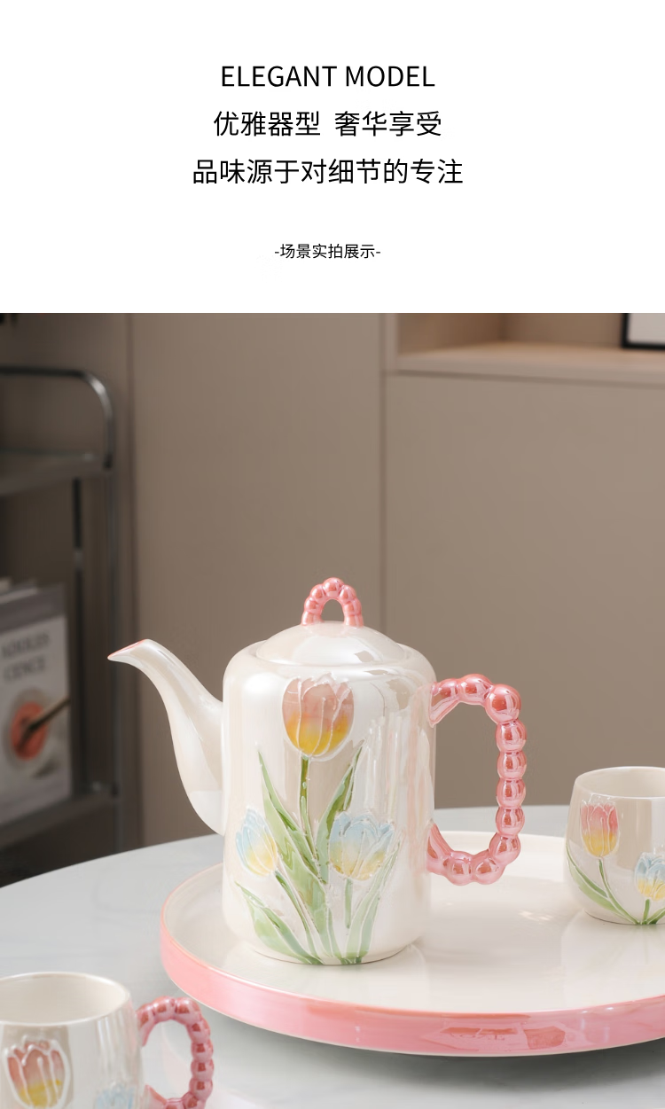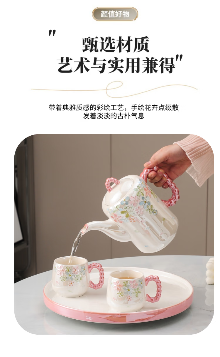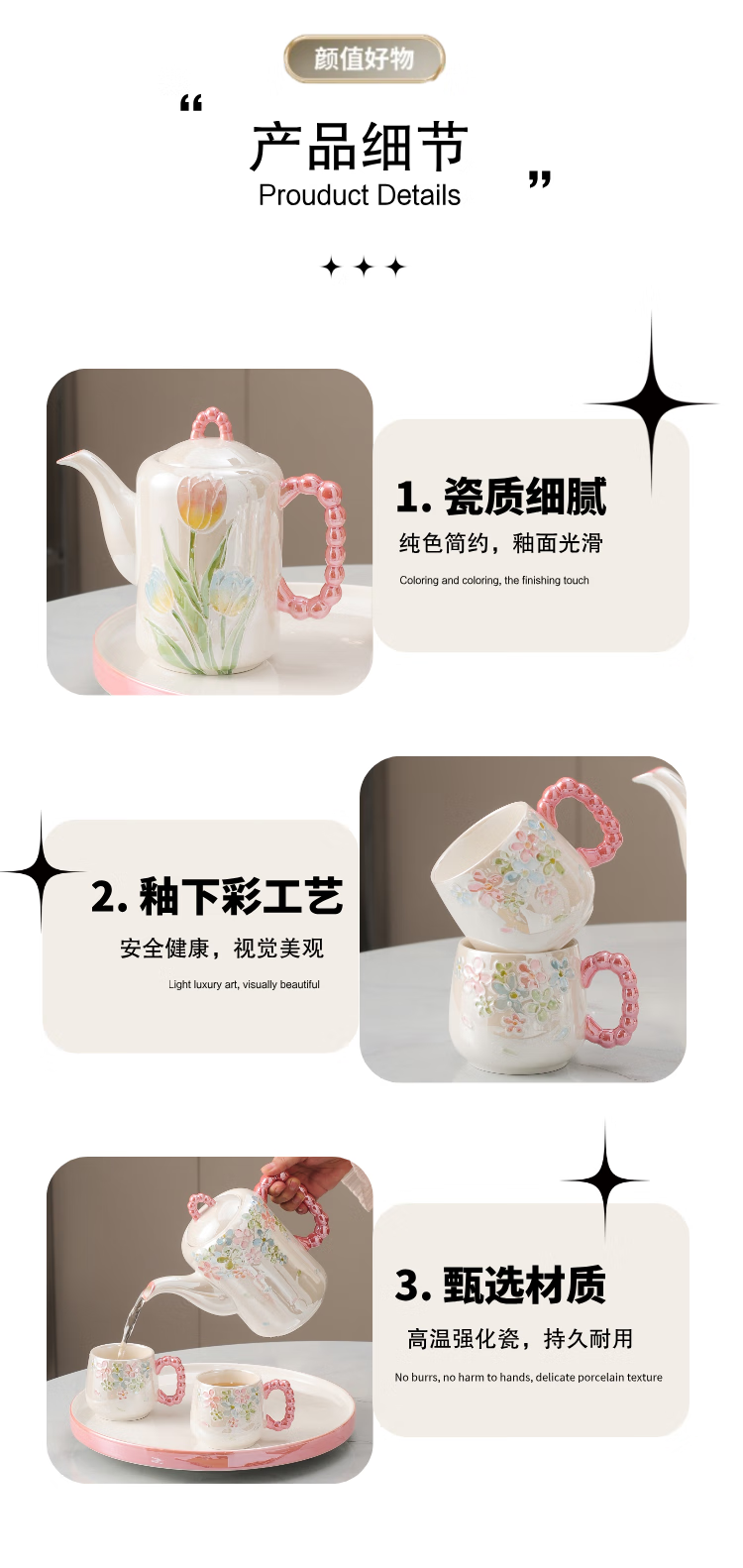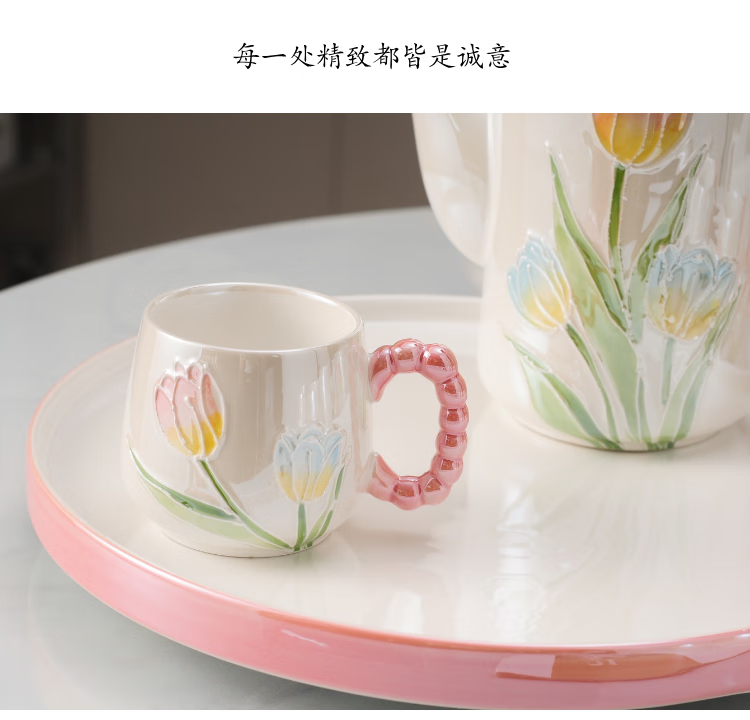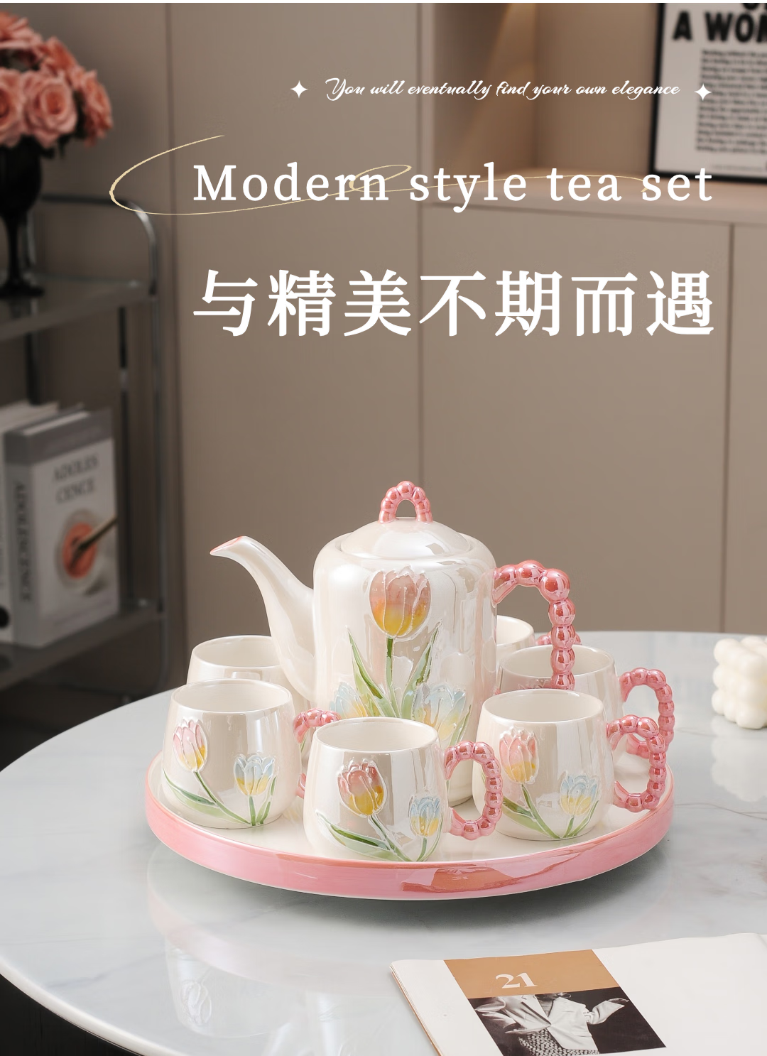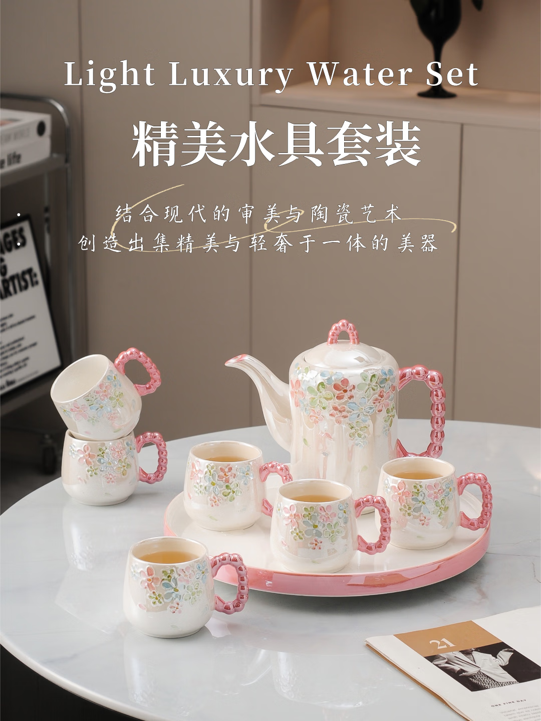 Yanze underglaze hand-painted light luxury wedding gift for newlyweds tea set set glass mug ceramic cup practical gift peach pink begonia eight-piece set-gift box