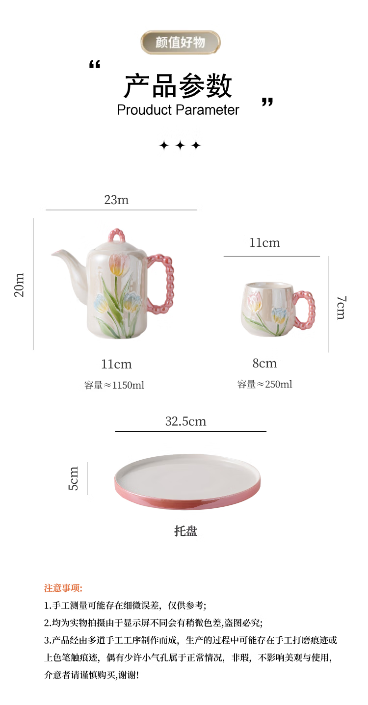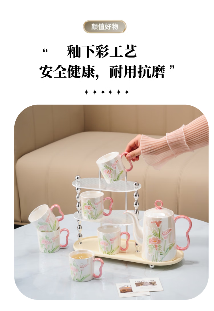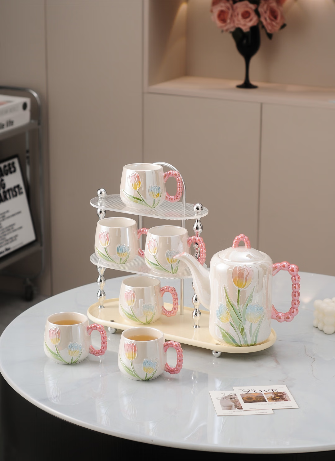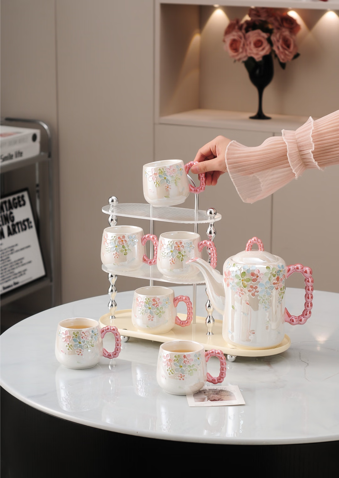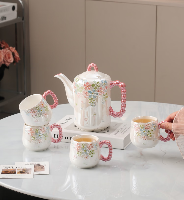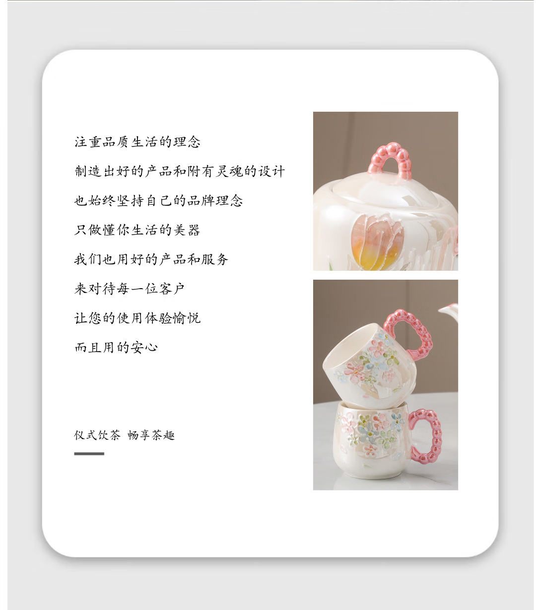 Yanze underglaze hand-painted light luxury wedding gift for newlyweds tea set set glass mug ceramic cup practical gift peach pink begonia eight-piece set-gift box