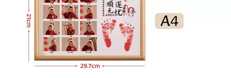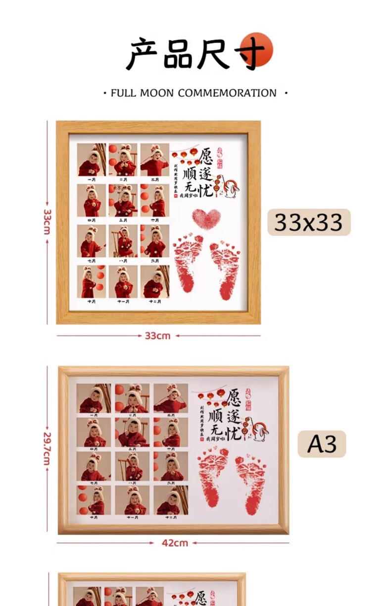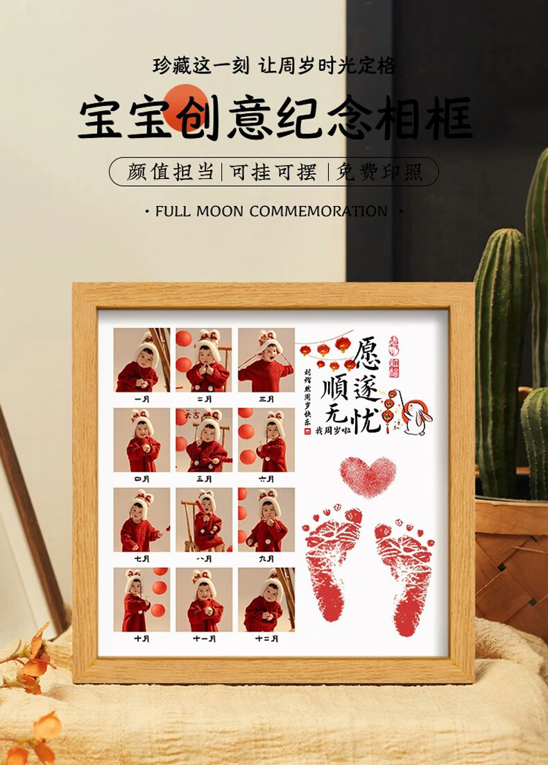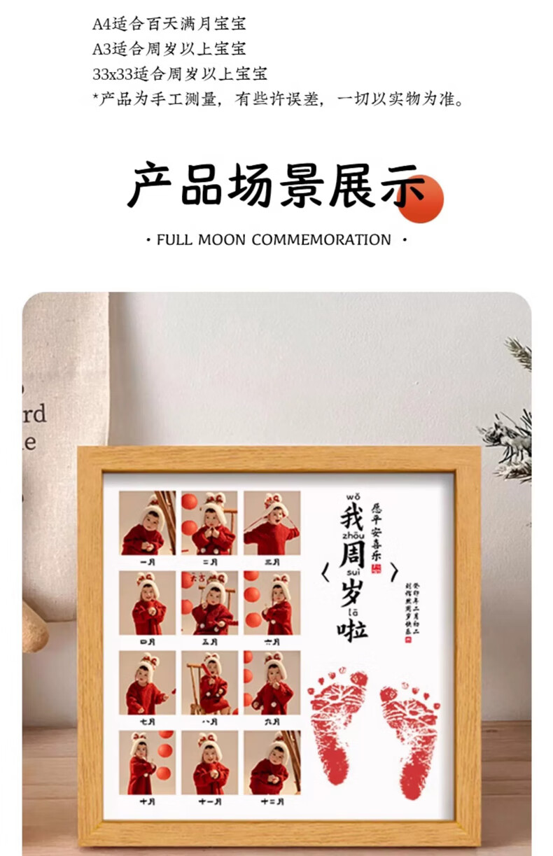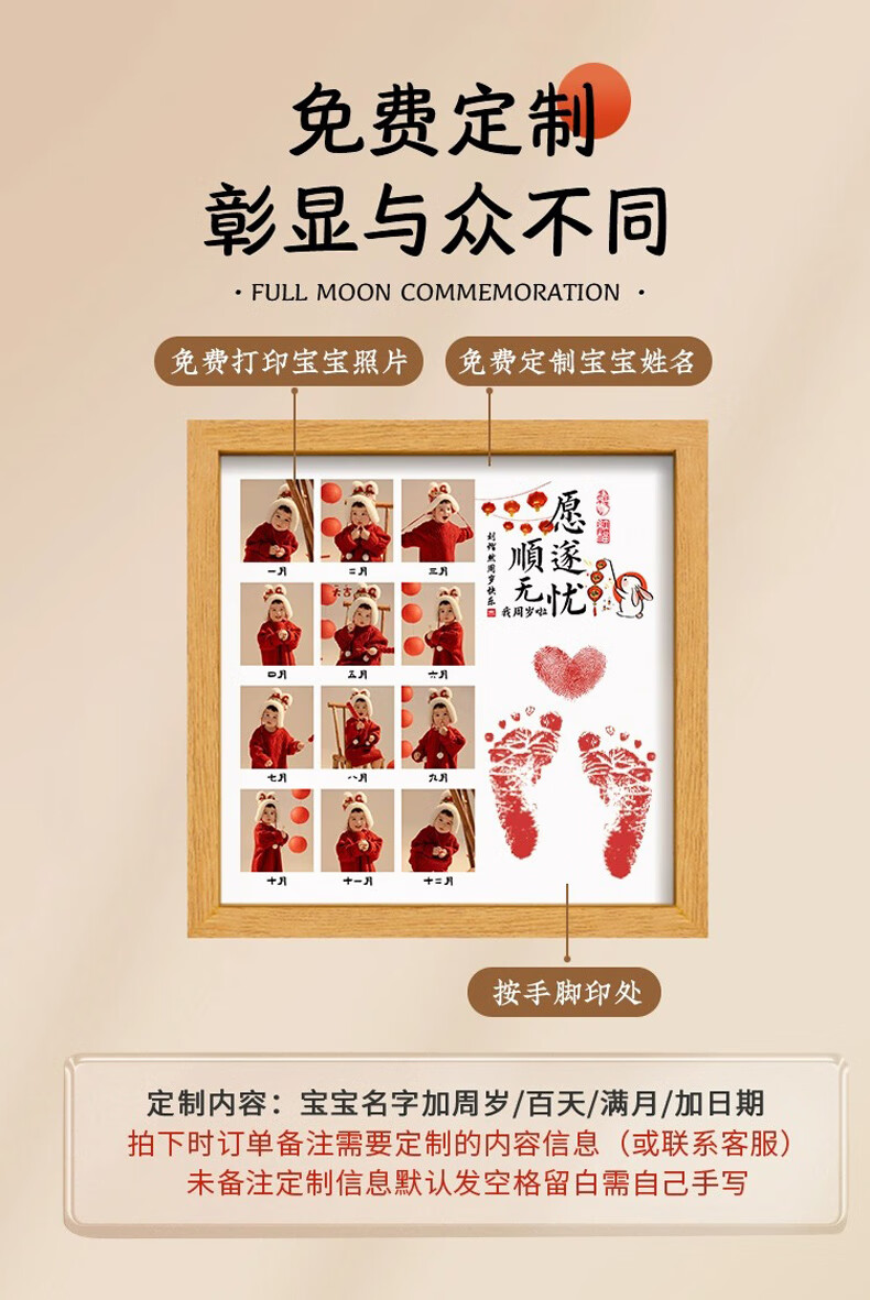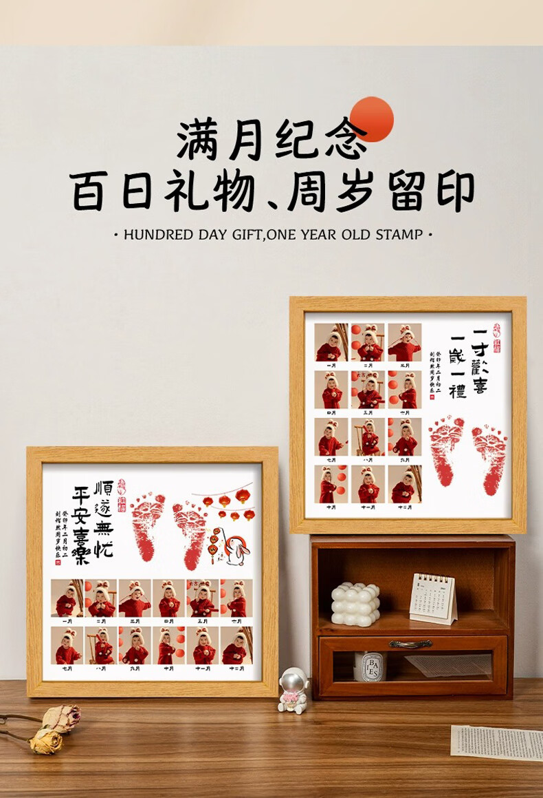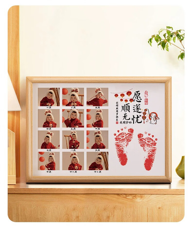 Grasping one-year-old hand and foot prints for baby dragon's birthday commemorative hand and footprints for celebrating one-year-old baby's birthday ritual props for one-year-old and one-year-old gifts photo frame to commemorate, solid wood with 33 square angles, wishing all the best and worry-free dragon