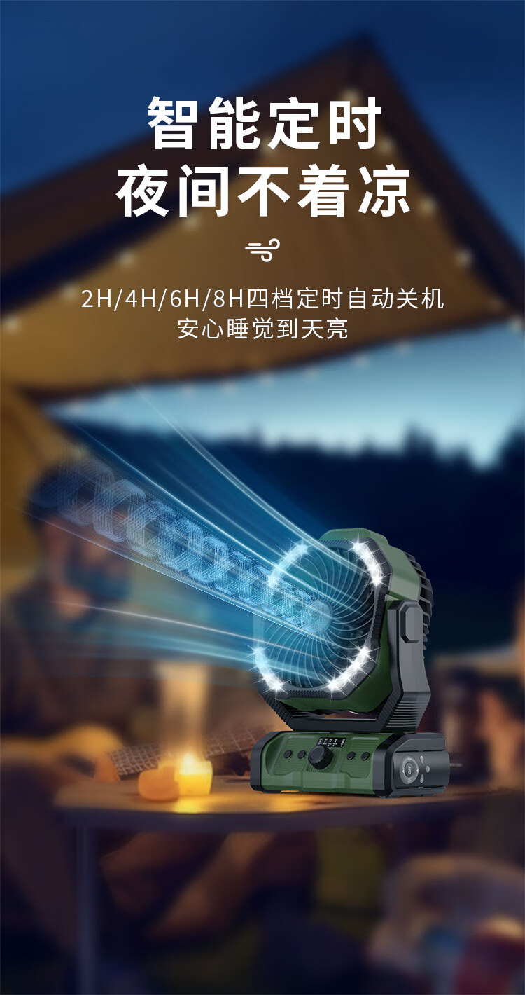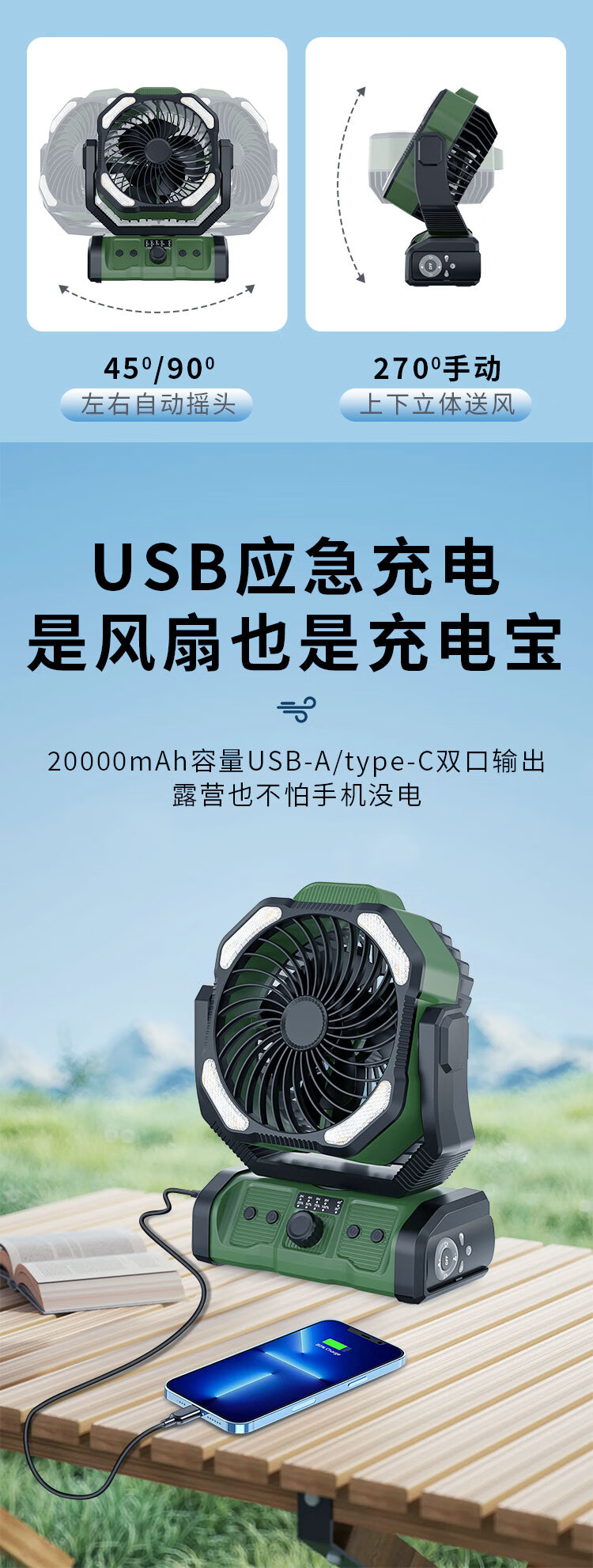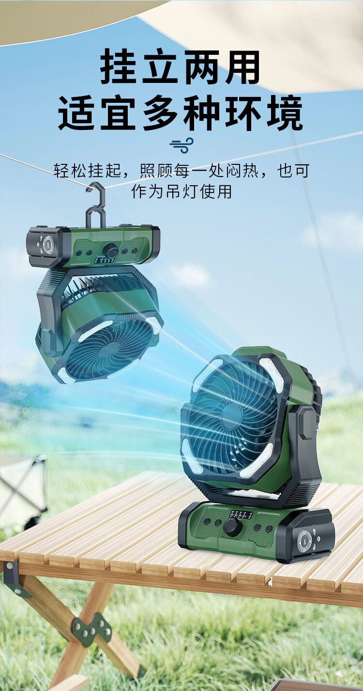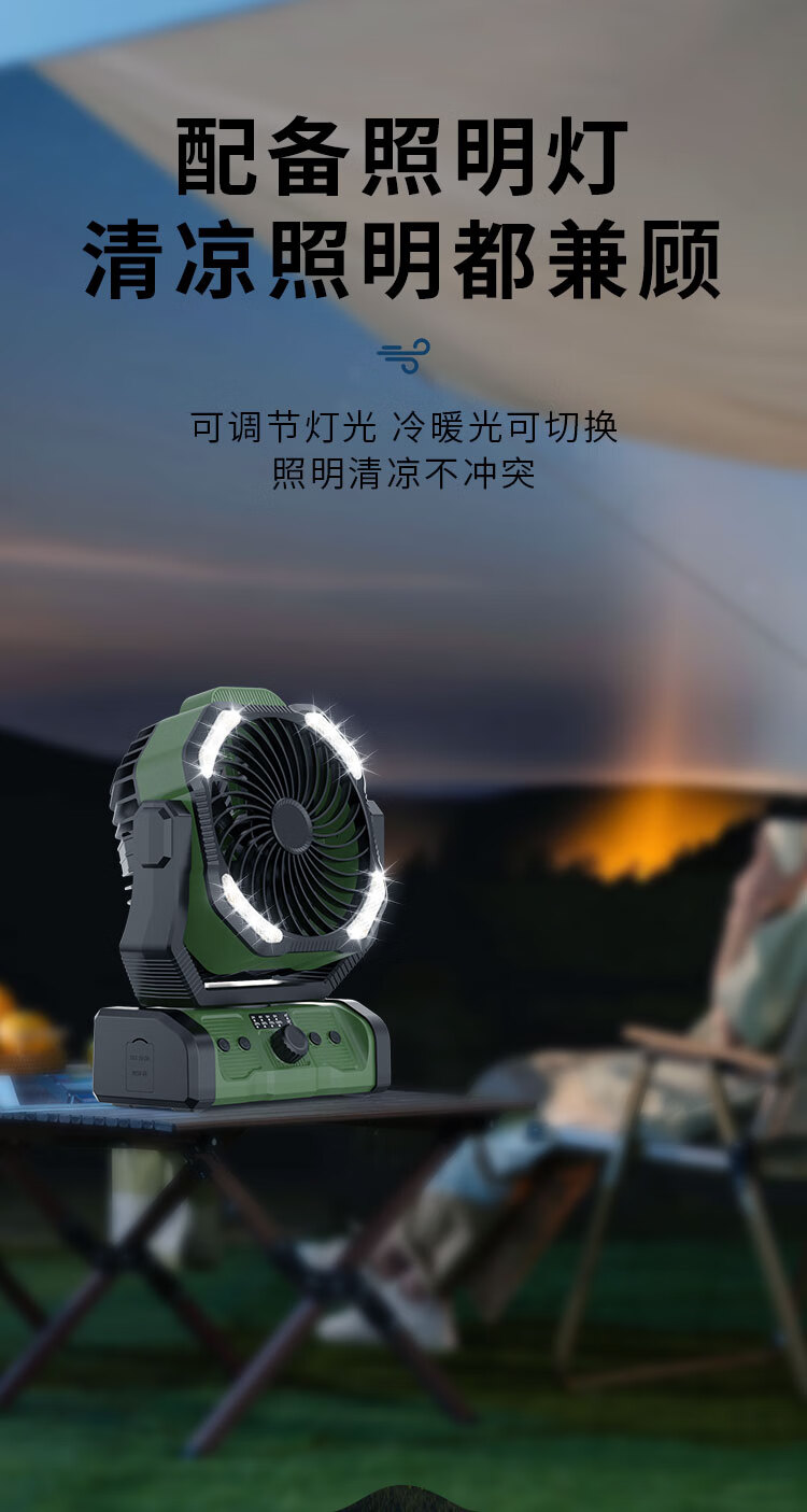 Syouran outdoor camping fan rechargeable fan super long battery life high wind field tent fishing fishing large capacity lithium battery dormitory desktop power bank three-in-one wireless portable military green 20,000 mAh/shaking timer/lighting/power bank multi-purpose