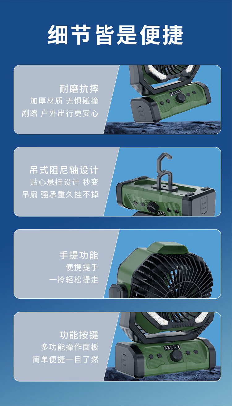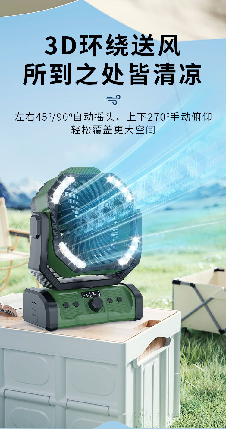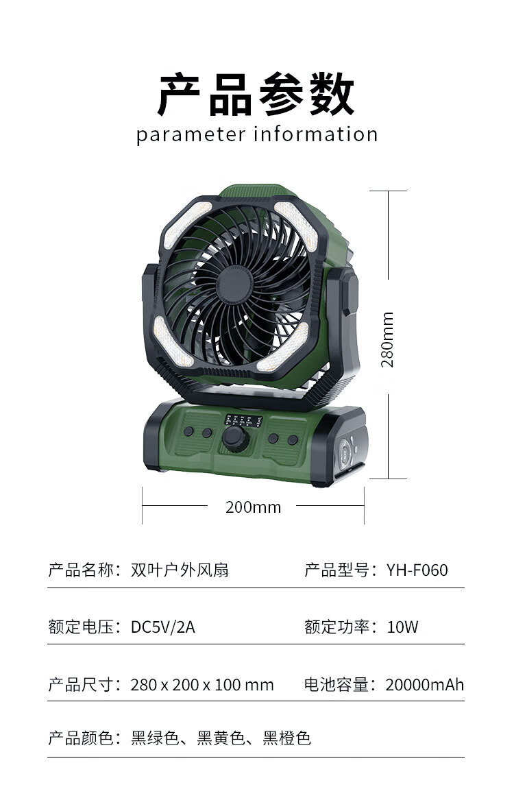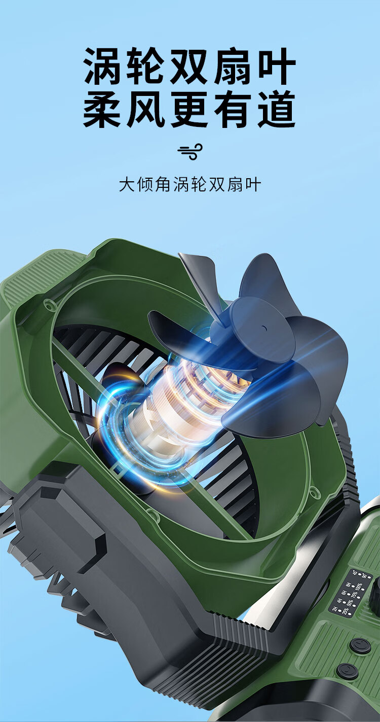 Syouran outdoor camping fan rechargeable fan super long battery life high wind field tent fishing fishing large capacity lithium battery dormitory desktop power bank three-in-one wireless portable military green 20,000 mAh/shaking timer/lighting/power bank multi-purpose