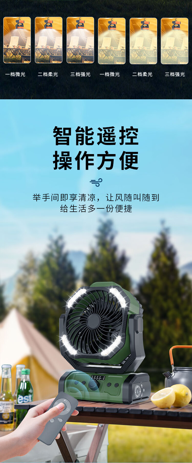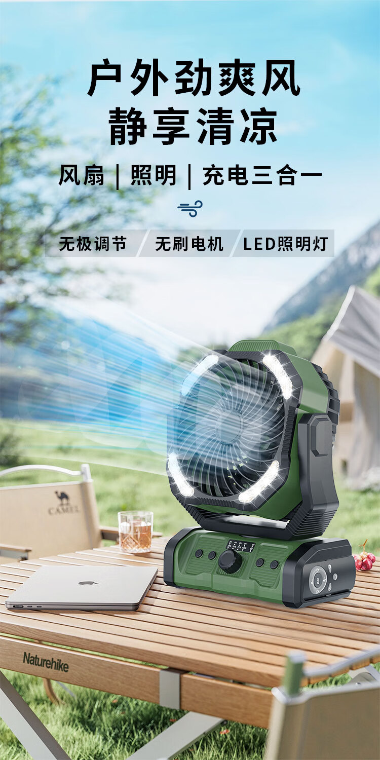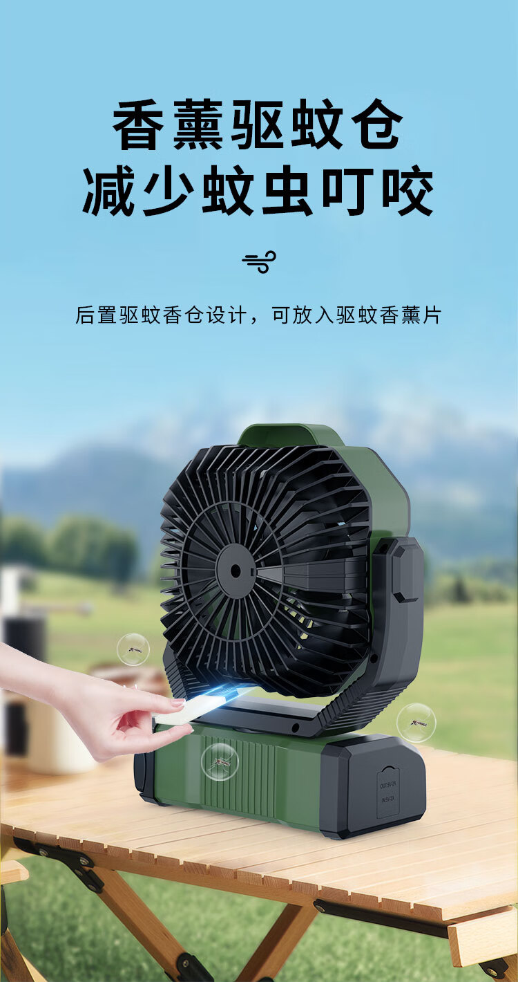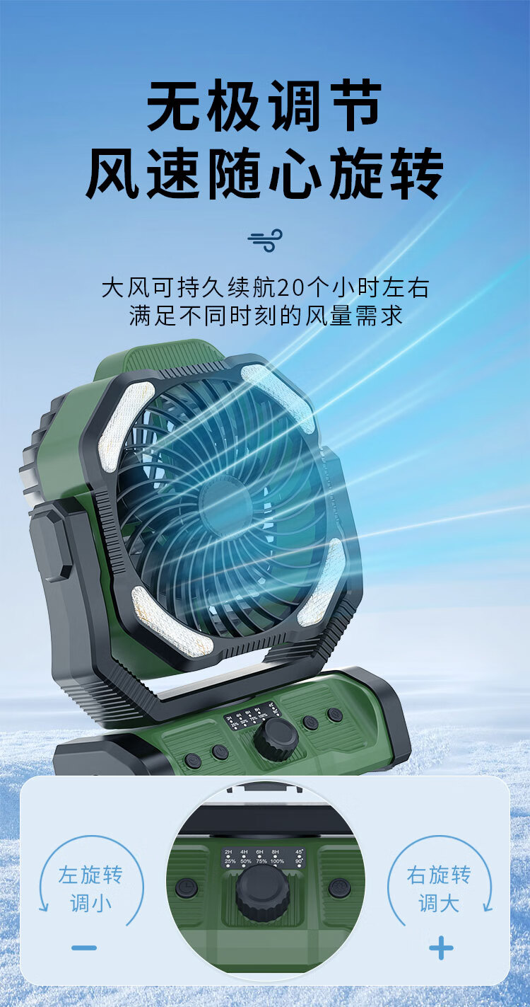 Syouran outdoor camping fan rechargeable fan super long battery life high wind field tent fishing fishing large capacity lithium battery dormitory desktop power bank three-in-one wireless portable military green 20,000 mAh/shaking timer/lighting/power bank multi-purpose