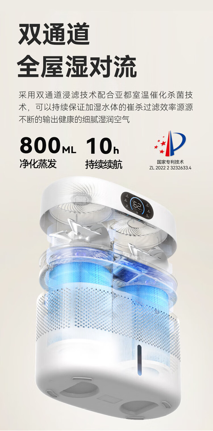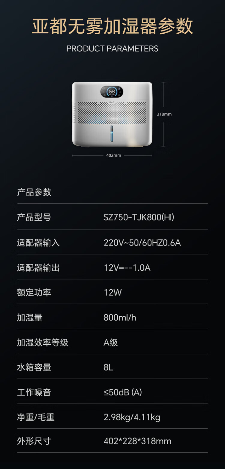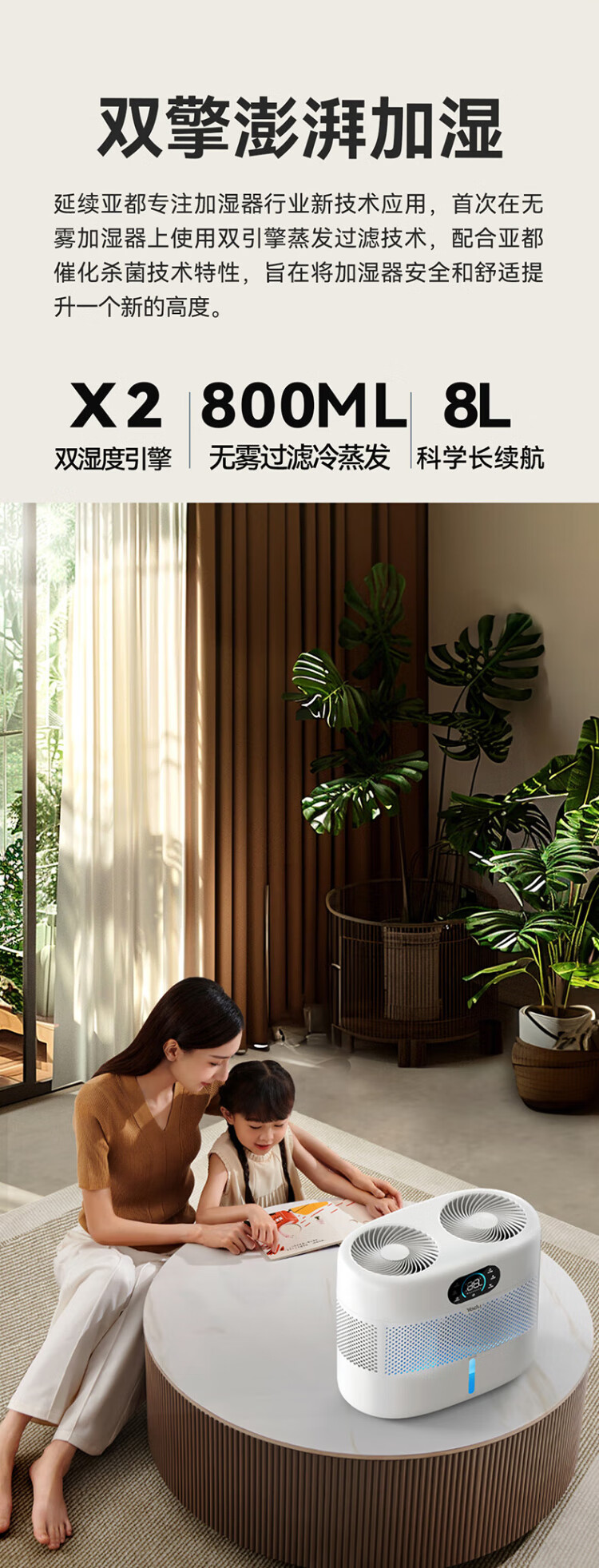 亚都(YADU)双擎无雾加湿器卧室母婴家用办公室蒸发式800ml/h空气净化大容量上加水空调伴侣SZ750-TJK800(Hi)