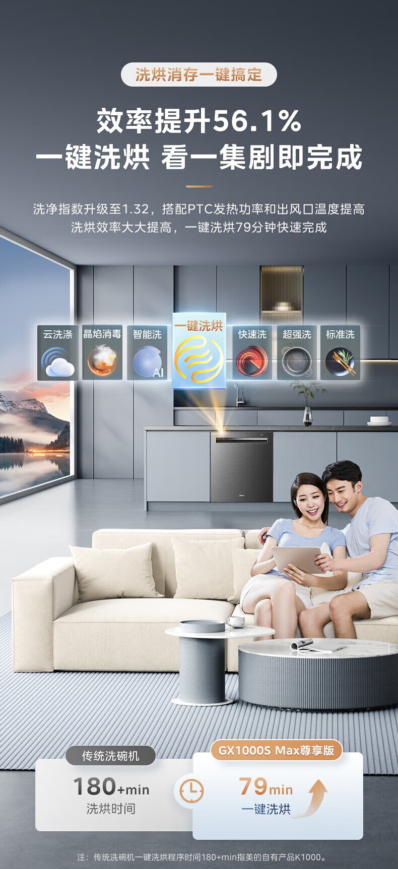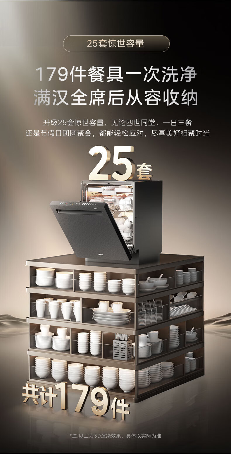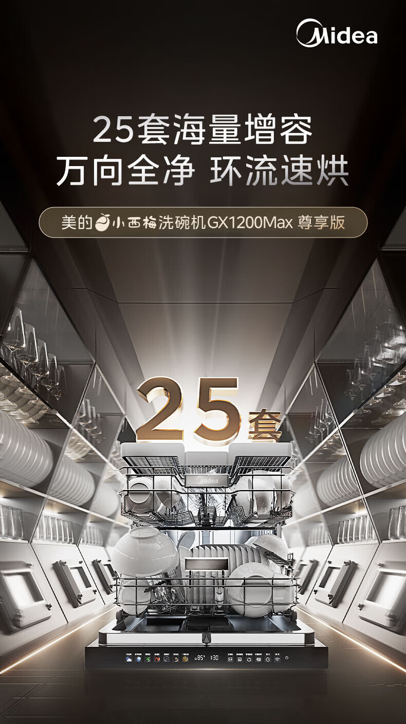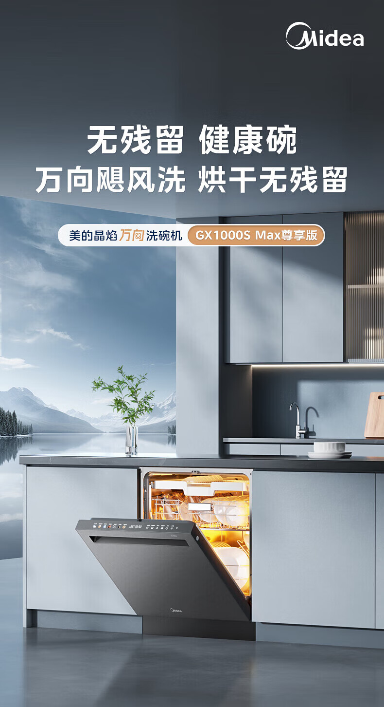 Midea Xiaoximei built-in crystal flame dishwasher, 25 sets of variable frequency large capacity, universal hurricane wash, intelligent five-arm hurricane wash, internal cycle drying and disinfection, 18 sets of intelligent investment GX1000SMax exclusive version