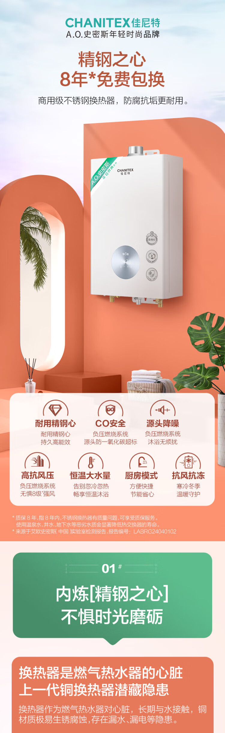 Smith (A.O.SMITH) Garnet 16-liter stainless steel gas water heater, national subsidy, stainless steel heat exchanger package for 8 years, constant temperature, large water volume, wind resistance and anti-freeze JSQ31-TC1