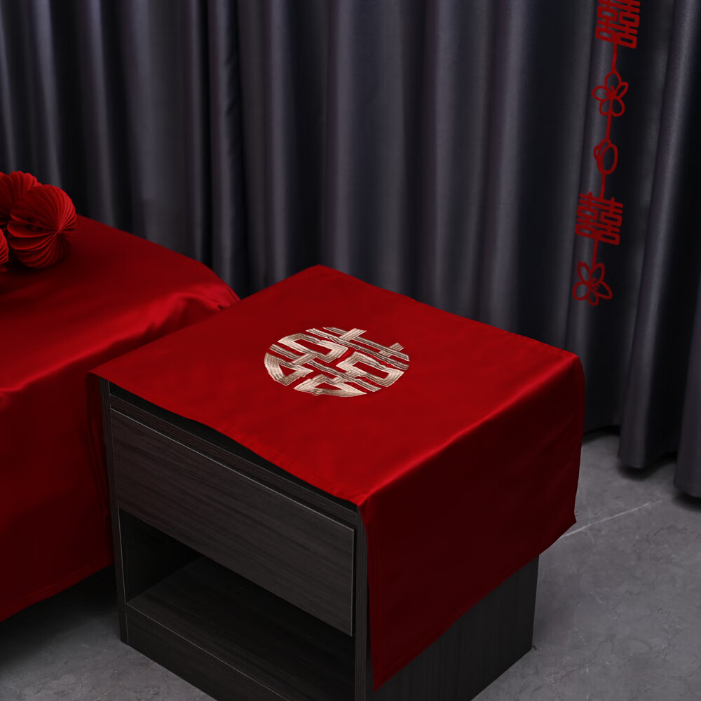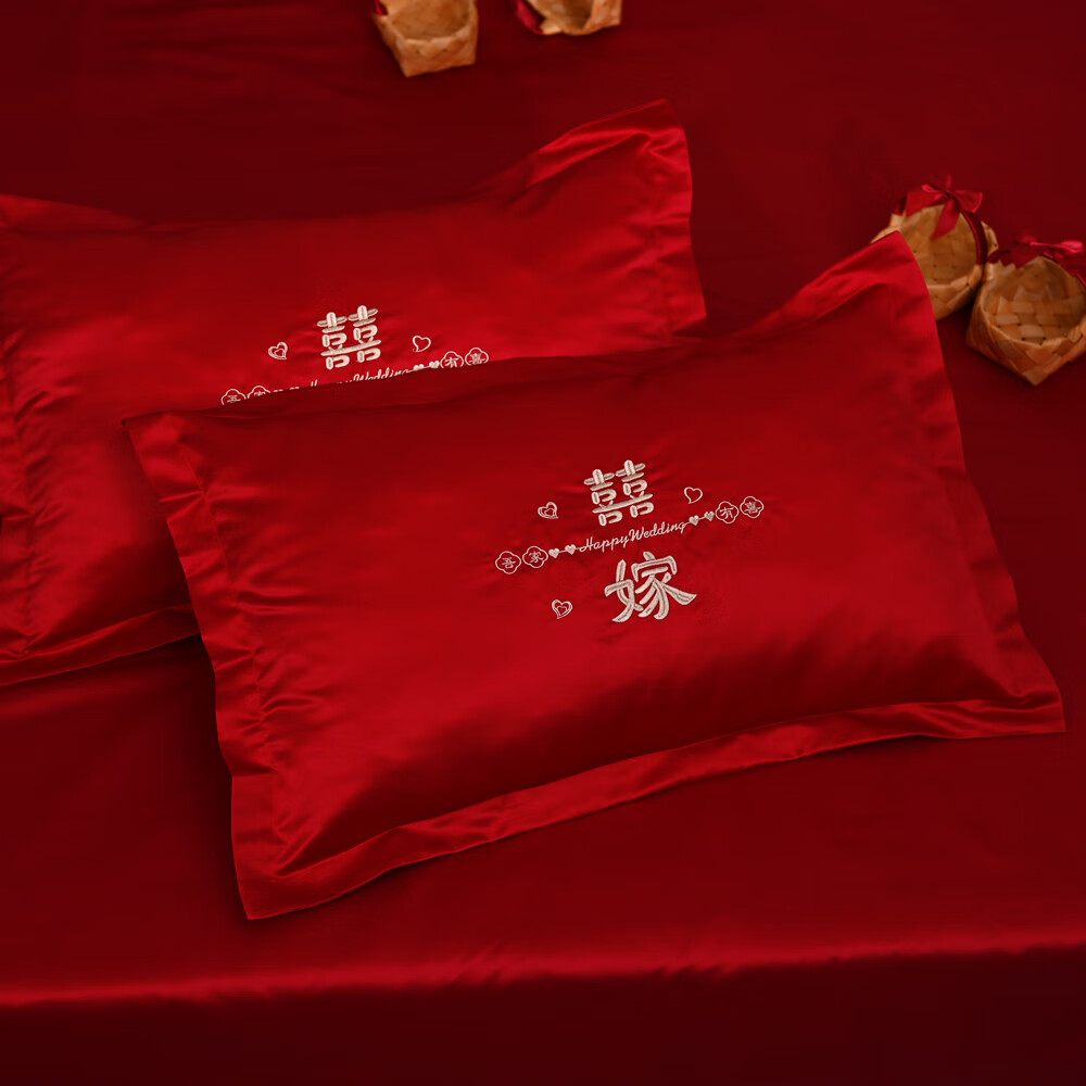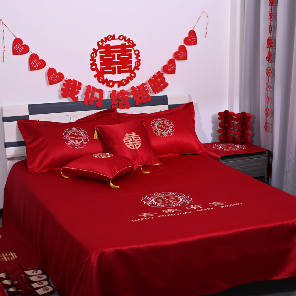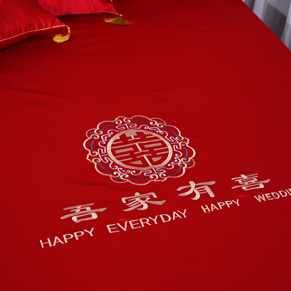 Wedding celebration bedding three-piece set for the bride, bright red wedding quilt sheets, simple Chinese embroidery double happiness, bedside table single, My Family is Happy 1.5*2 meters/1.8*2 meters