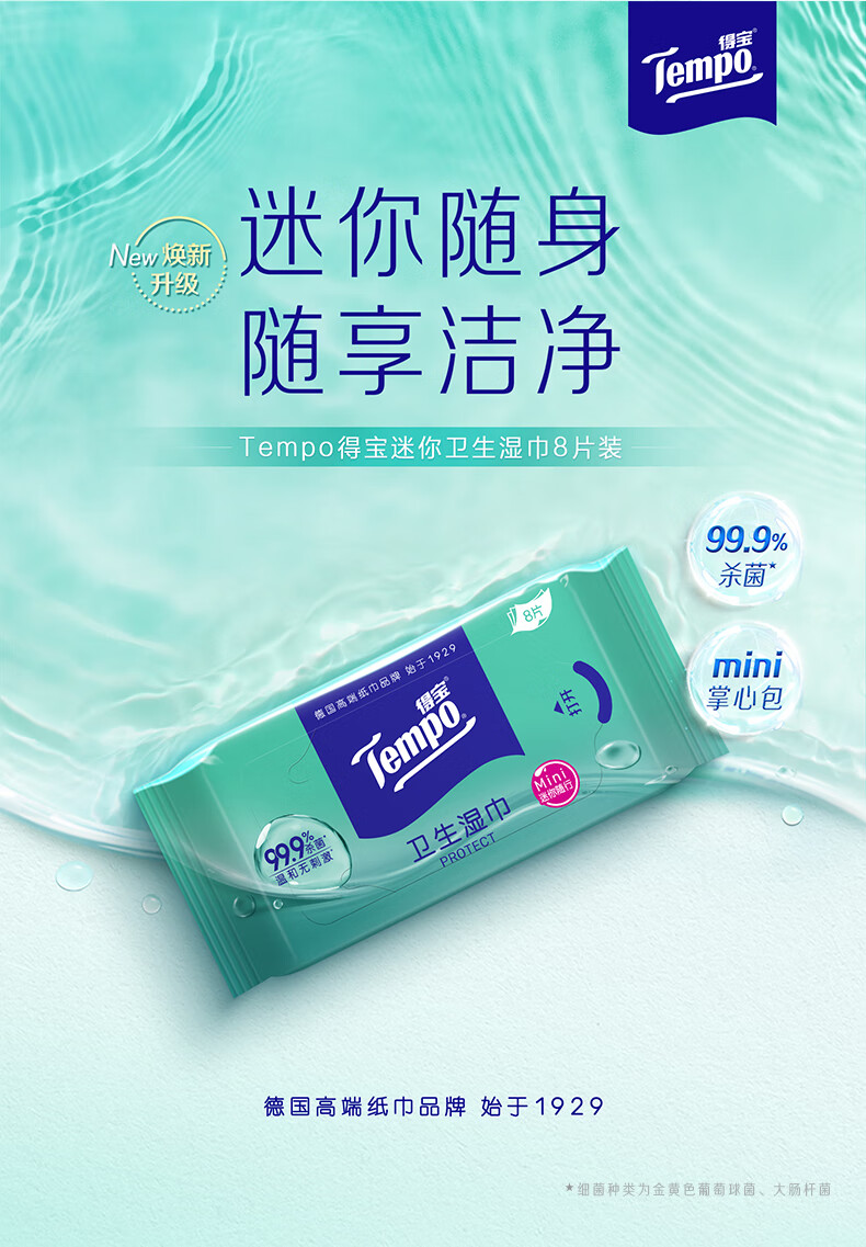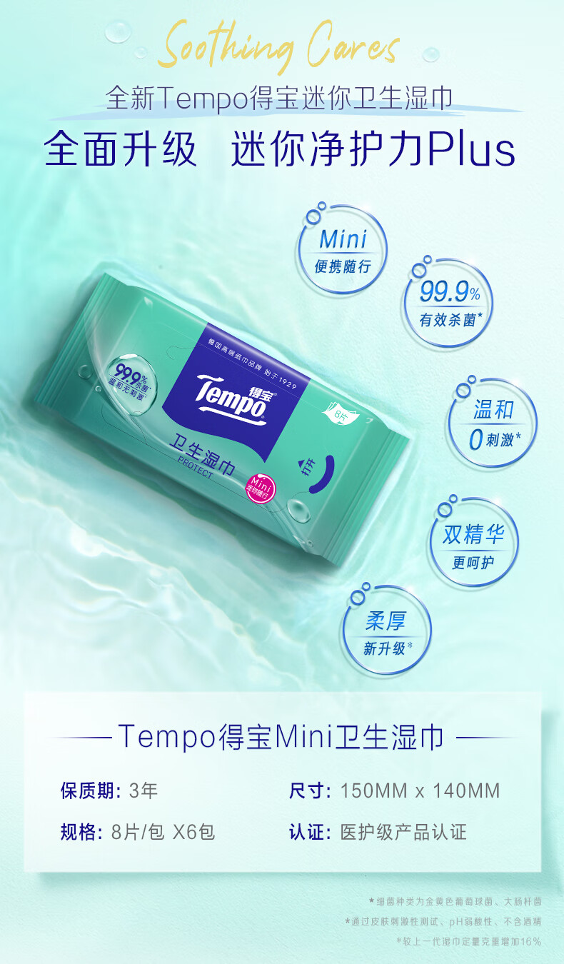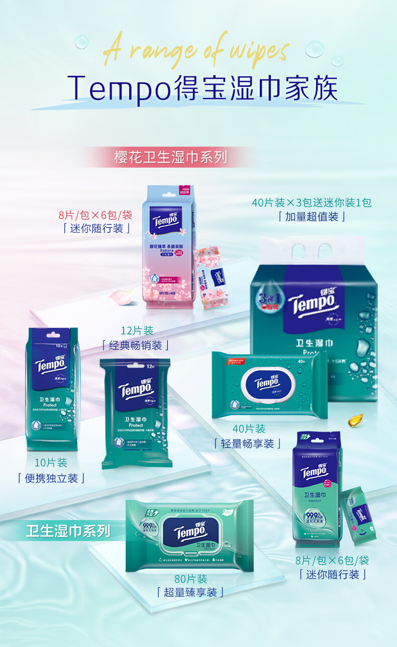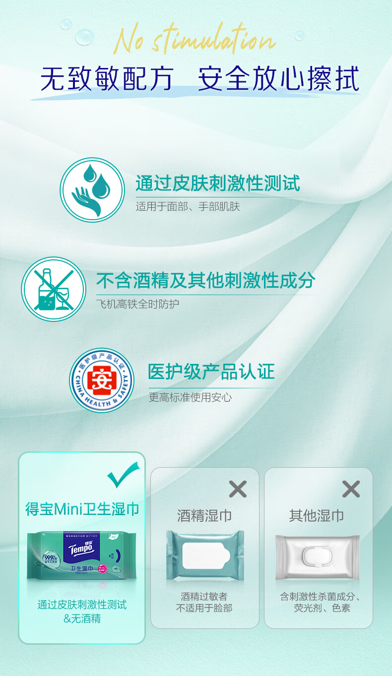 TEMPO germicidal wipes 8 pieces*6 packs mini wipes sterilization rate 99.9% mild and non-irritating wet wipes small pack 8 pieces*6 packs