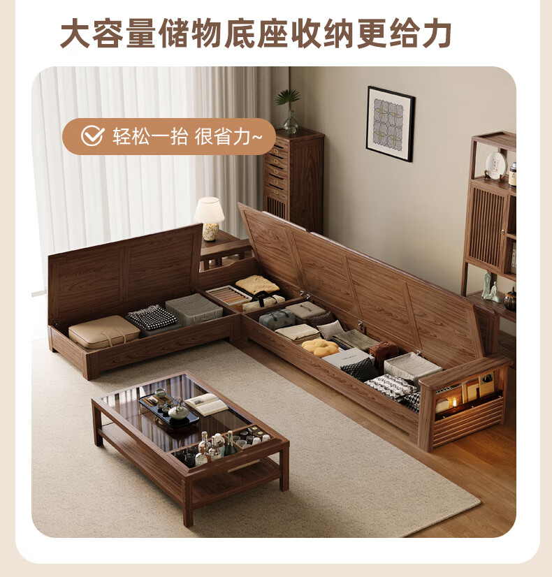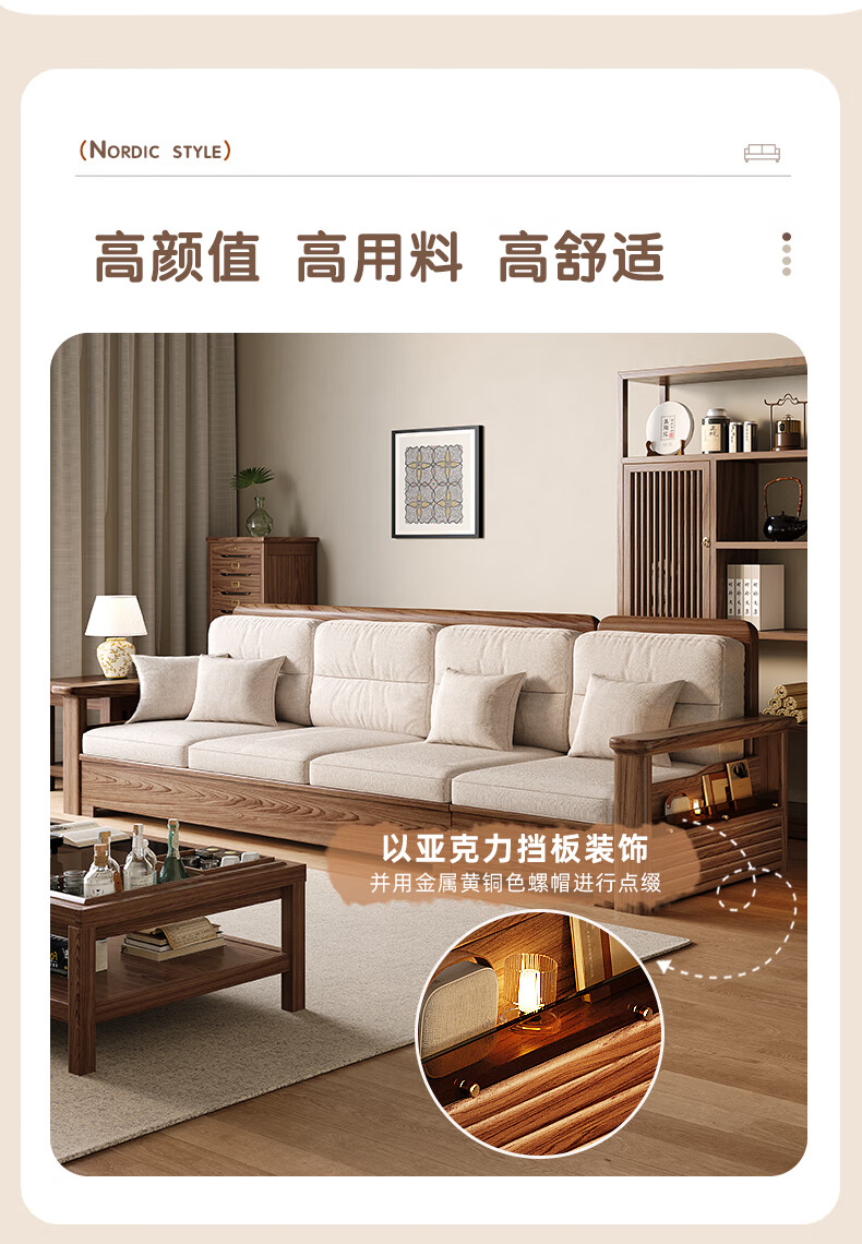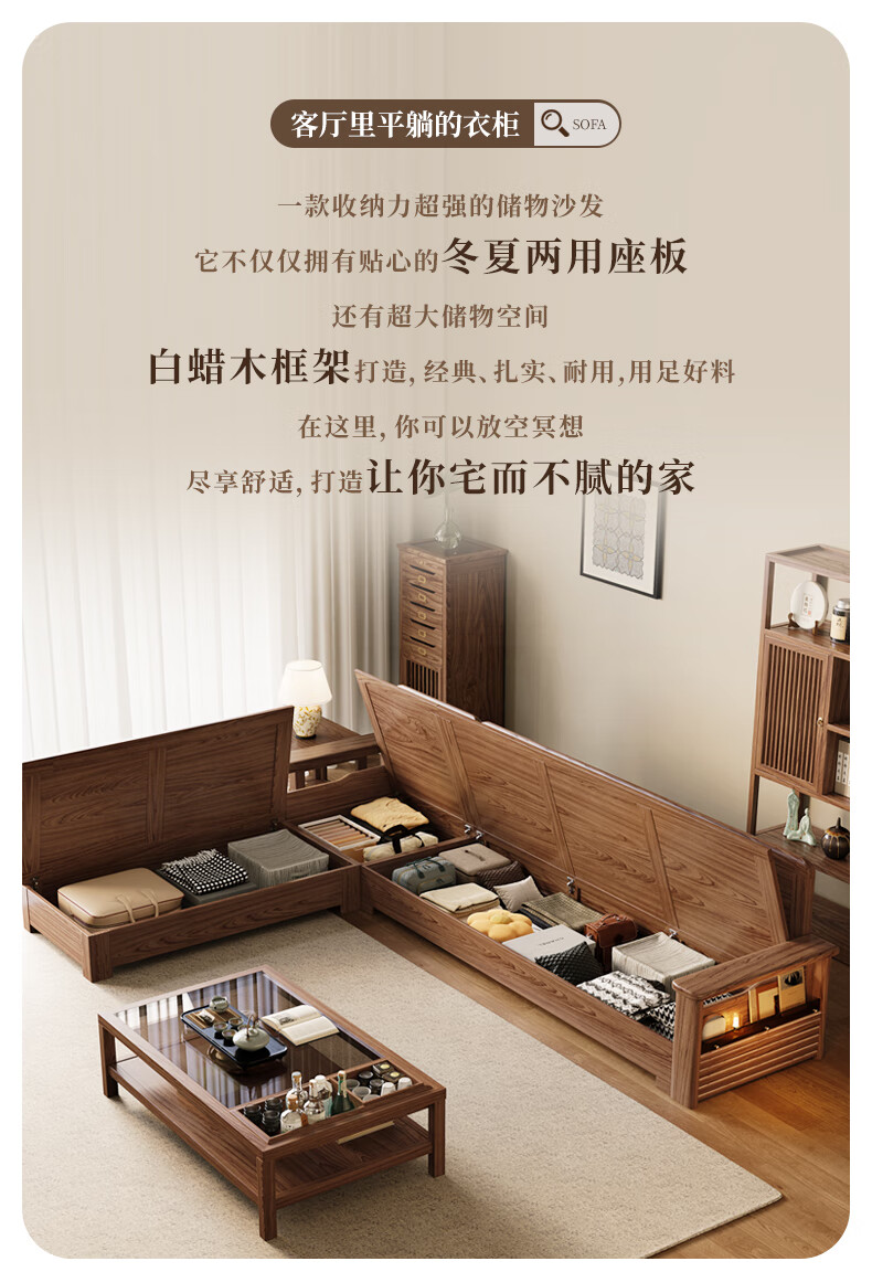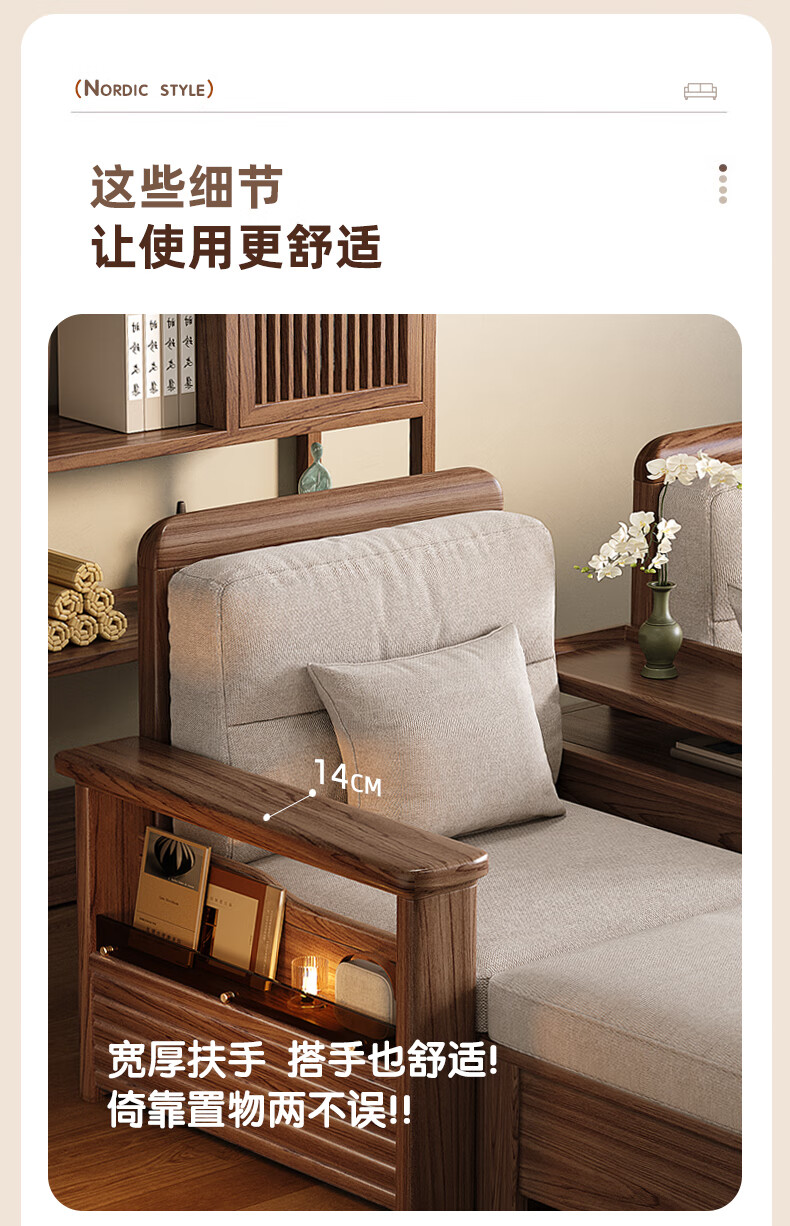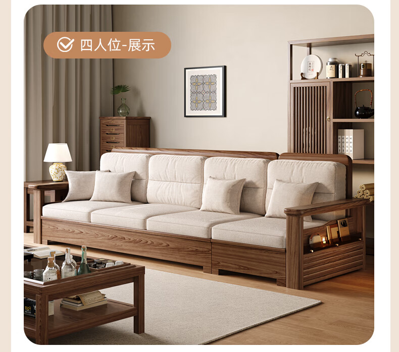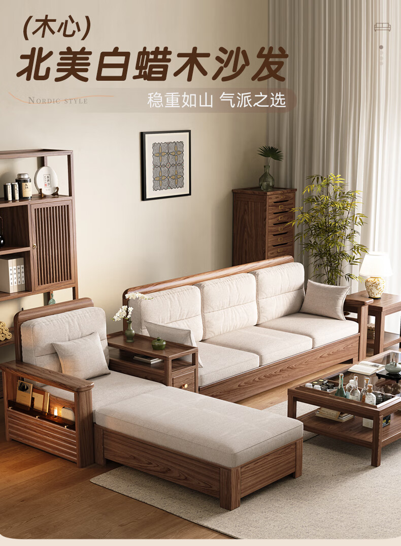 Small wooden nest sofa, mid-century style ash solid wood sofa, simple home living room combination, winter and summer dual-use small apartment furniture, straight row of four people (2+2), high box storage