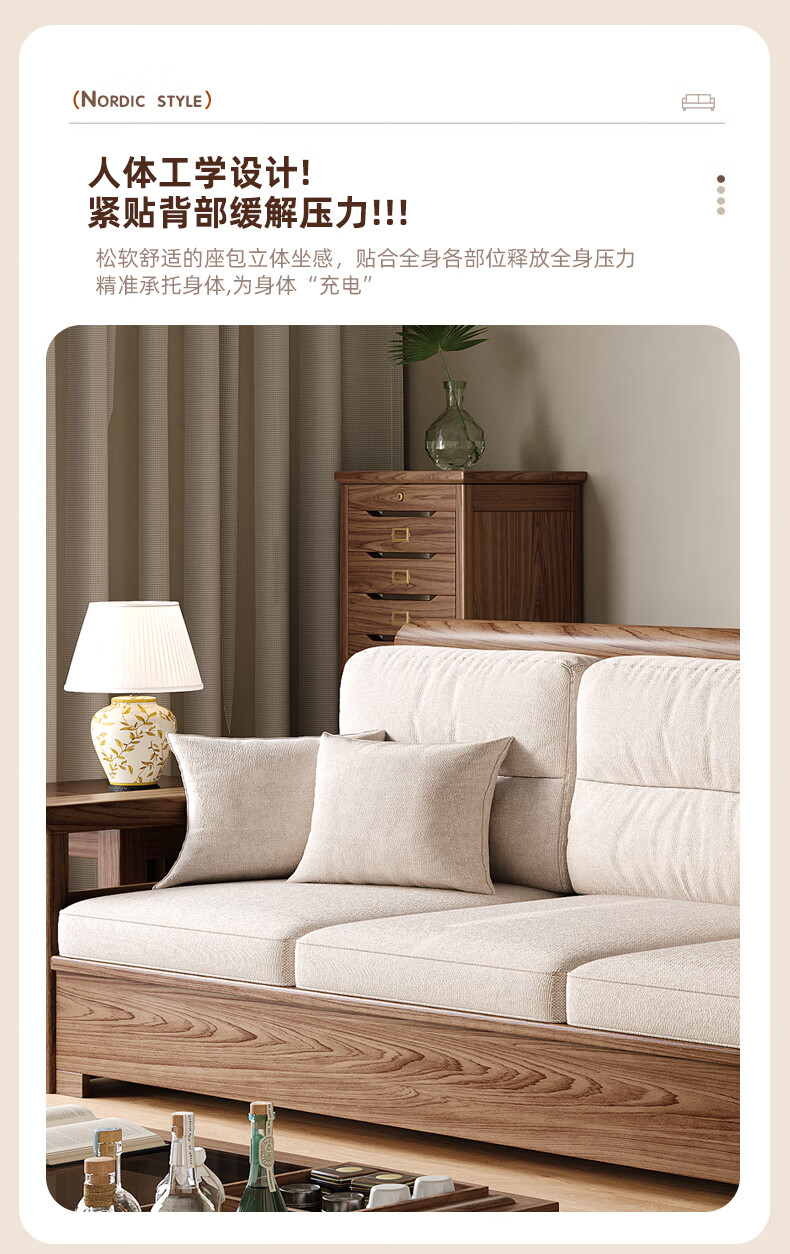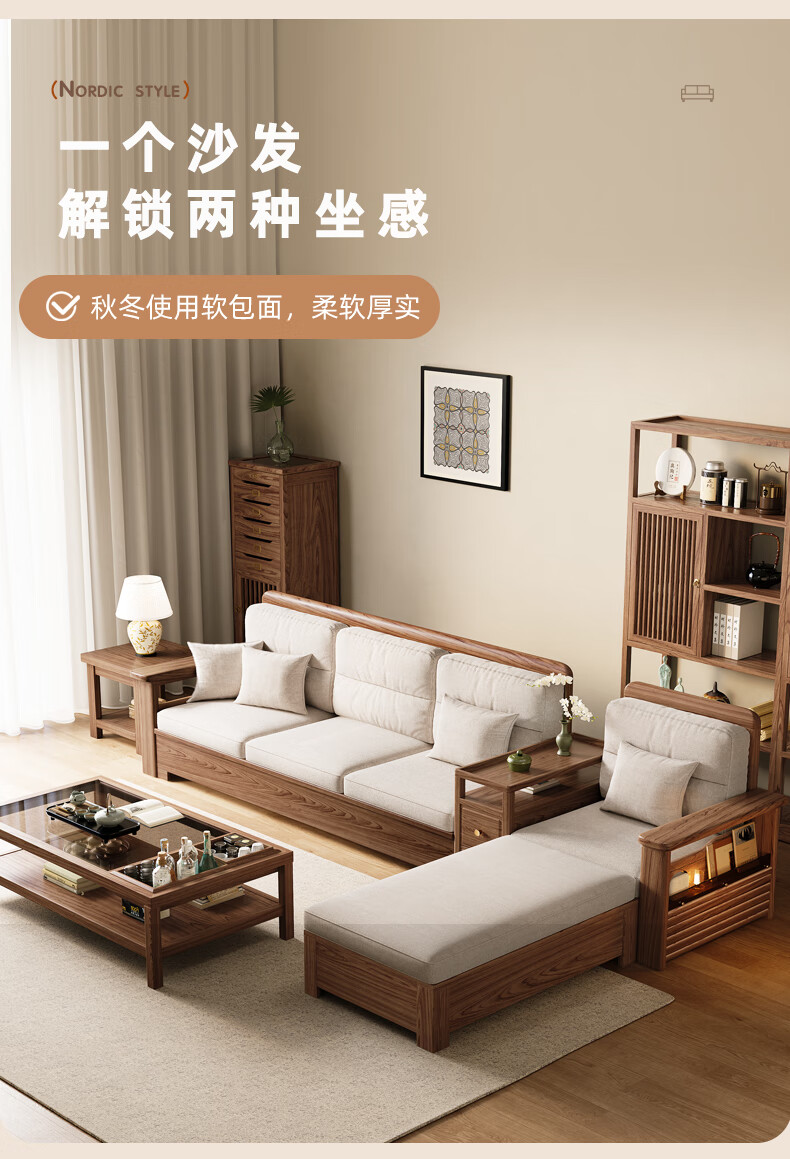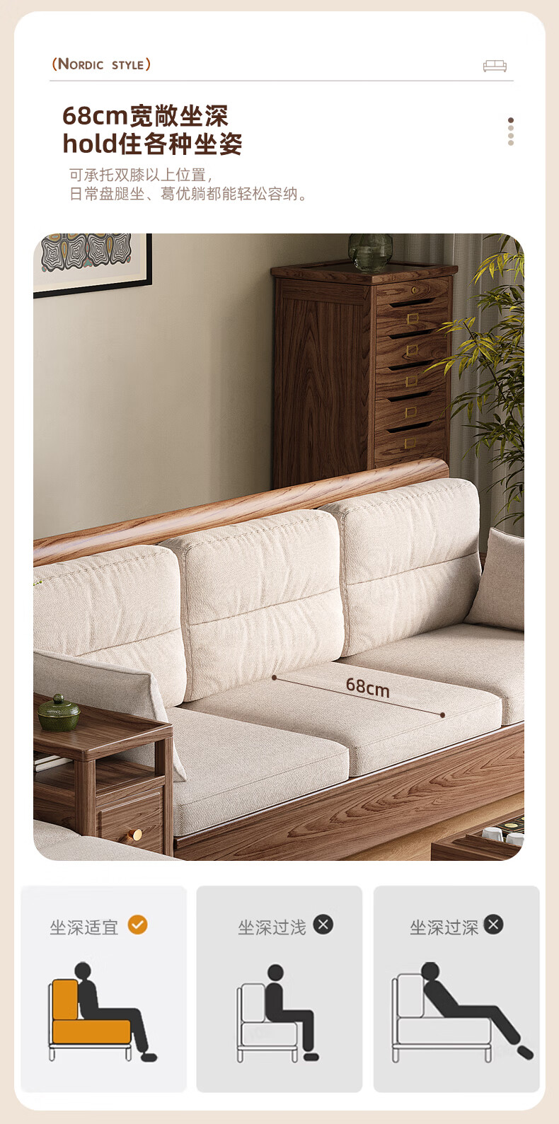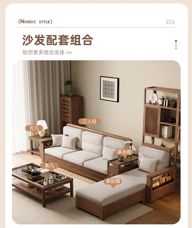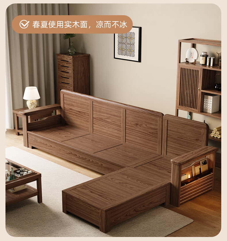 Small wooden nest sofa, mid-century style ash solid wood sofa, simple home living room combination, winter and summer dual-use small apartment furniture, straight row of four people (2+2), high box storage