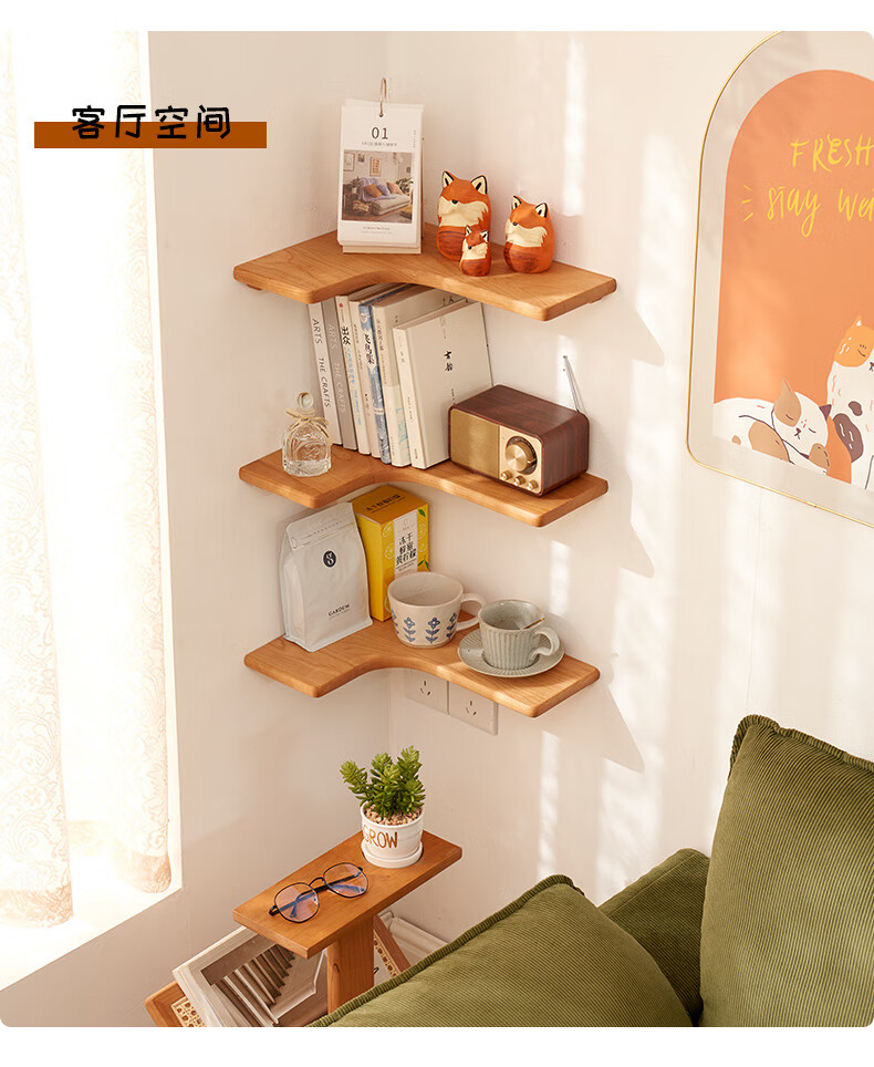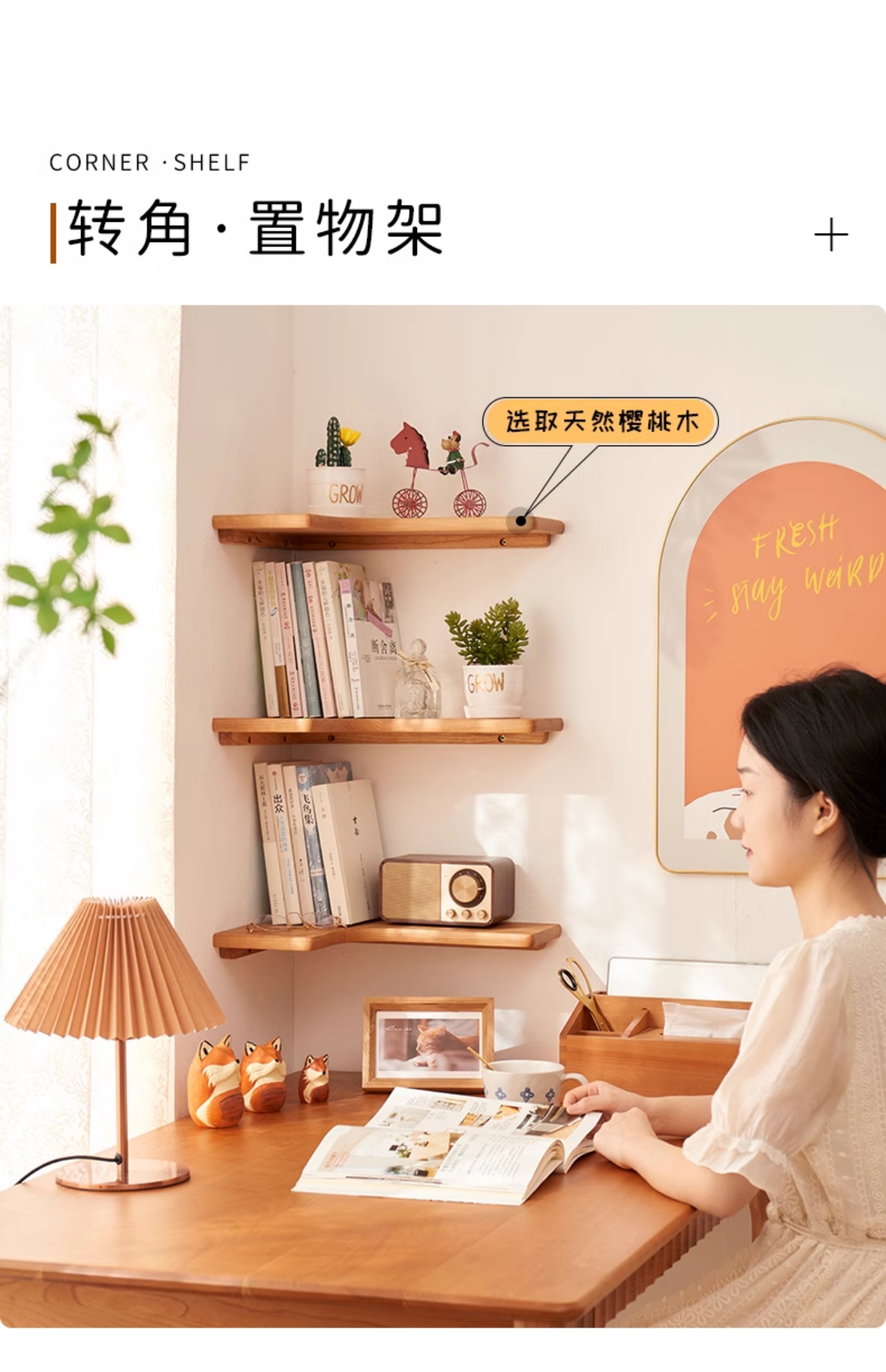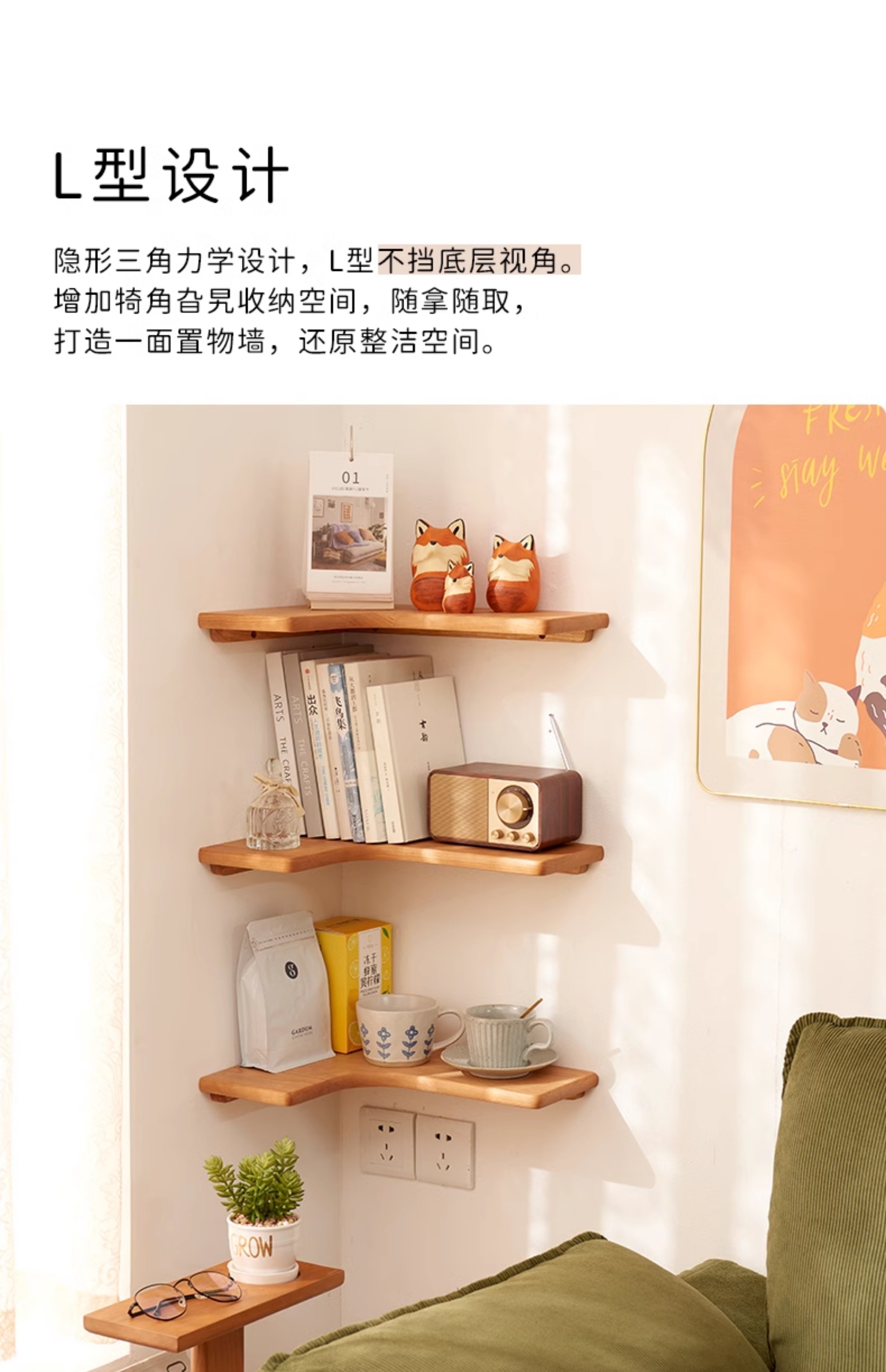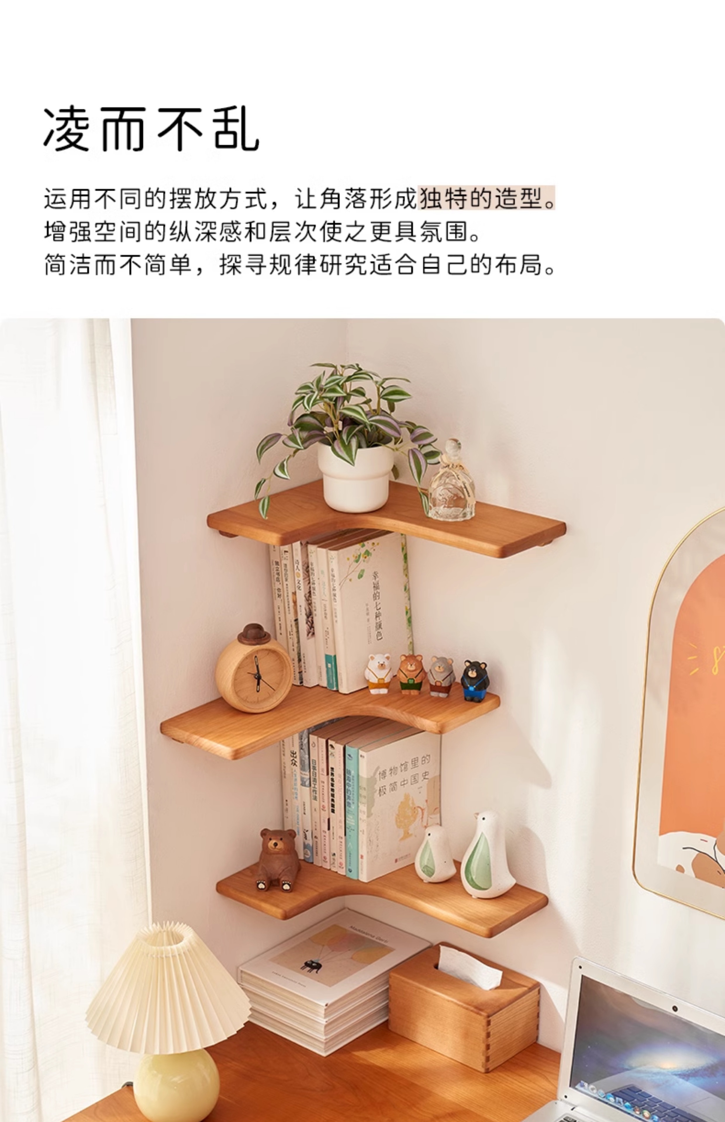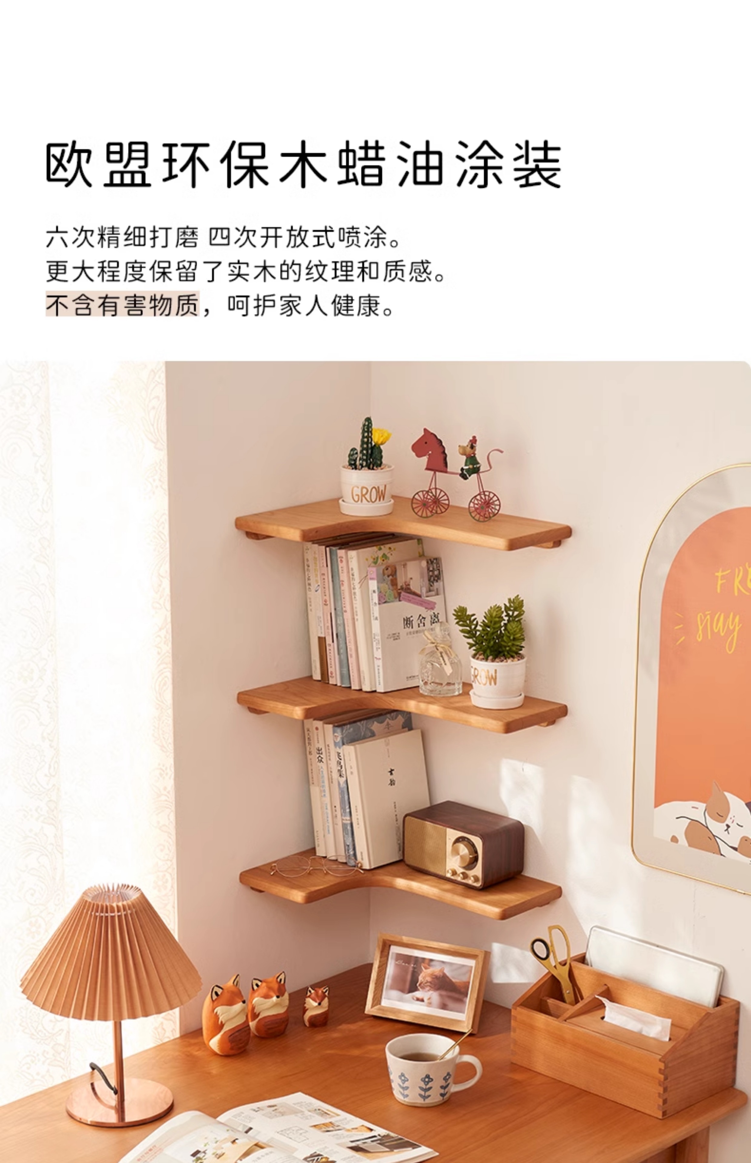 Zhixinmuwang solid wood corner shelf storage rack cherry wood punch-free bedroom corner shelf study wall tripod bookshelf corner shelf short left and long right, single layer, 390mm