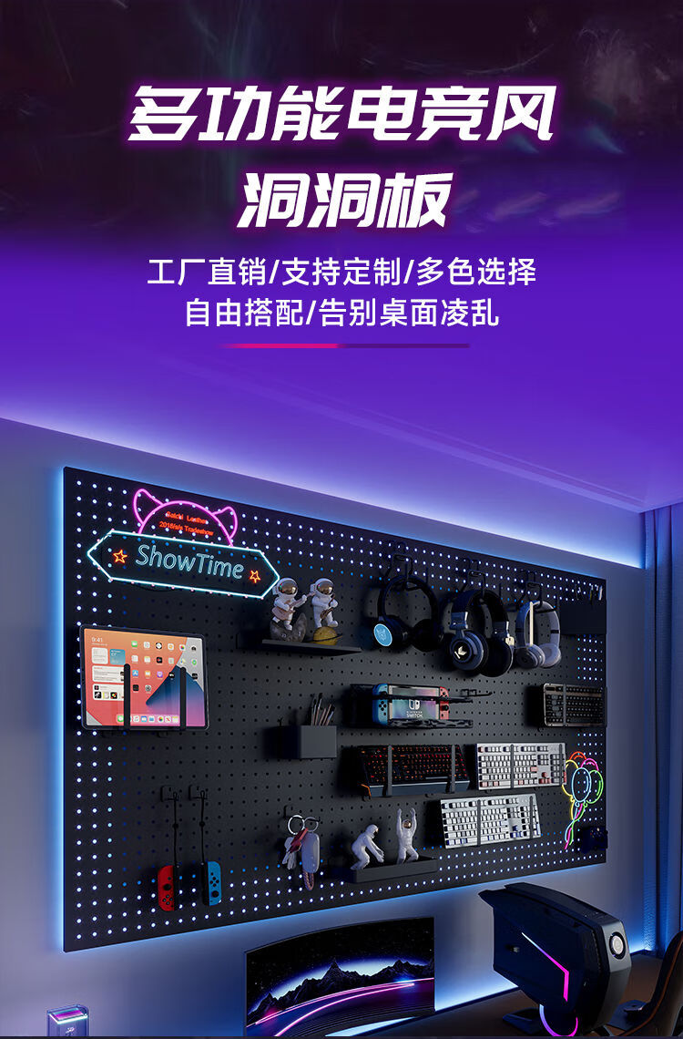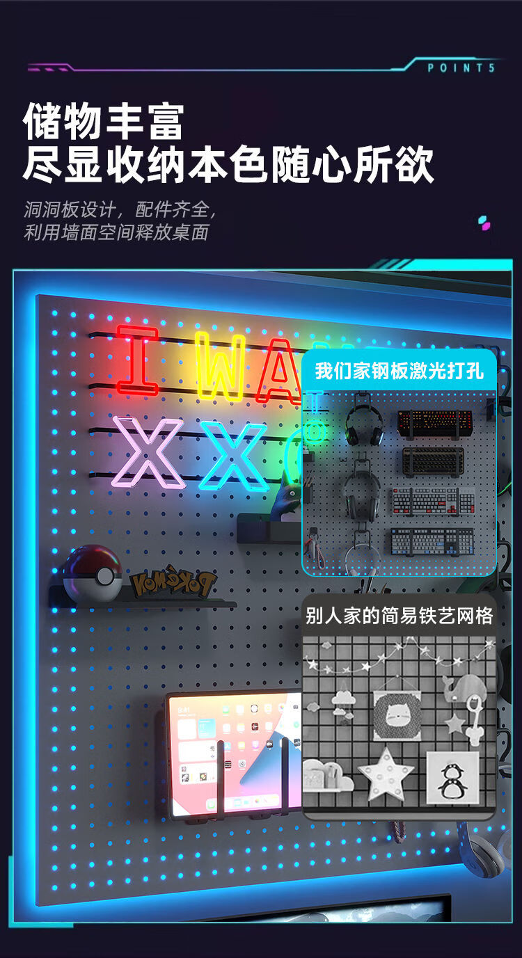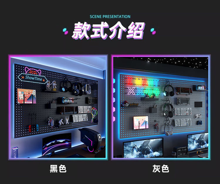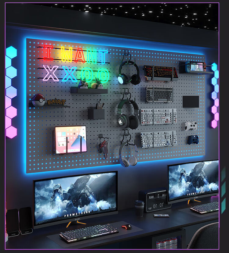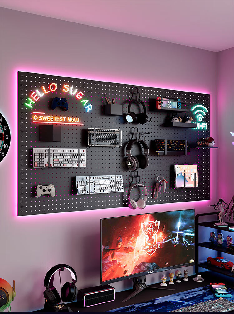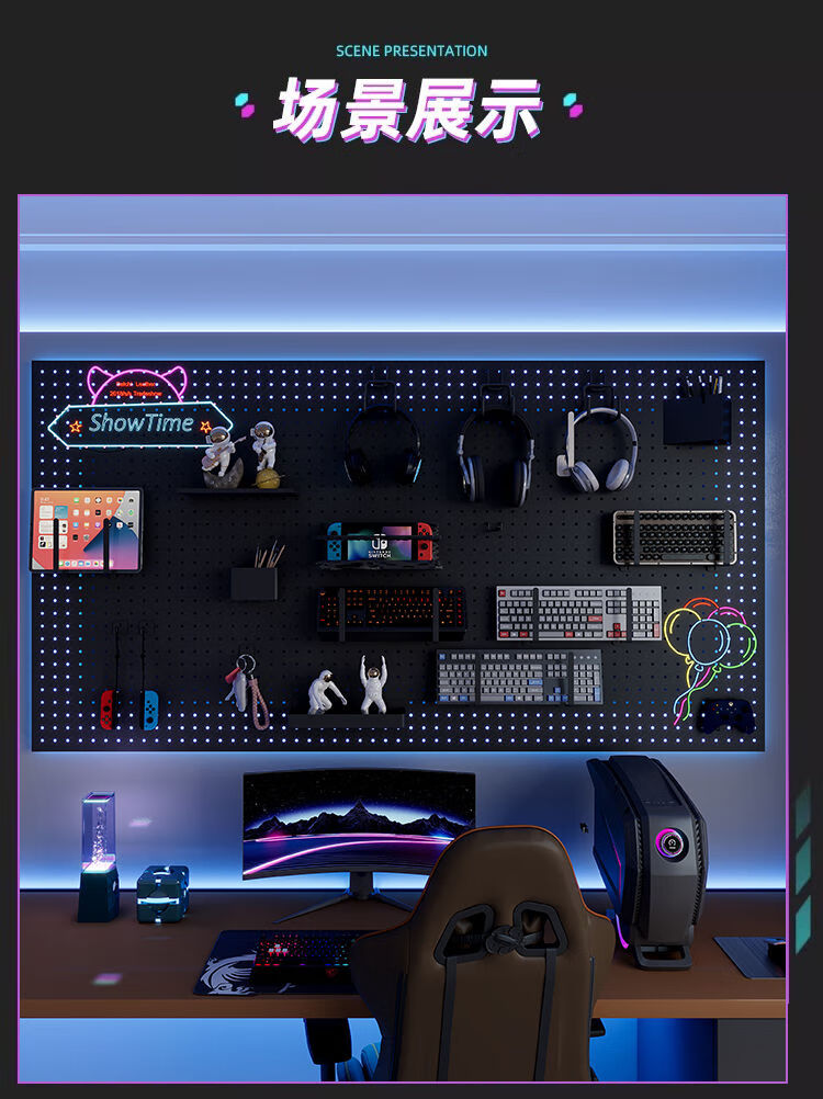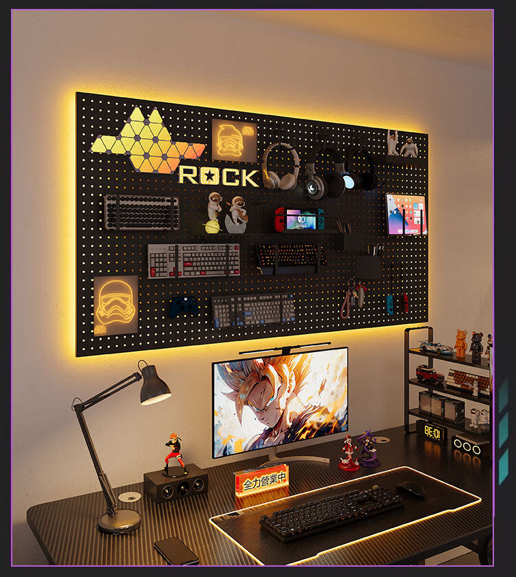 Shantou Lincun e-sports room metal hole plate storage rack wall computer desk wall storage atmosphere light with decorative display rack RGB atmosphere light matte black 5080c set