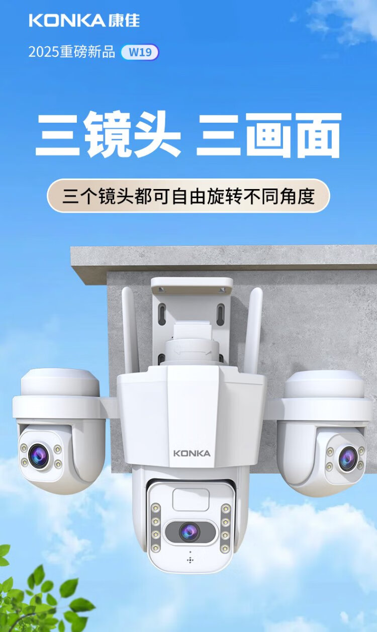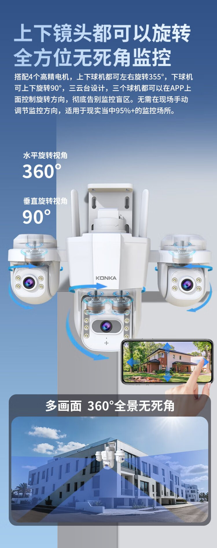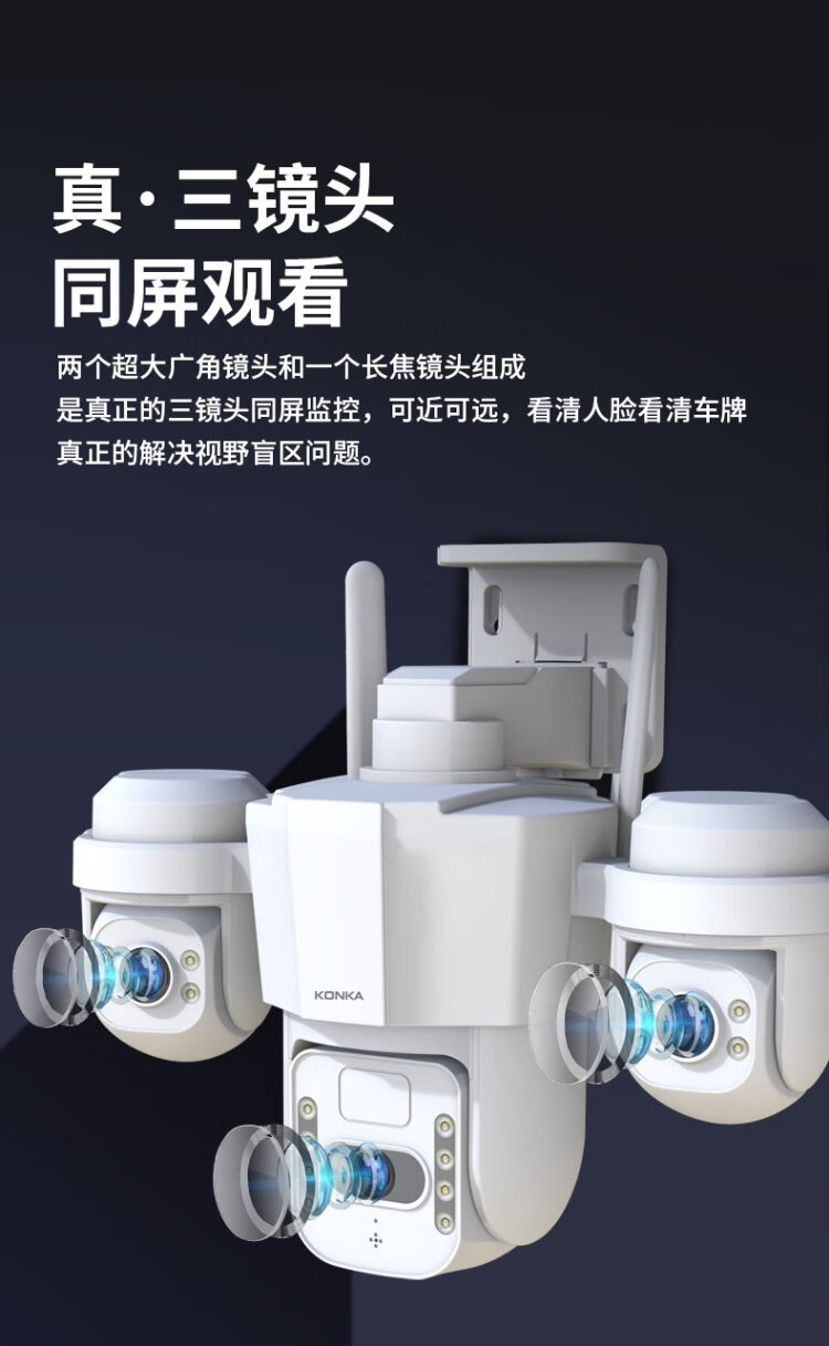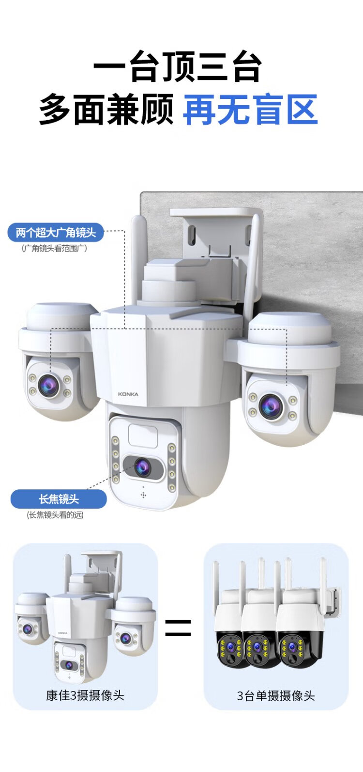 Konka three-camera 15 million surveillance camera room outdoor home mobile phone remote high-definition wireless needs to be connected to wifi plug-in monitor 360 degrees no blind spots with night vision panoramic rural