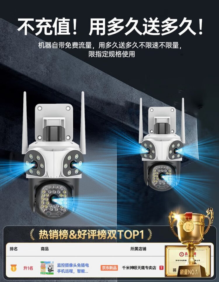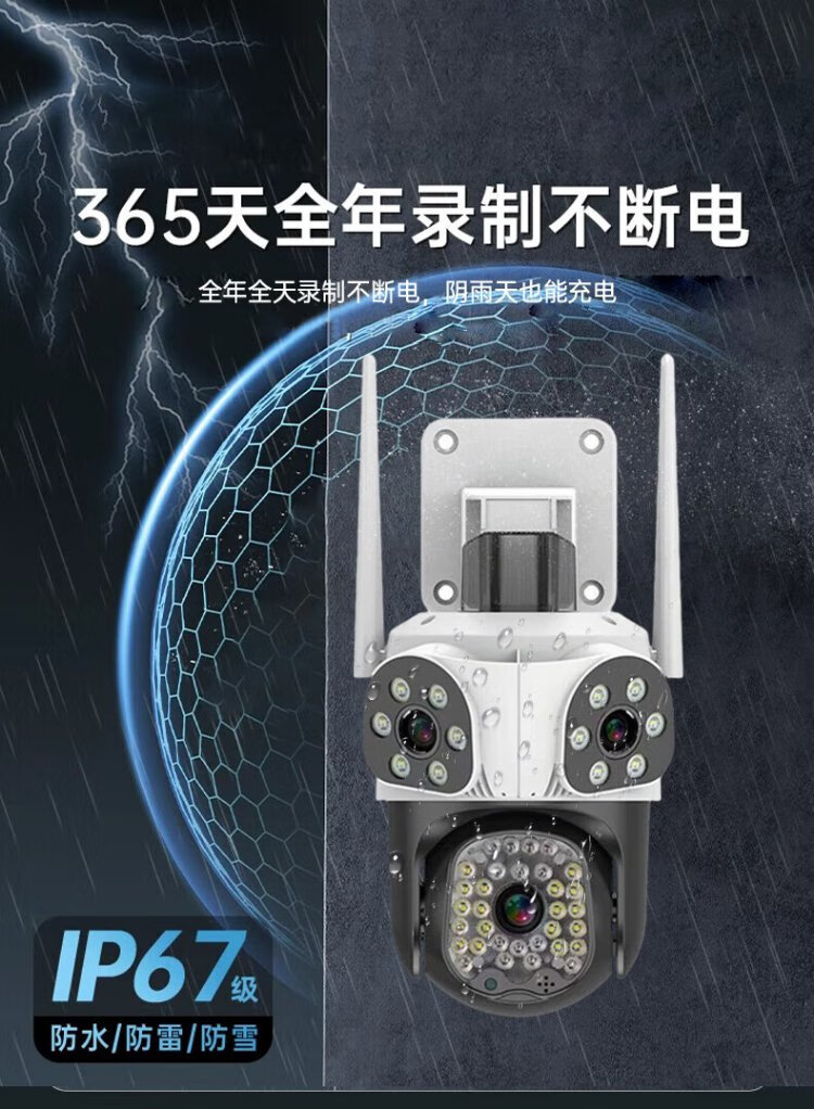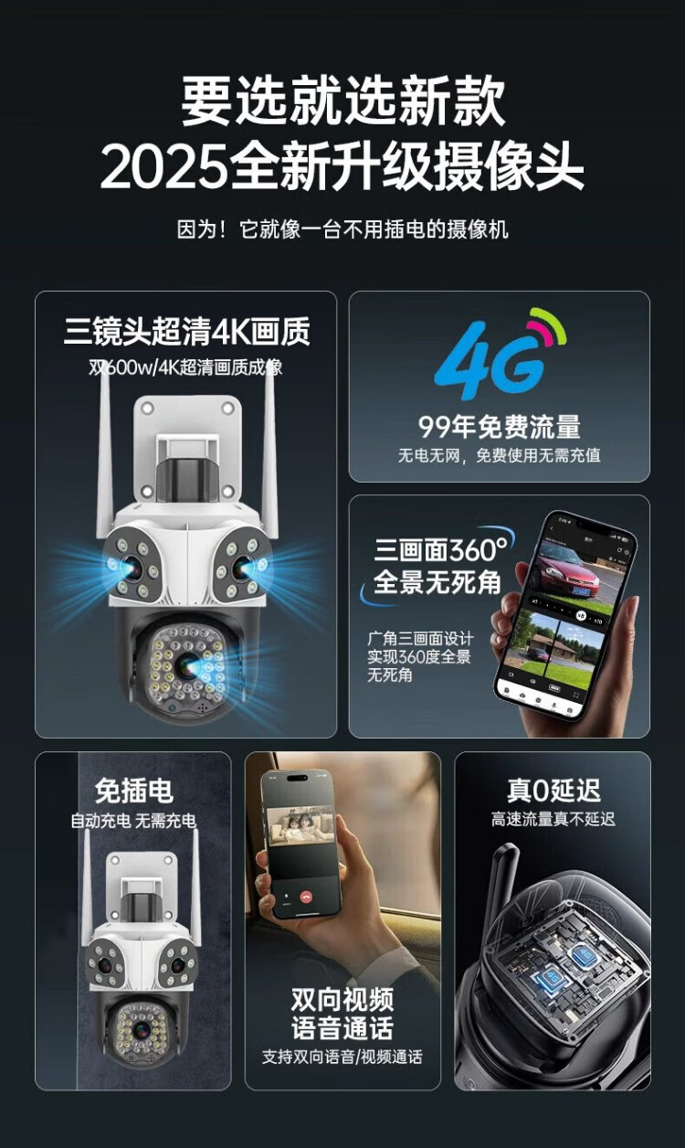 Thousand-meter divine eye, lifetime free traffic, 4G high-definition camera, 360-degree panoramic view without blind spots, mobile phone wireless remote monitor, home voice conversation room, outdoor three-lens, free traffic for 99 years, four-screen + 12x electronic zoom + ten-year warranty, full-color night vision + voice intercom