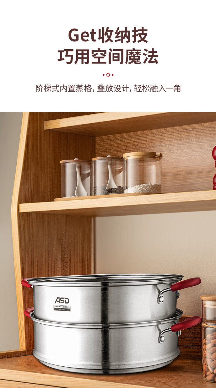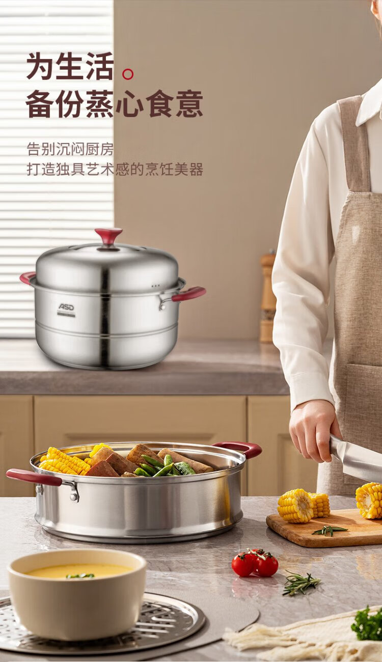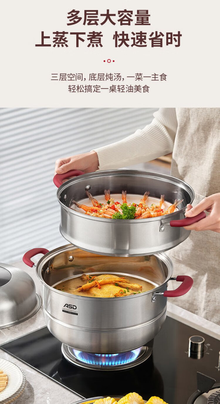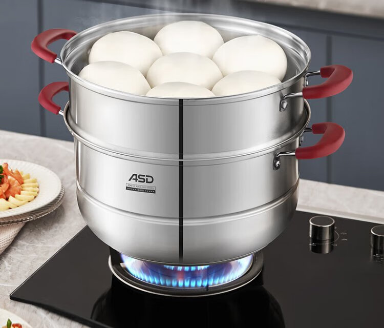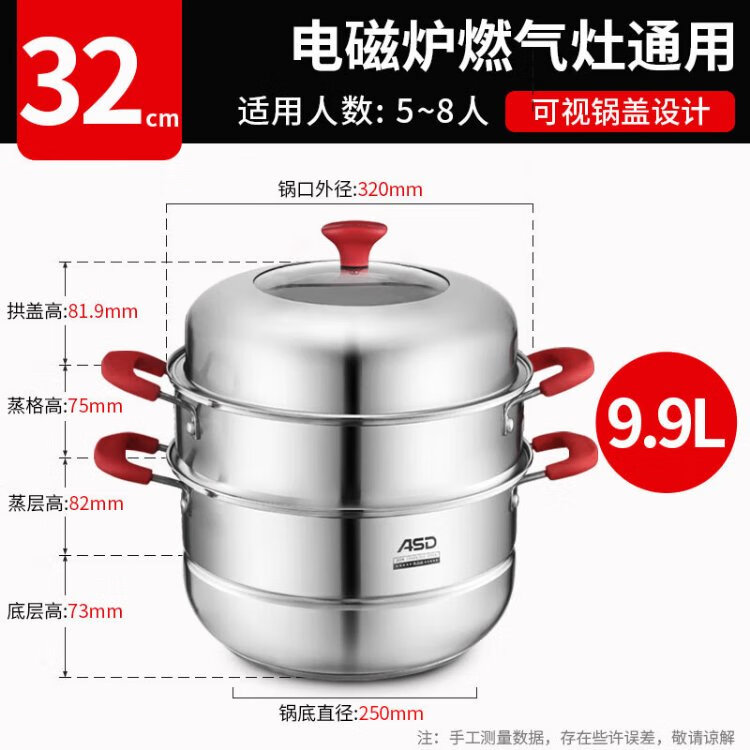 ASD steamer 304 stainless steel double-layer steamer household high arch lid soup pot 32CM steamer induction cooker gas universal C1