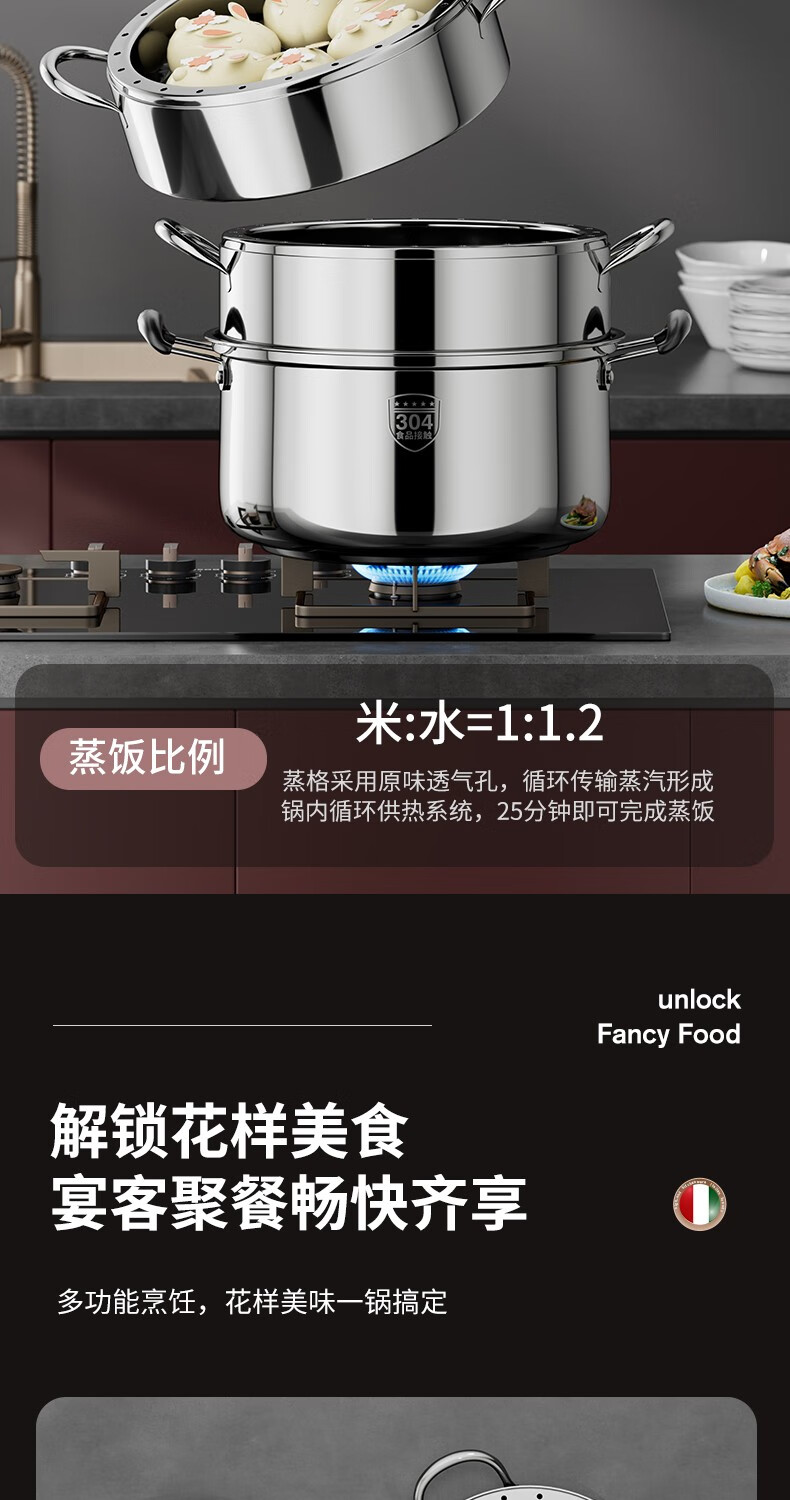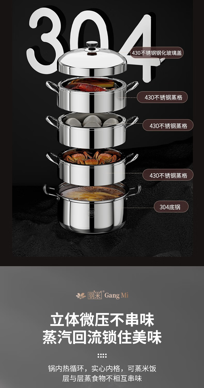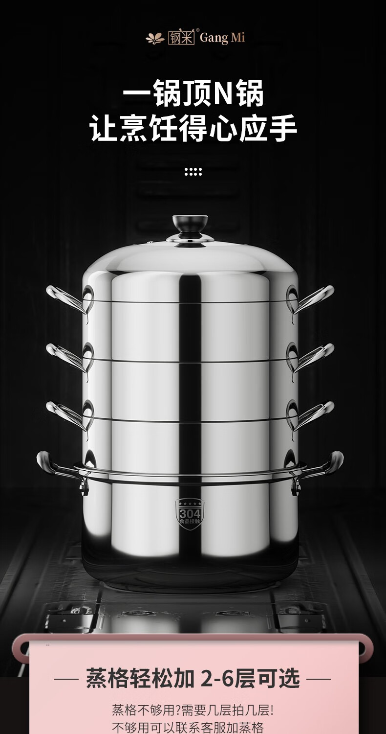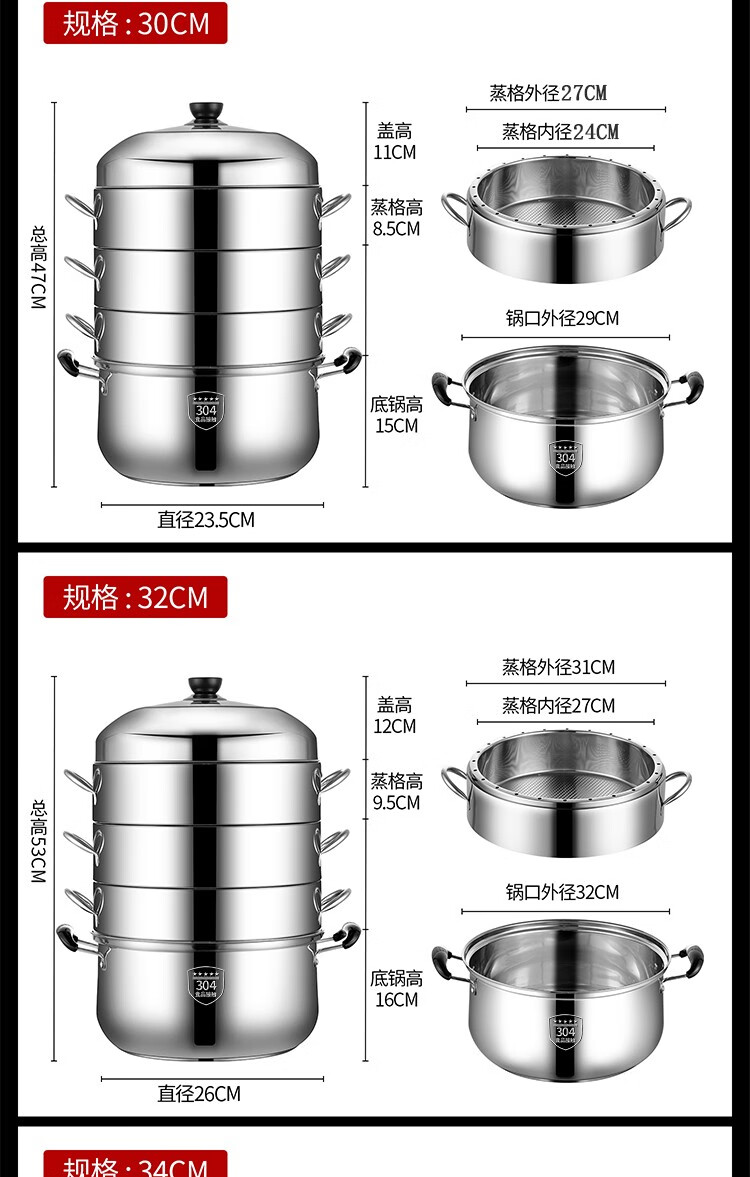 Steel rice 304 stainless steel non-porous steamer household non-odor steamer energy-saving original rice steamer multi-layer thickened basket (one pot, one lid, three steamers) 32CM thickened flagship model