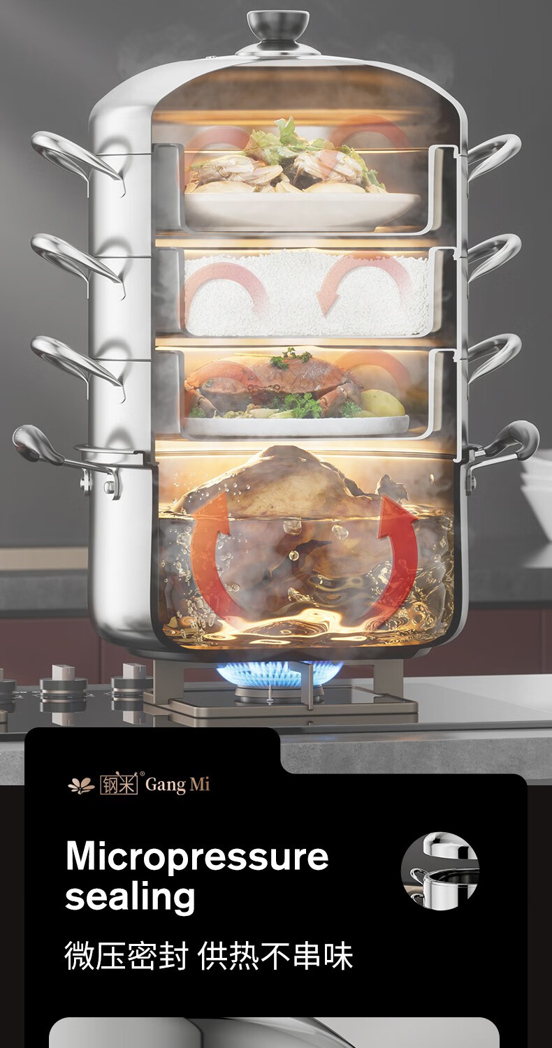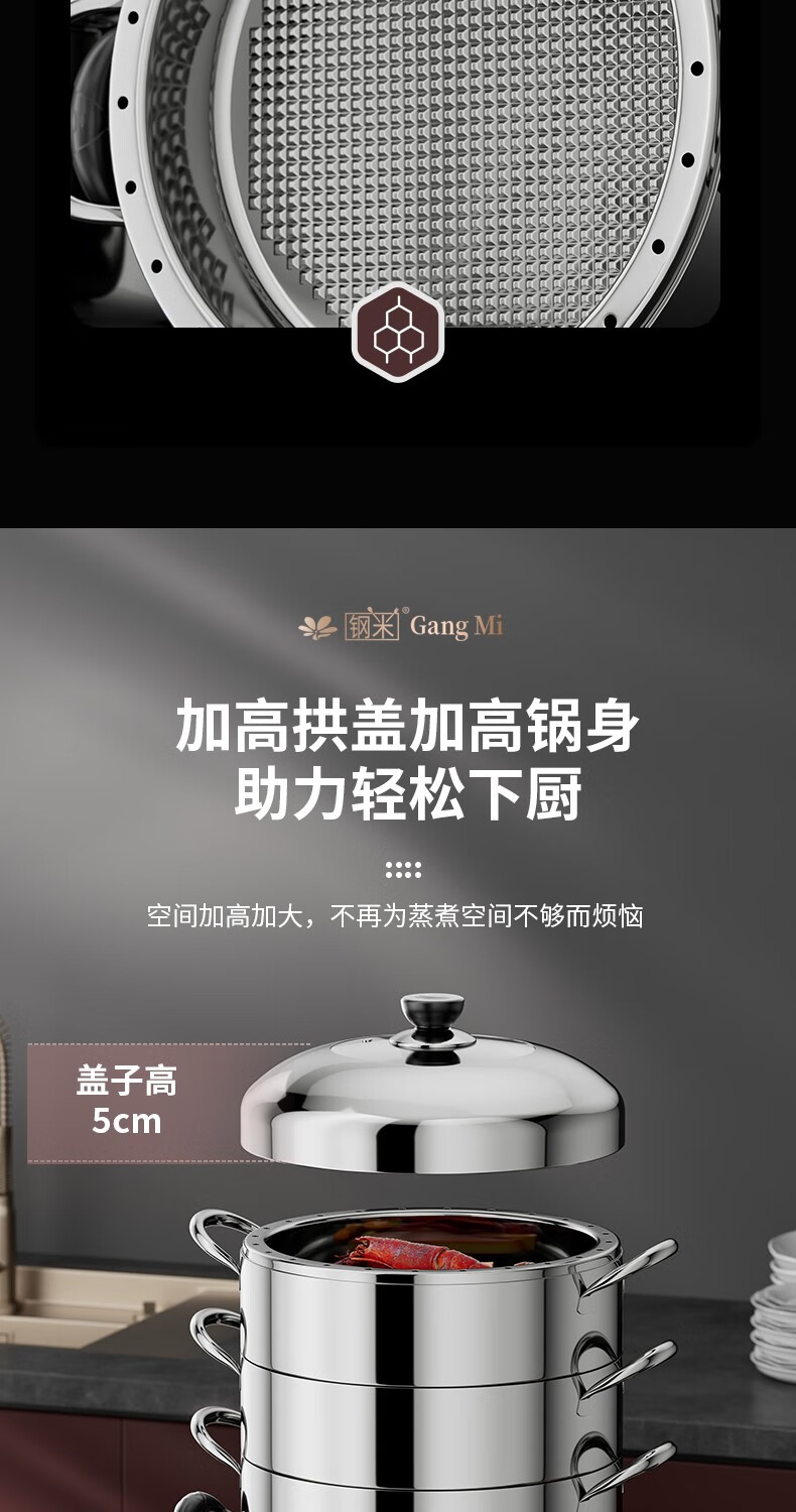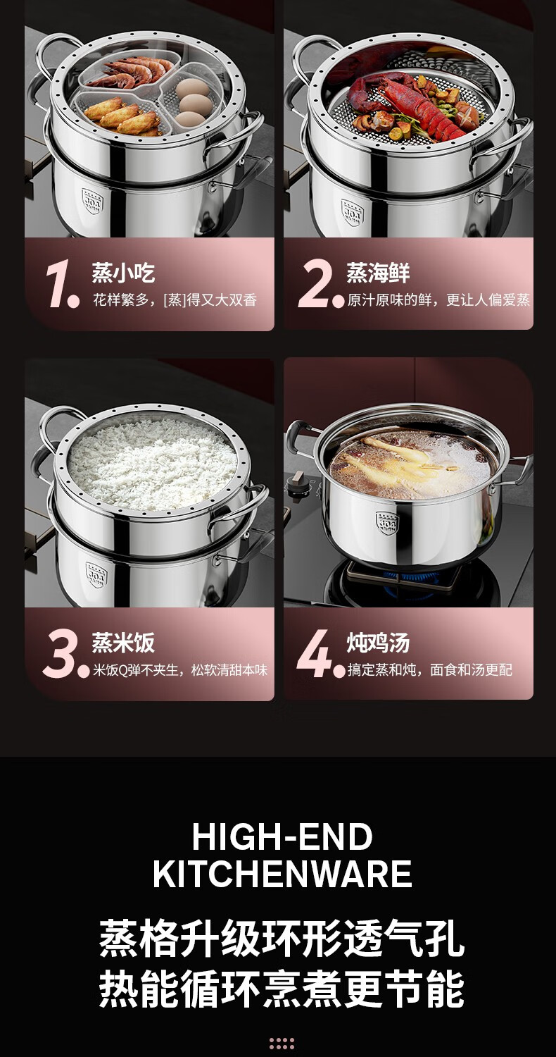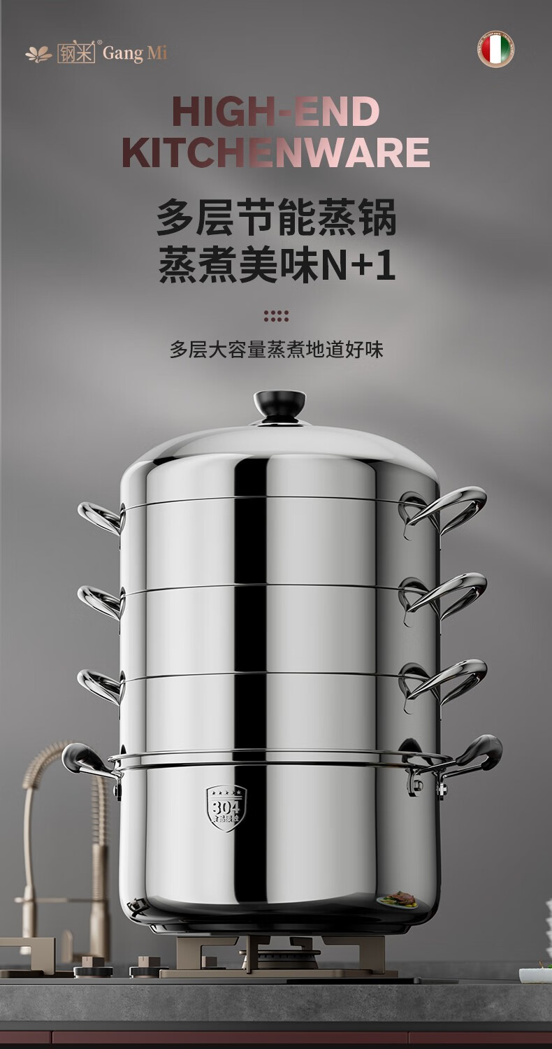 Steel rice 304 stainless steel non-porous steamer household non-odor steamer energy-saving original rice steamer multi-layer thickened basket (one pot, one lid, three steamers) 32CM thickened flagship model