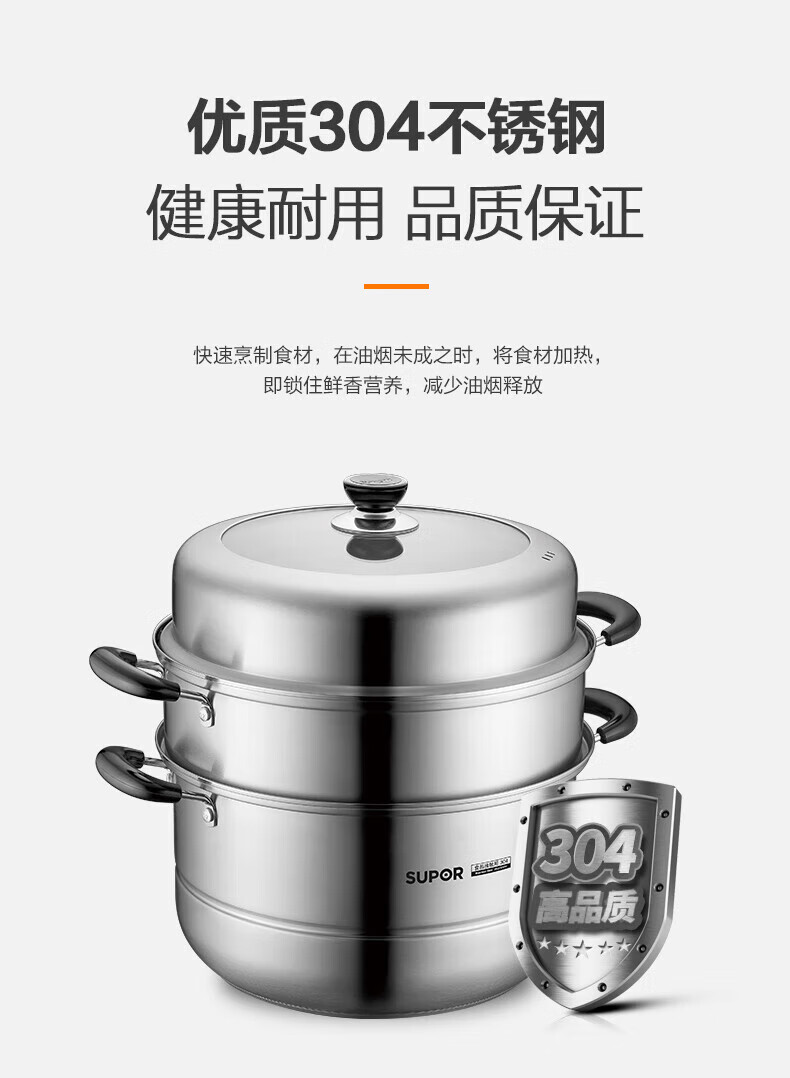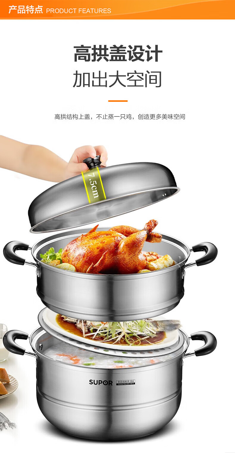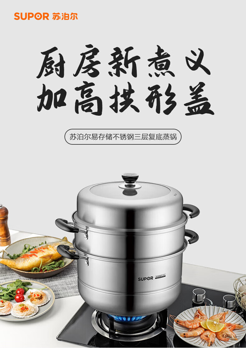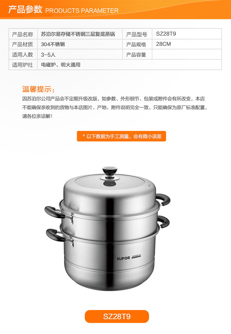 SUPOR steamer 304 stainless steel steamer three-layer multi-bottom steamer steamer easy storage gas induction cooker universal SZ28T9 supermarket same style 28cm