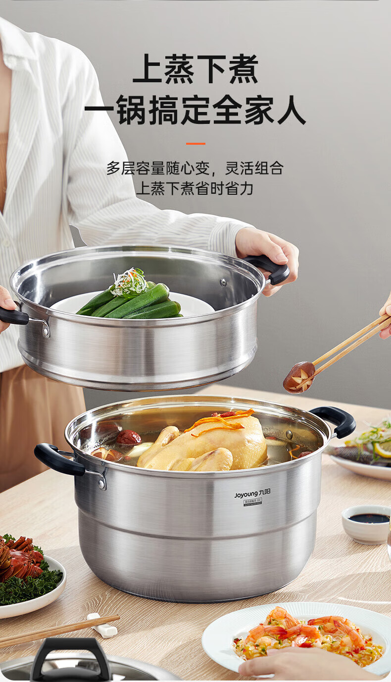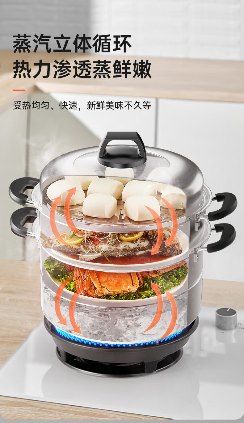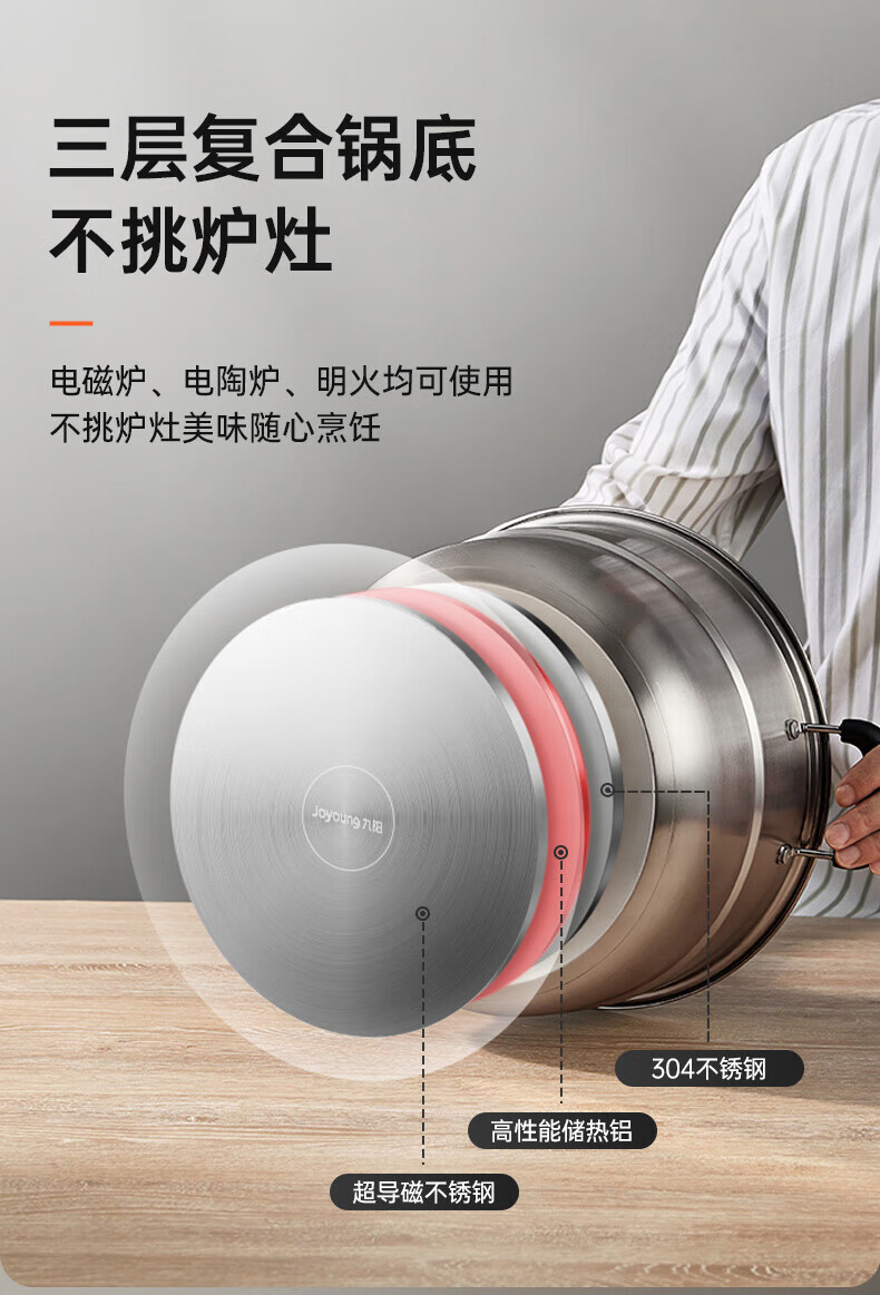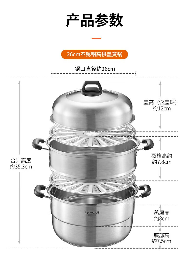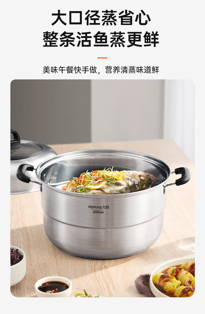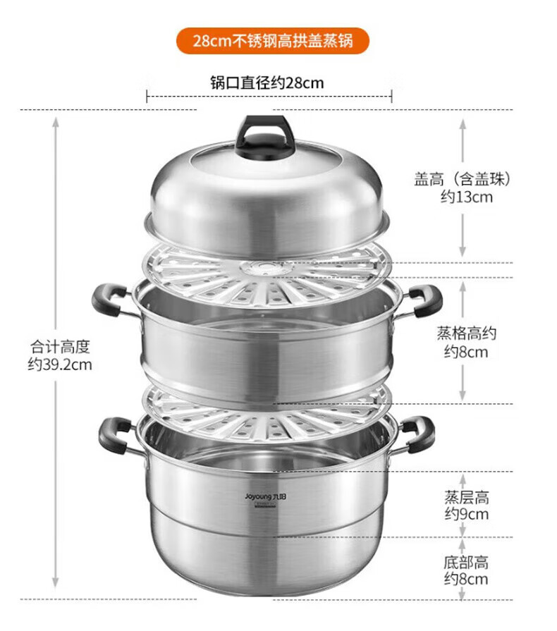 Jiuyang steamer 304 stainless steel three-layer compound bottom household steamed fish and raised lid steamer steamer steamer induction cooker gas stove high arch lid large capacity丨ZGH2802 3 layers 28cm