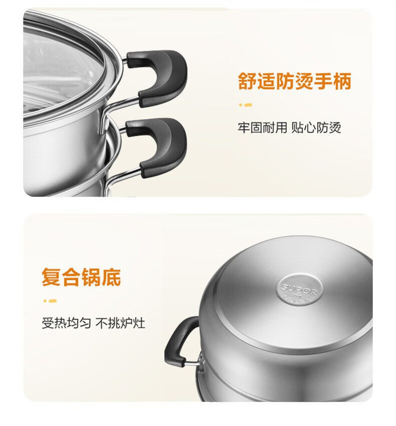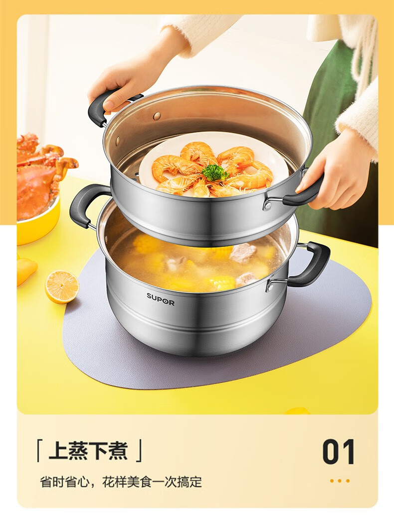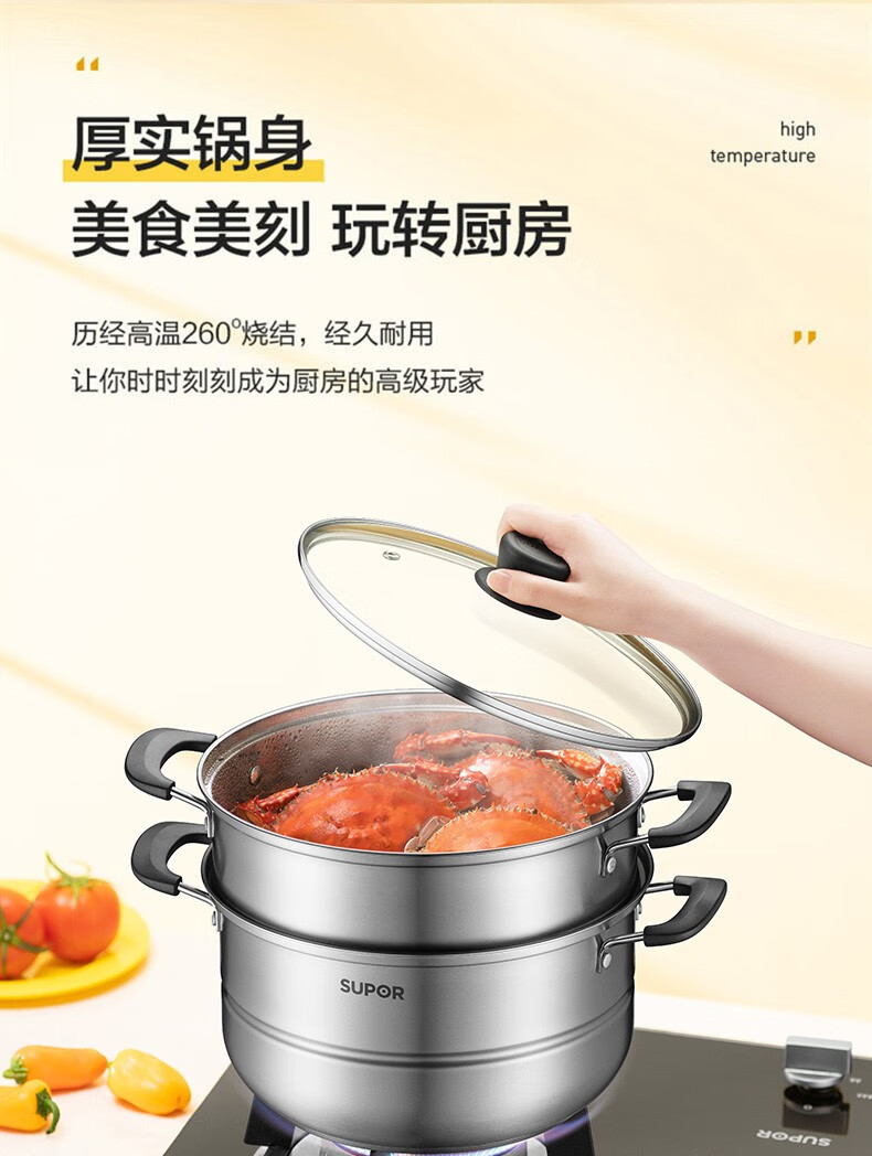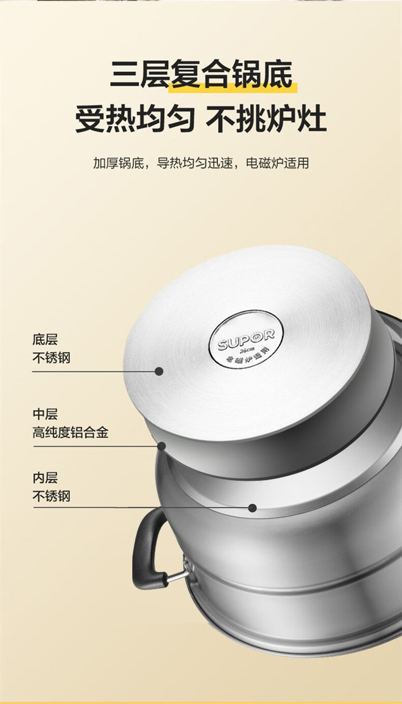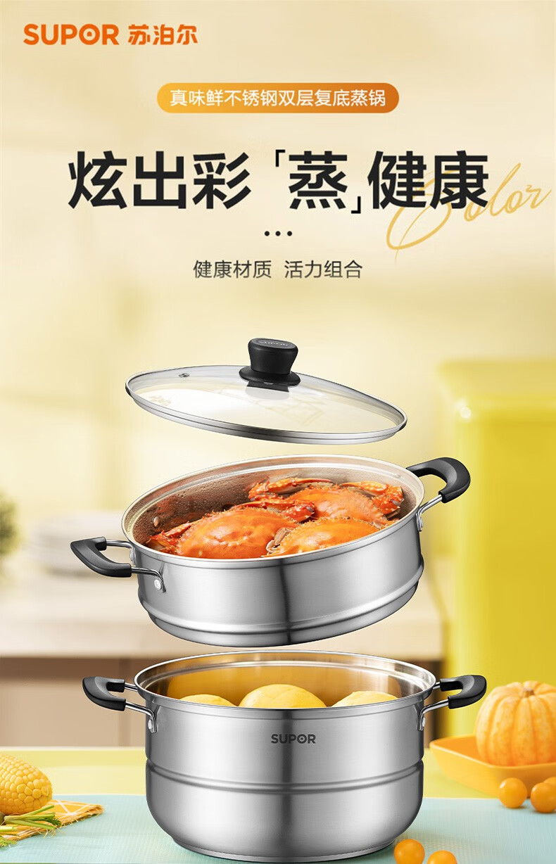 SUPOR steamer, double-layered bottom stainless steel pot, two-layer steamer, 26cm fish steamer, two-layer soup pot, universal gas induction cooker, diameter 26cm