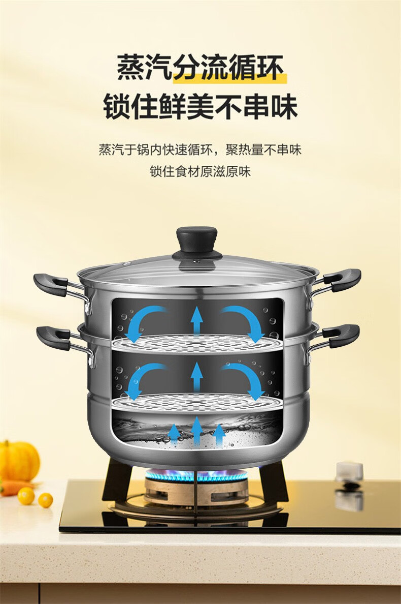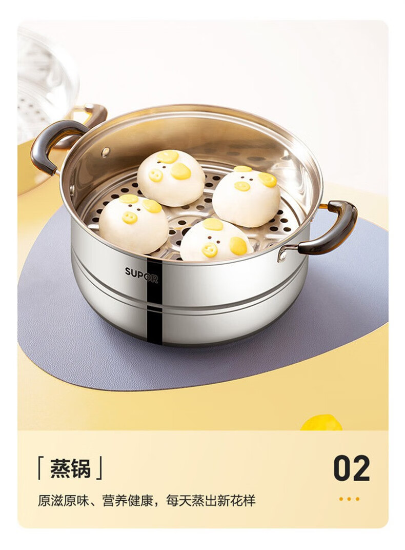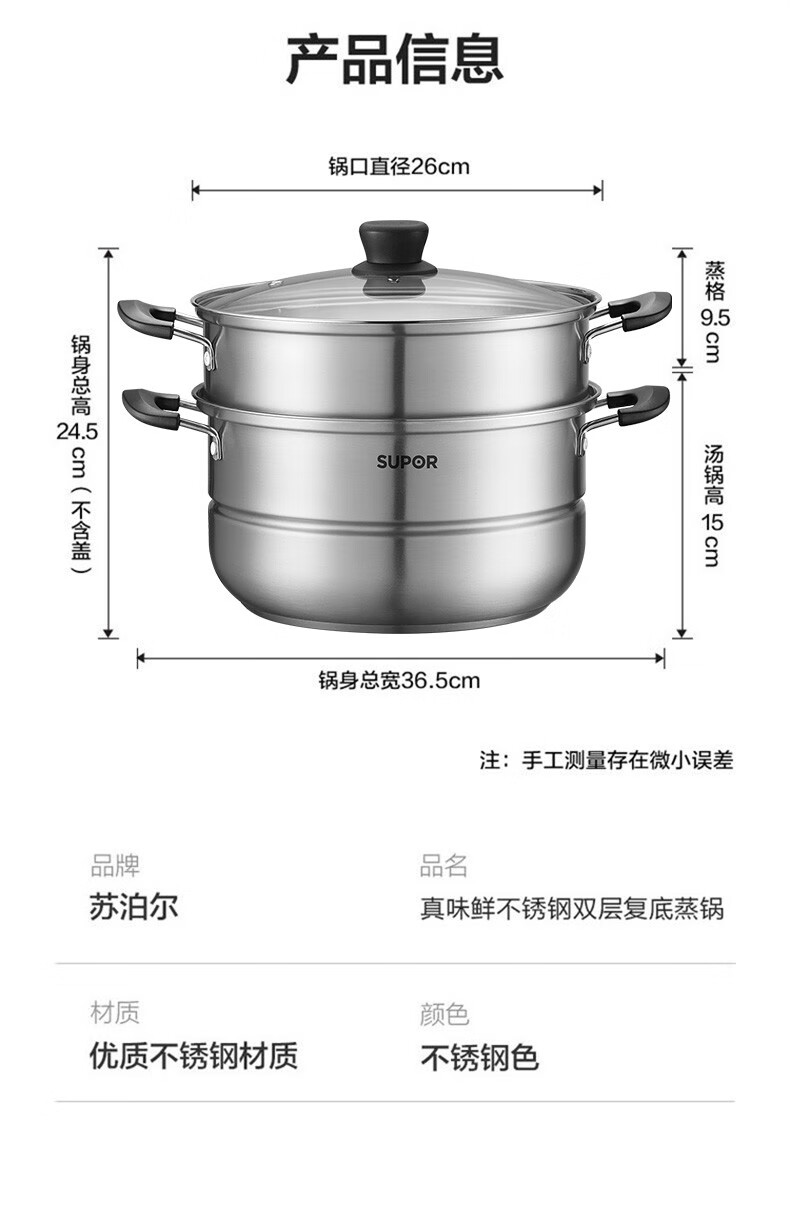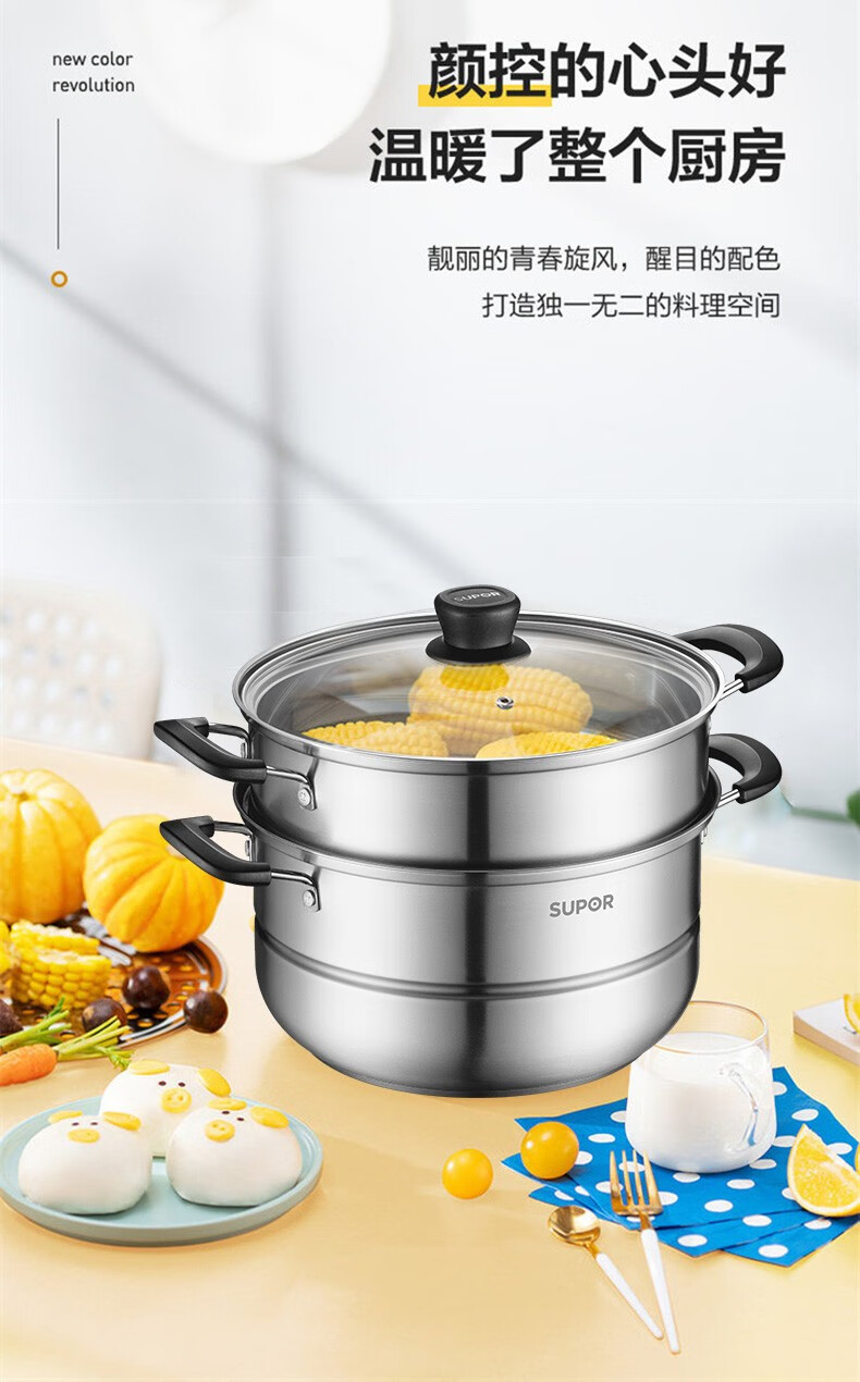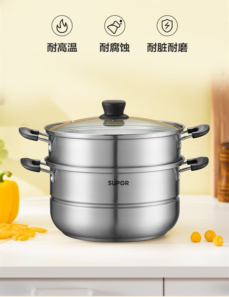 SUPOR steamer, double-layered bottom stainless steel pot, two-layer steamer, 26cm fish steamer, two-layer soup pot, universal gas induction cooker, diameter 26cm