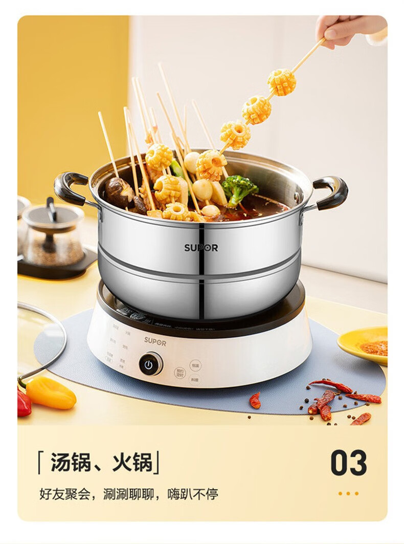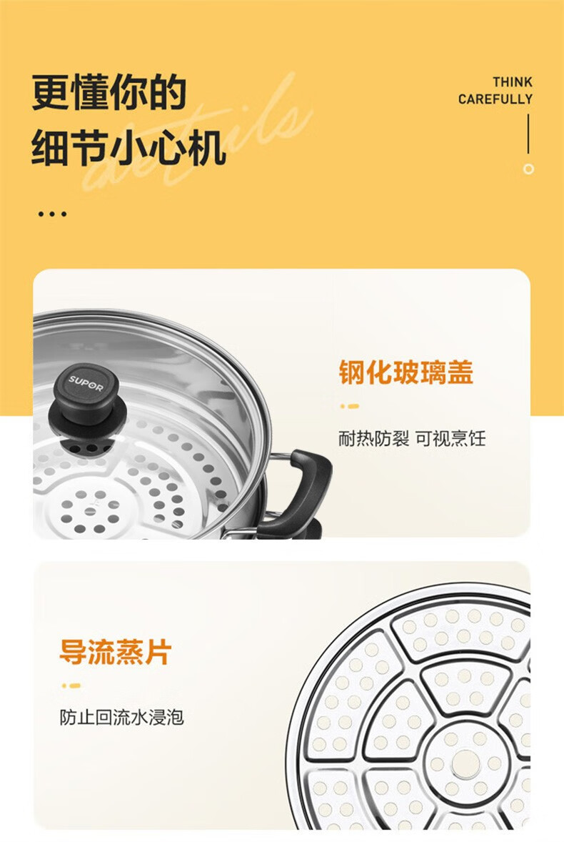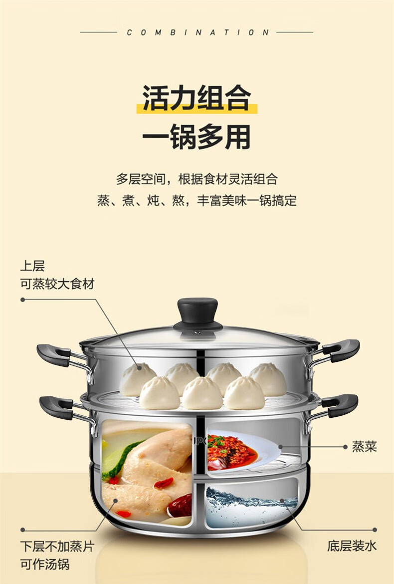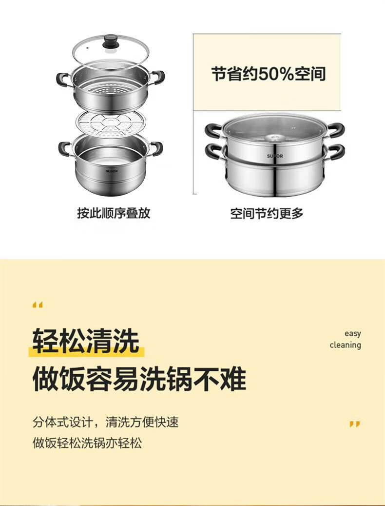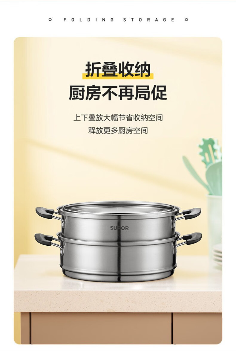 SUPOR steamer, double-layered bottom stainless steel pot, two-layer steamer, 26cm fish steamer, two-layer soup pot, universal gas induction cooker, diameter 26cm