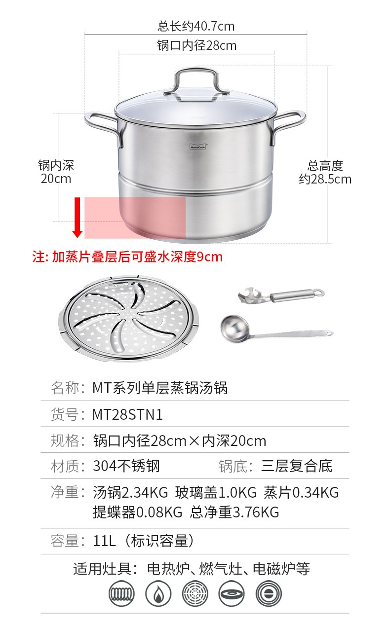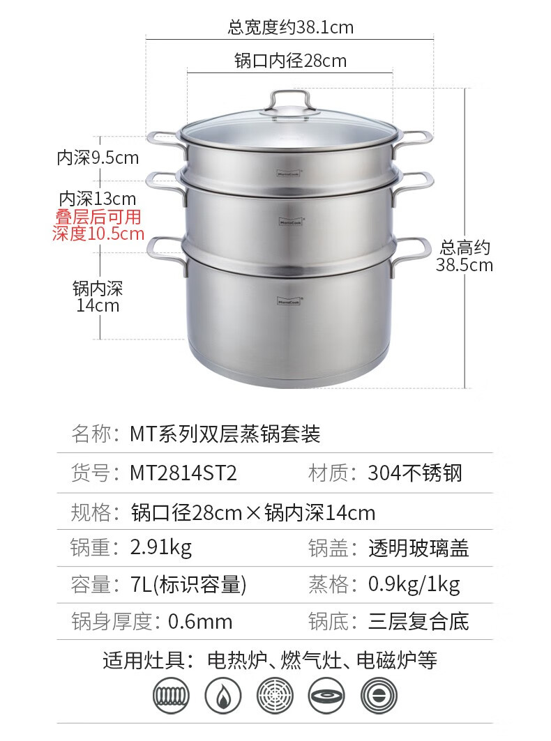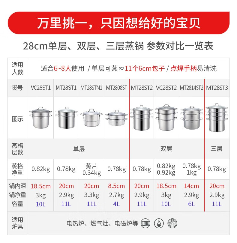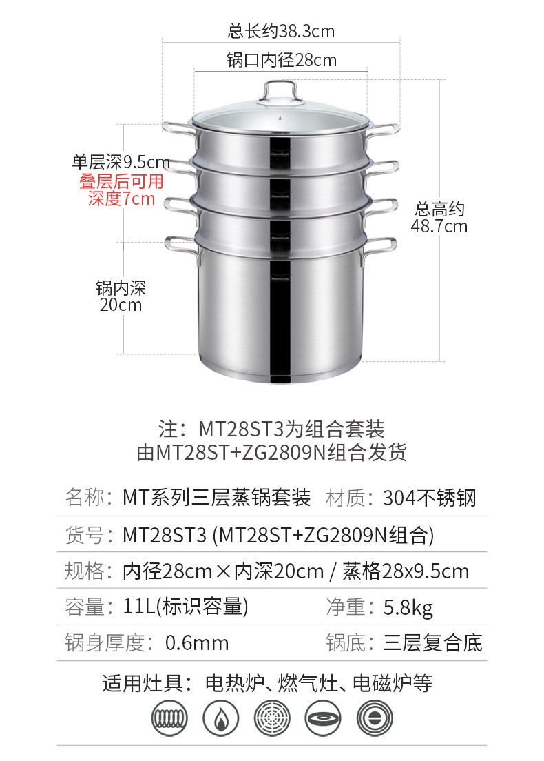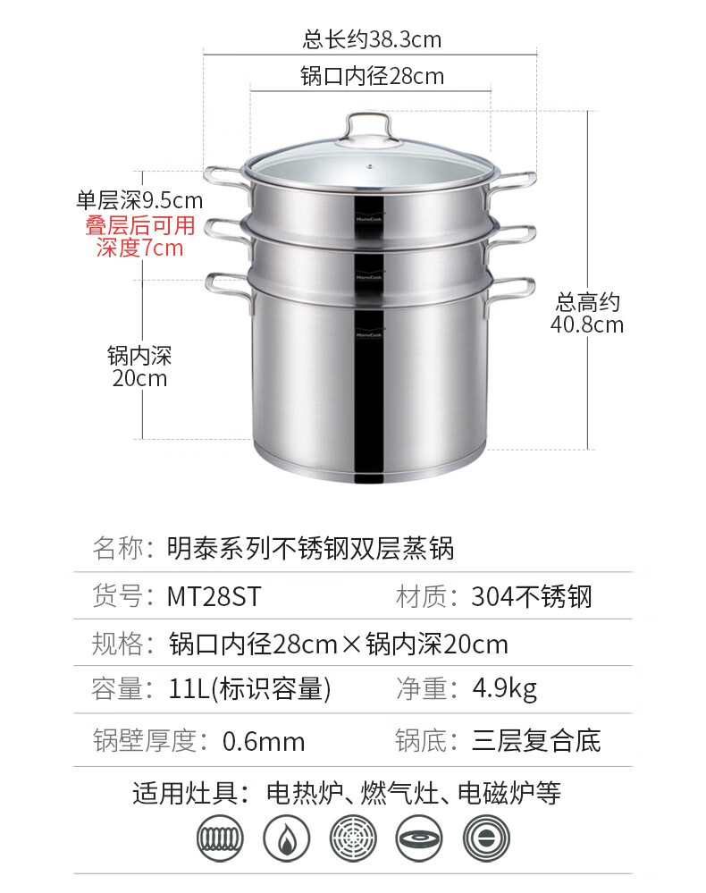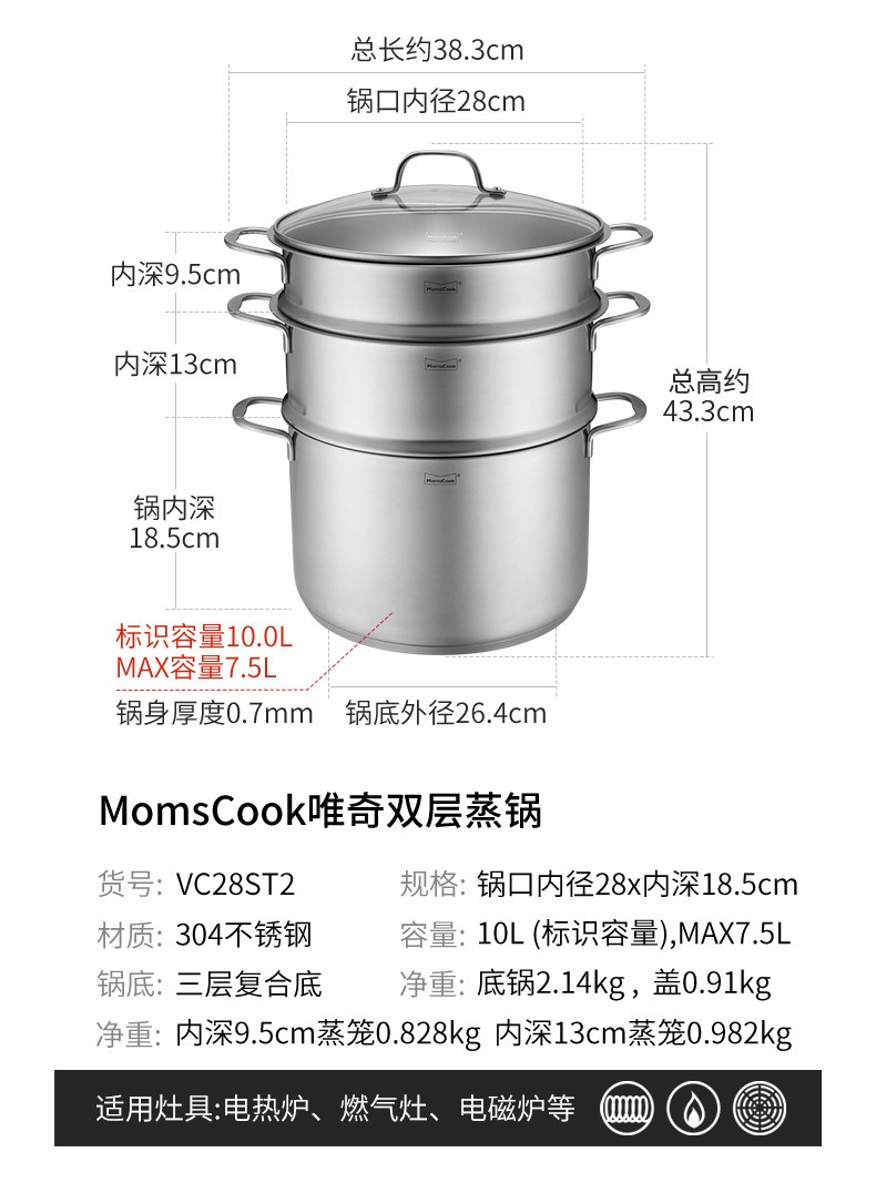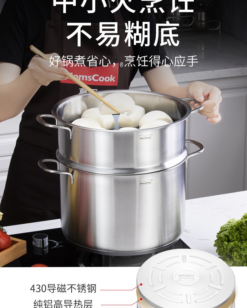Momscook stainless steel steamer set 28 multi-layer steaming grid steamer 304 double-layer thickened universal soup pot steamer dual-purpose MT2814ST2 steamer - 2 layers 28cm