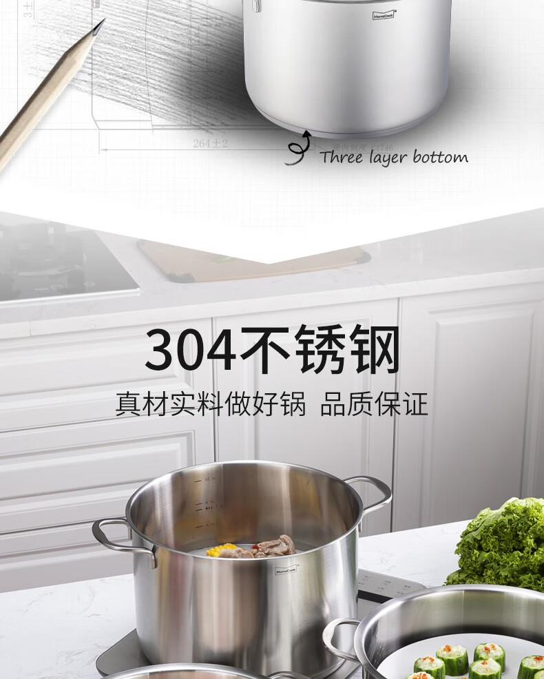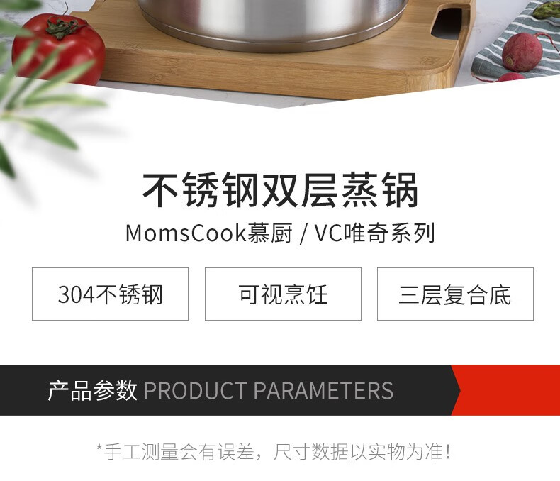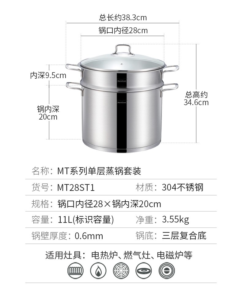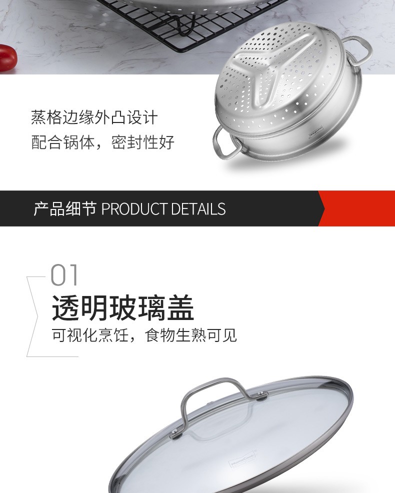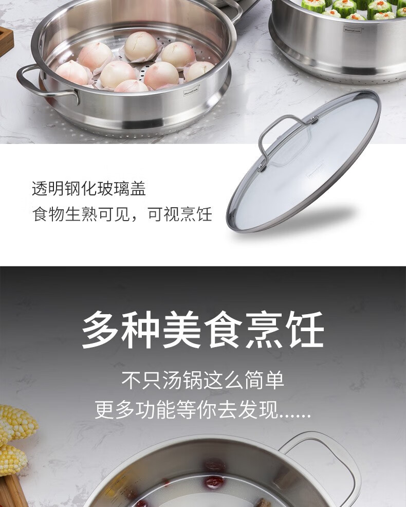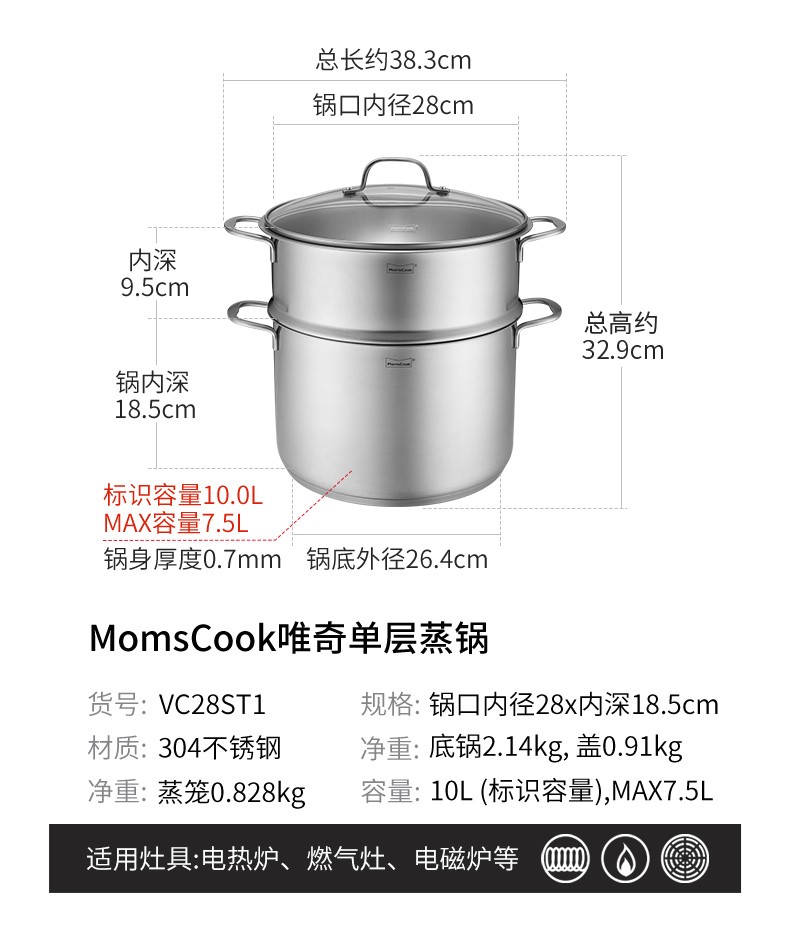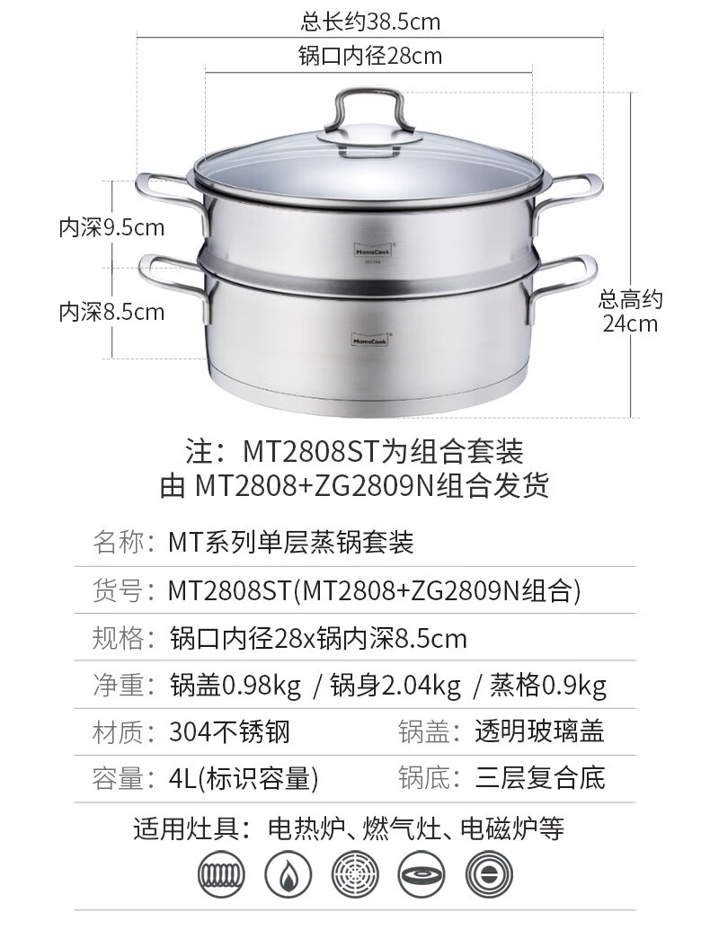 Momscook stainless steel steamer set 28 multi-layer steaming grid steamer 304 double-layer thickened universal soup pot steamer dual-purpose MT2814ST2 steamer - 2 layers 28cm