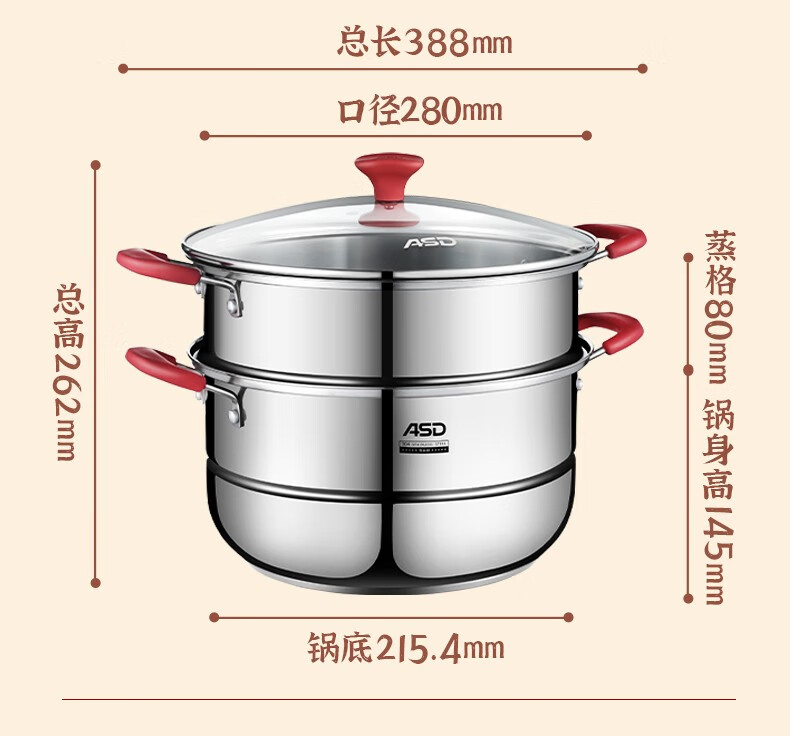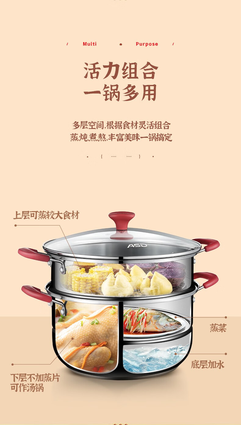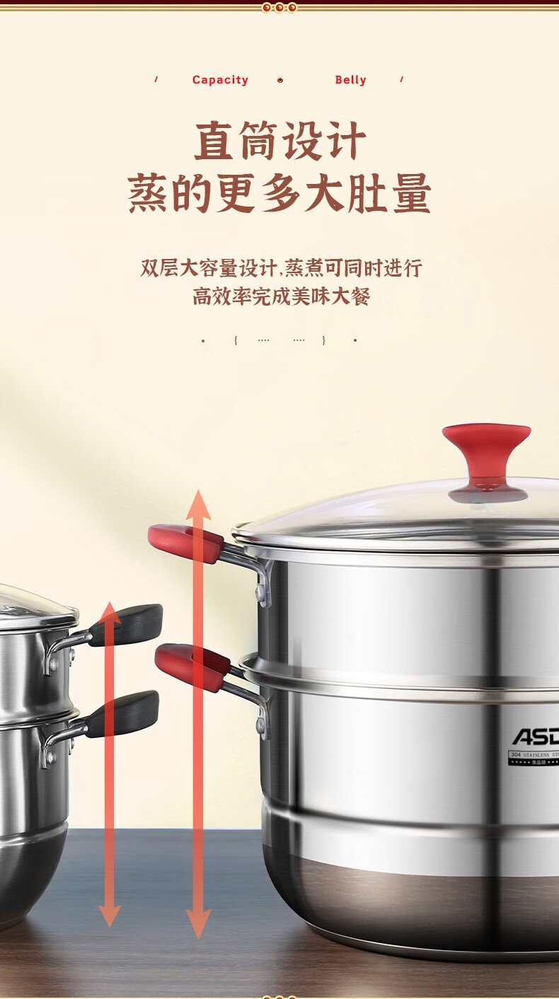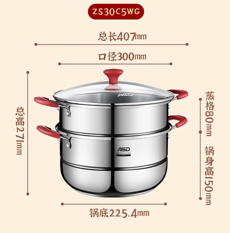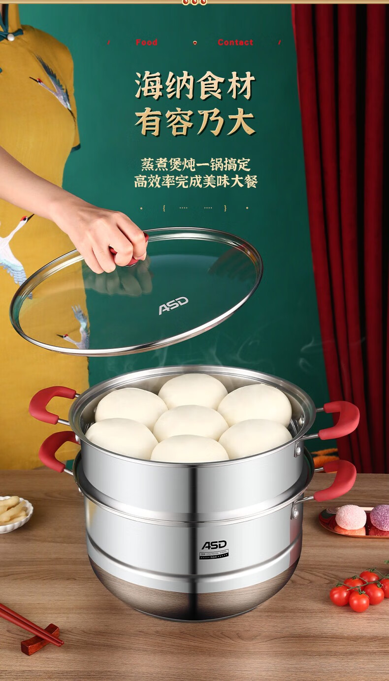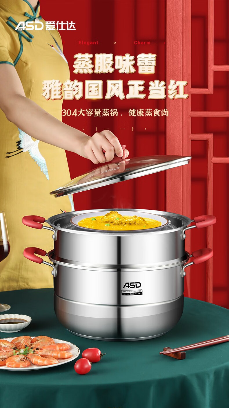 ASD steamer 304 stainless steel pot household double-layer heightened large-capacity steamed bun pot glass lid double bottom electromagnetic universal 30cm double-layer steamer (1 steamer + 1 steaming grate)