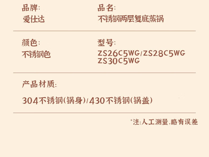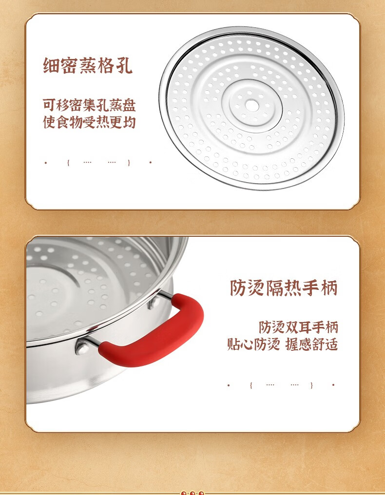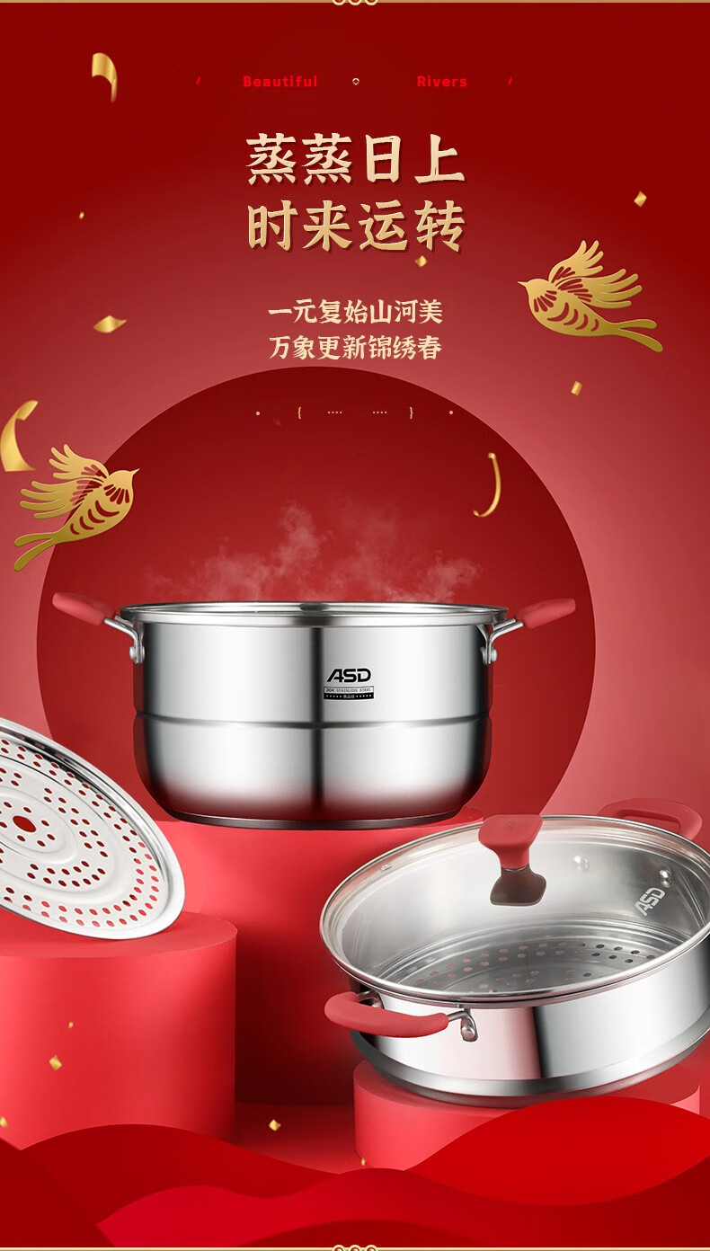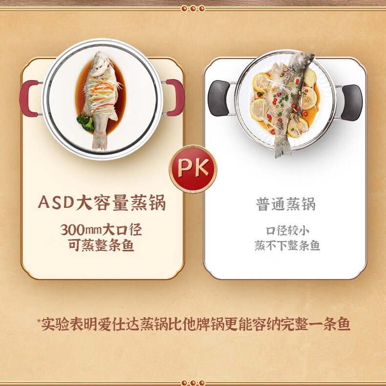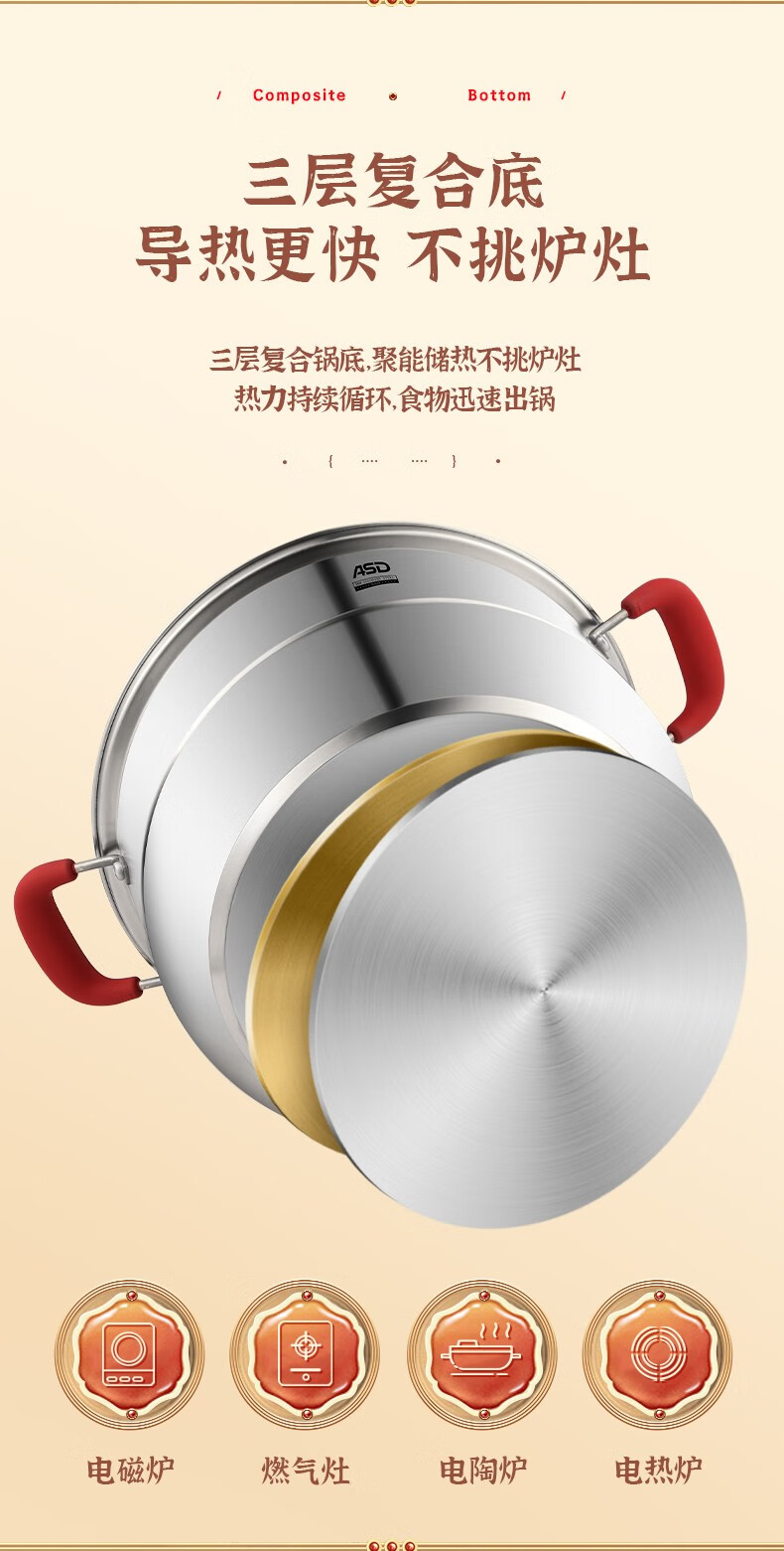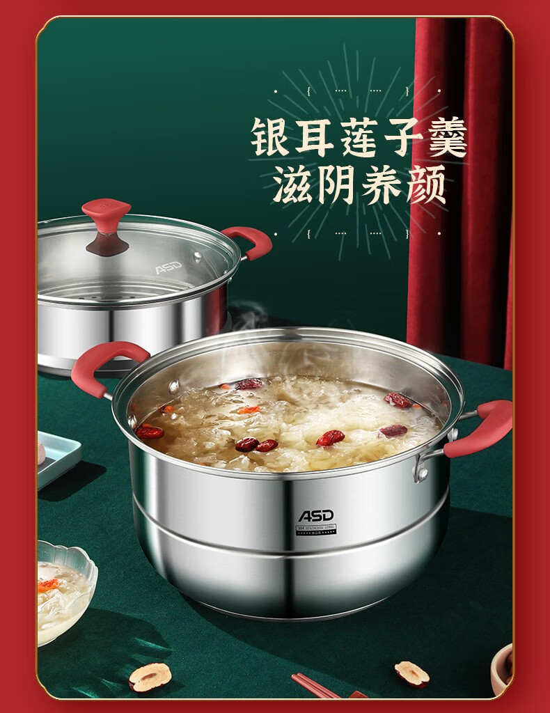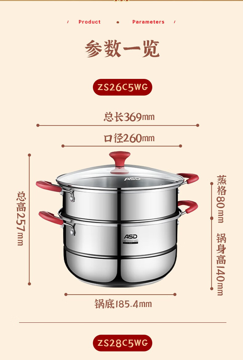 ASD steamer 304 stainless steel pot household double-layer heightened large-capacity steamed bun pot glass lid double bottom electromagnetic universal 30cm double-layer steamer (1 steamer + 1 steaming grate)