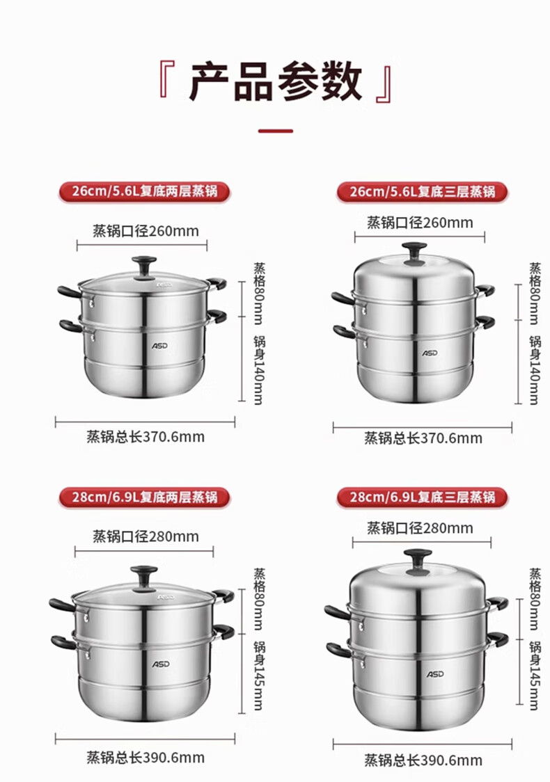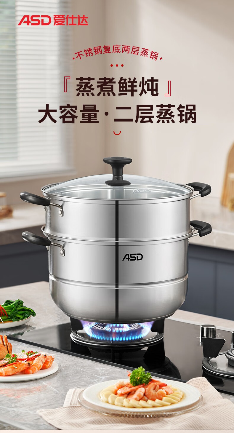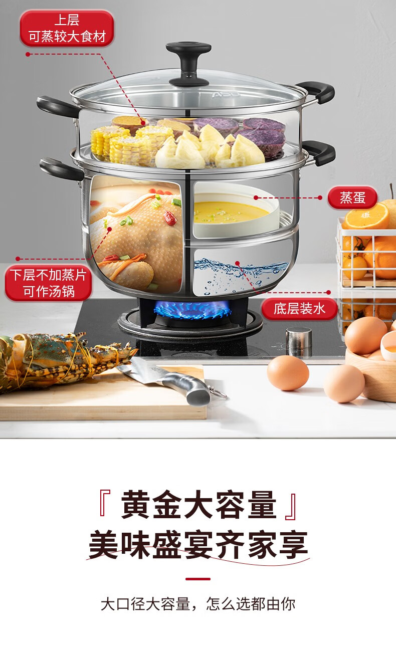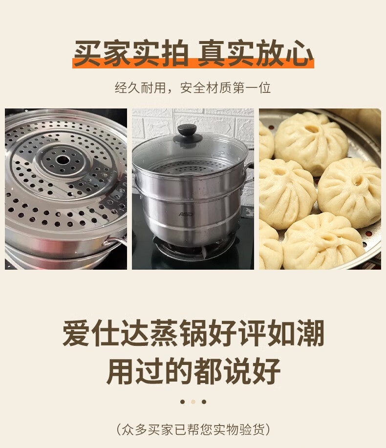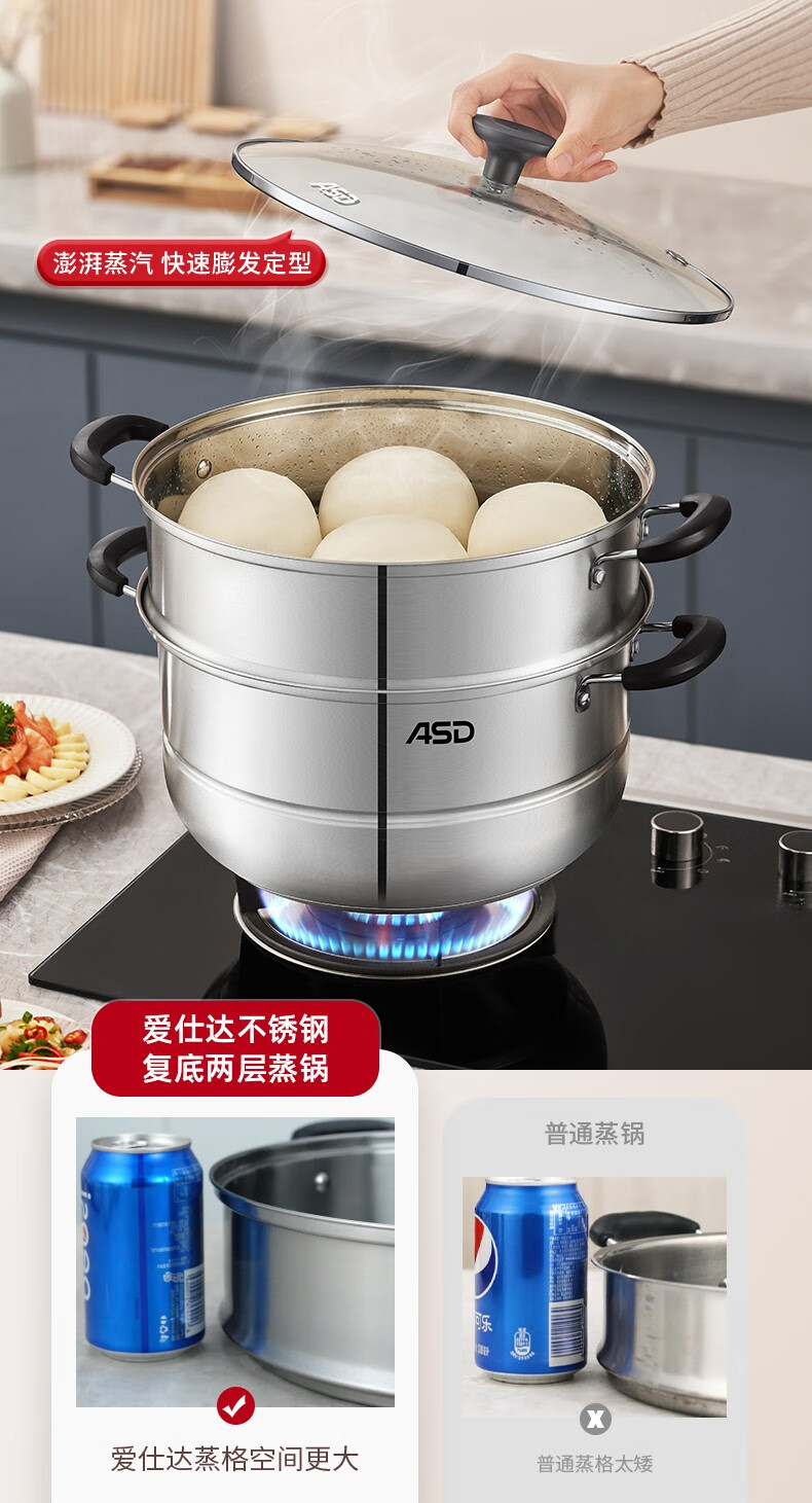 ASD stainless steel steamer, thickened bottom, steamer, grate, large soup pot for steaming steamed buns, universal for gas open flame induction cooker, three-layer steamer (half glass cover) 30cm