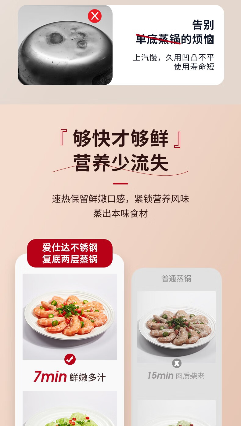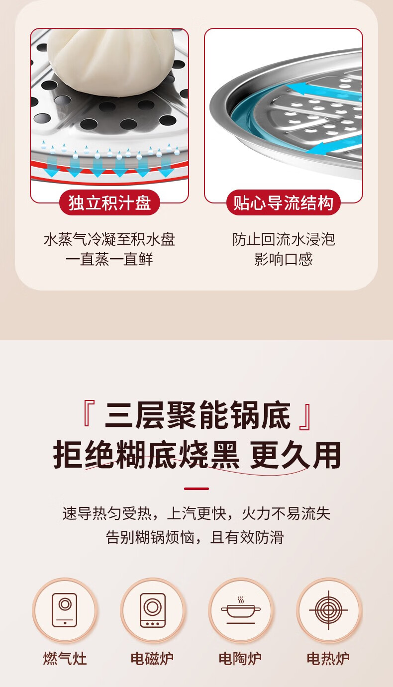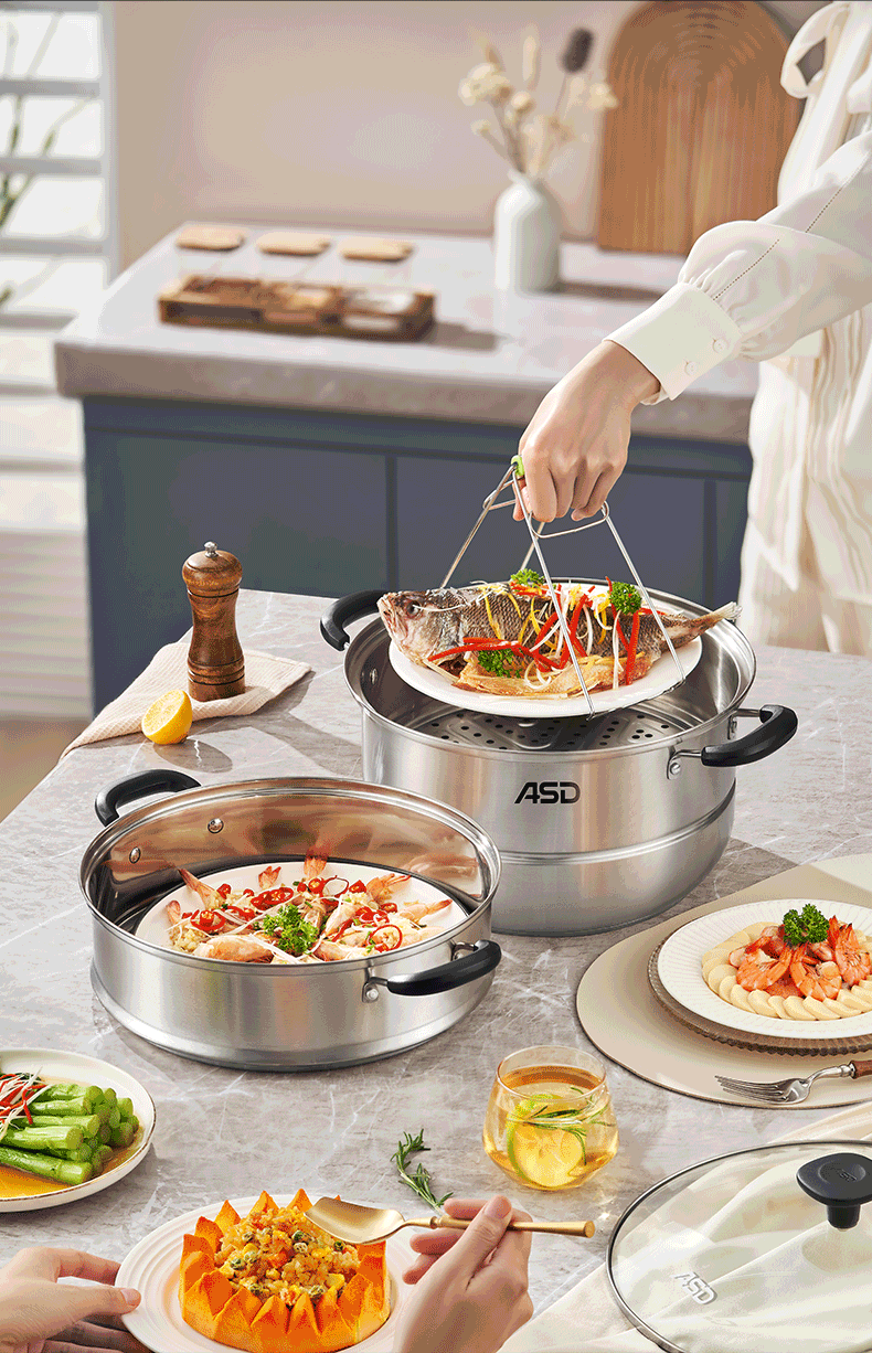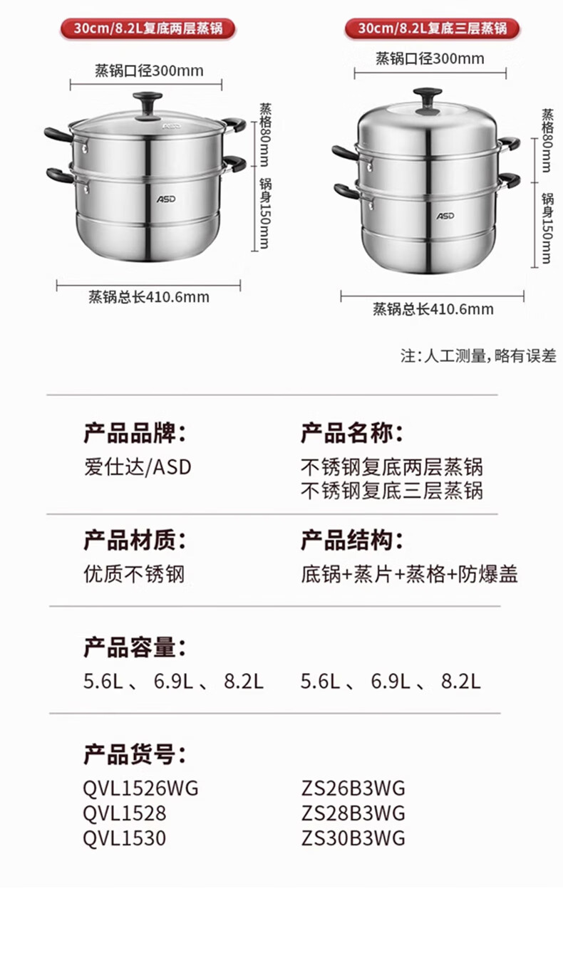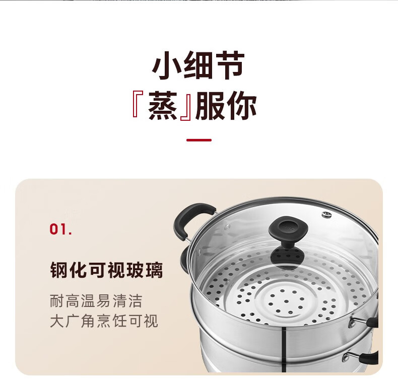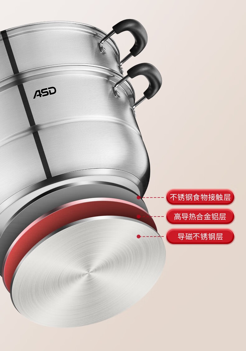 ASD stainless steel steamer, thickened bottom, steamer, grate, large soup pot for steaming steamed buns, universal for gas open flame induction cooker, three-layer steamer (half glass cover) 30cm
