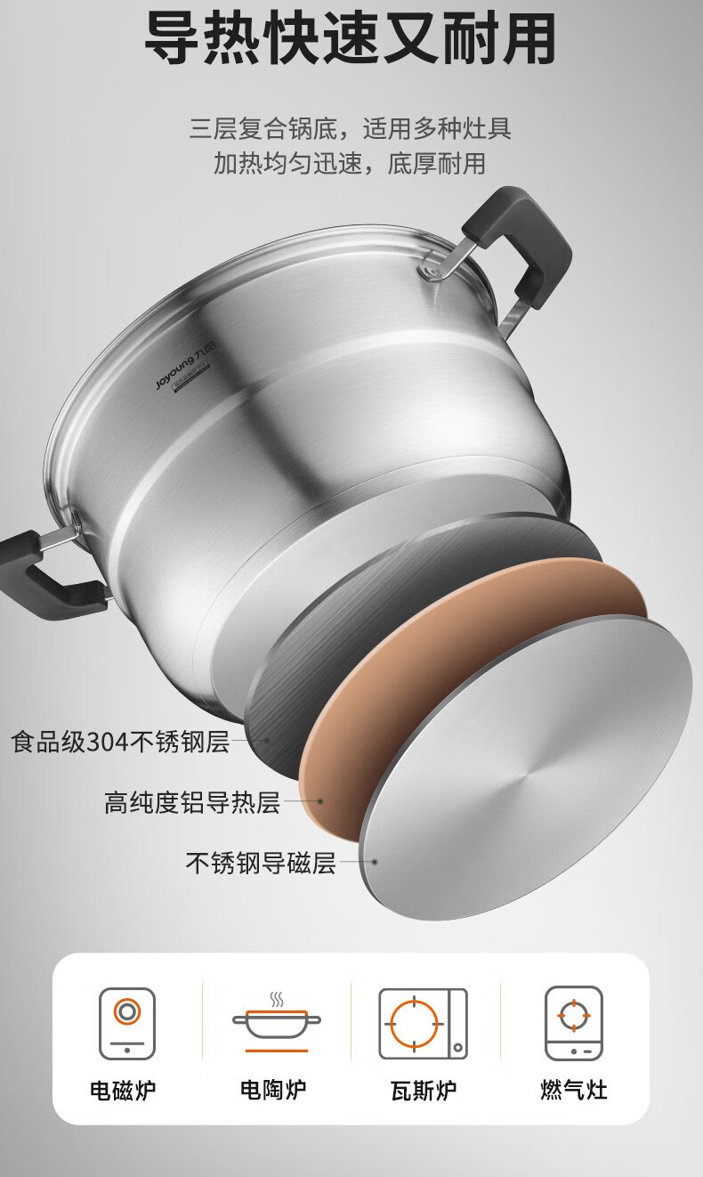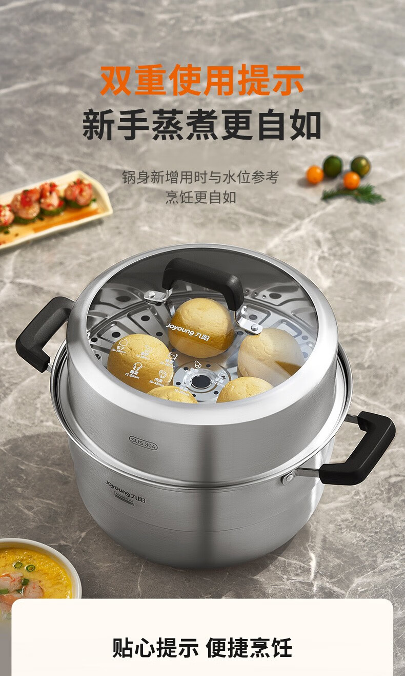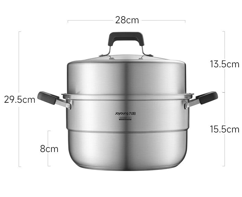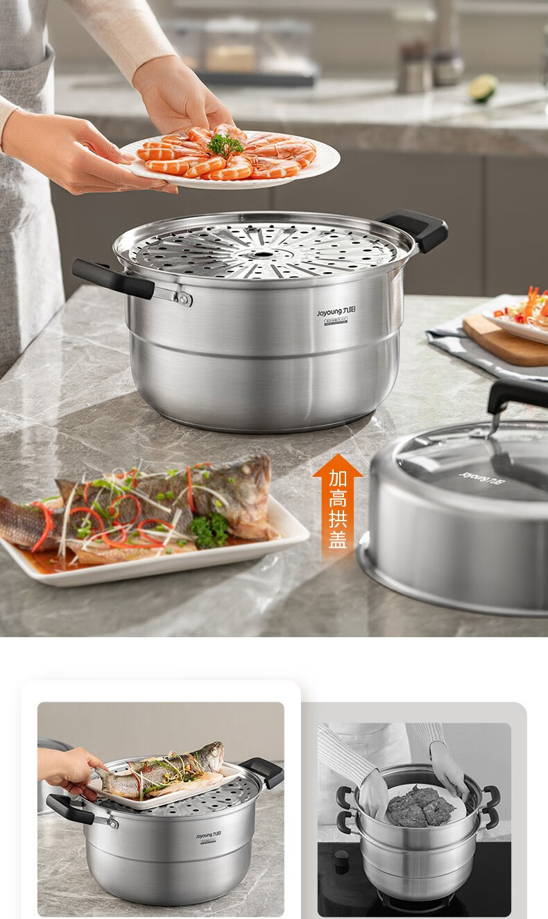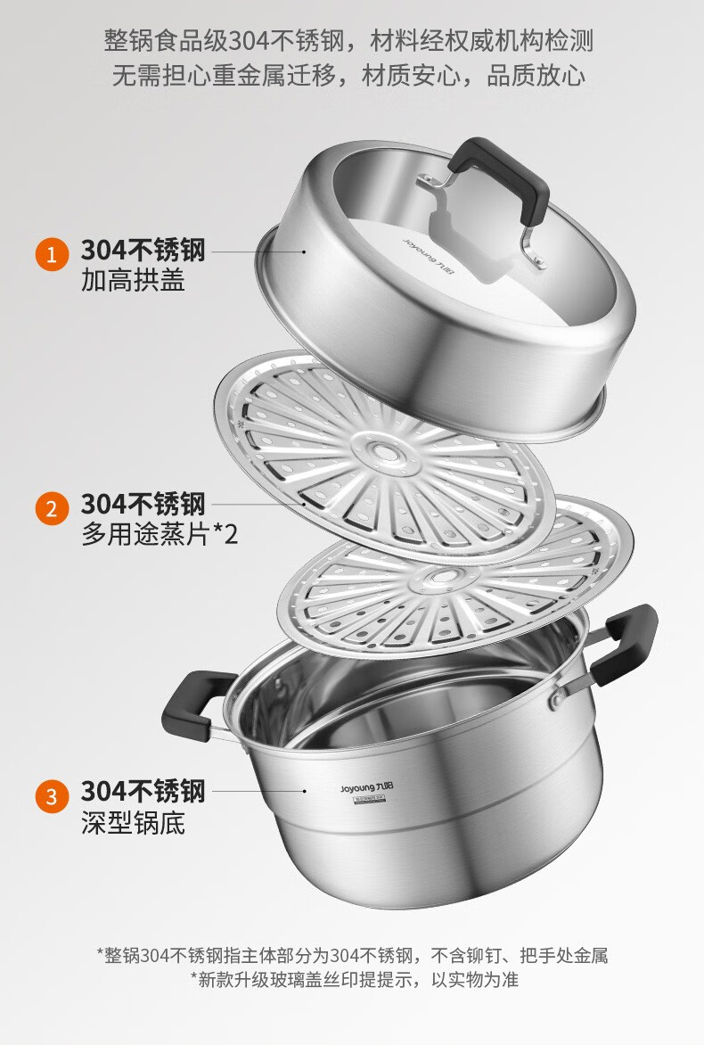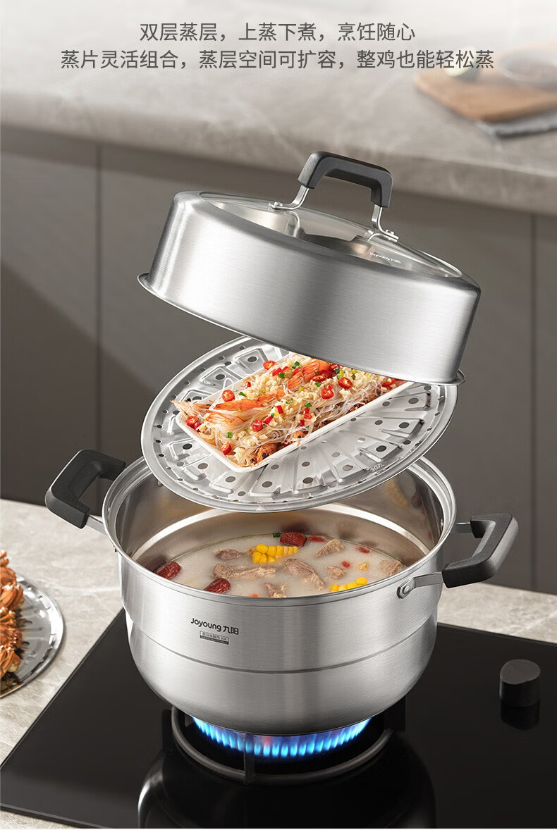 Joyoung Steamer 304 stainless steel double-layered bottom large-capacity high-arch lid steamer soup pot steamer induction cooker universal heightening design-CZ513- 2 layers 28cm