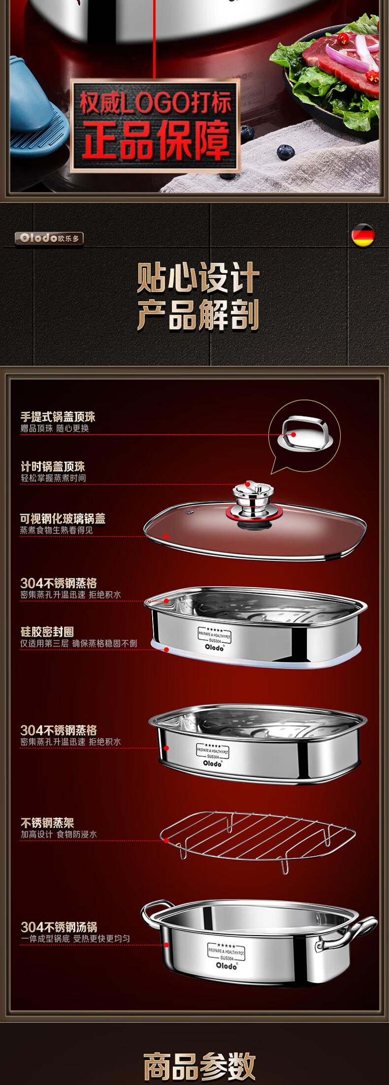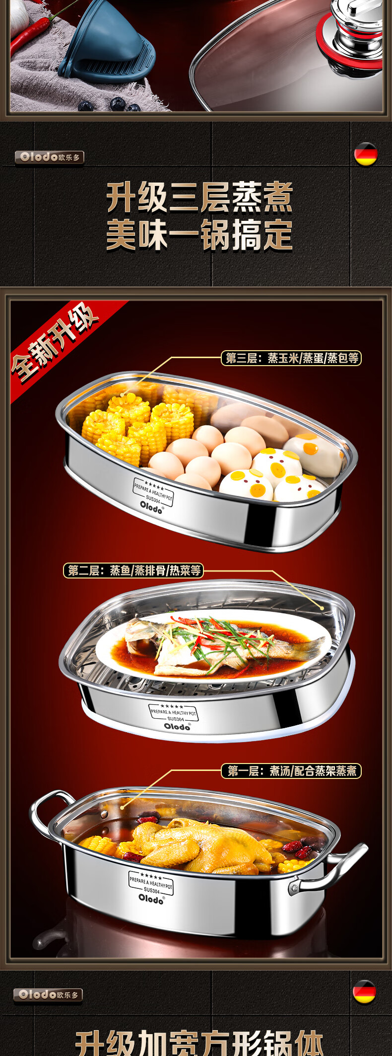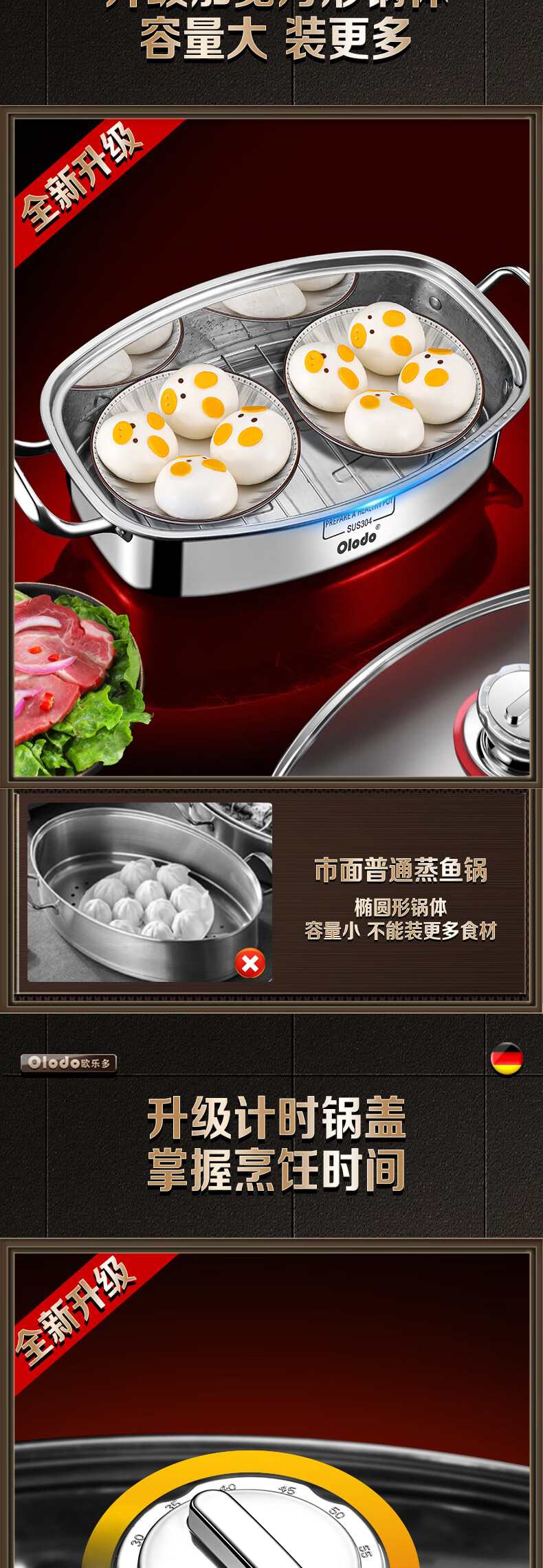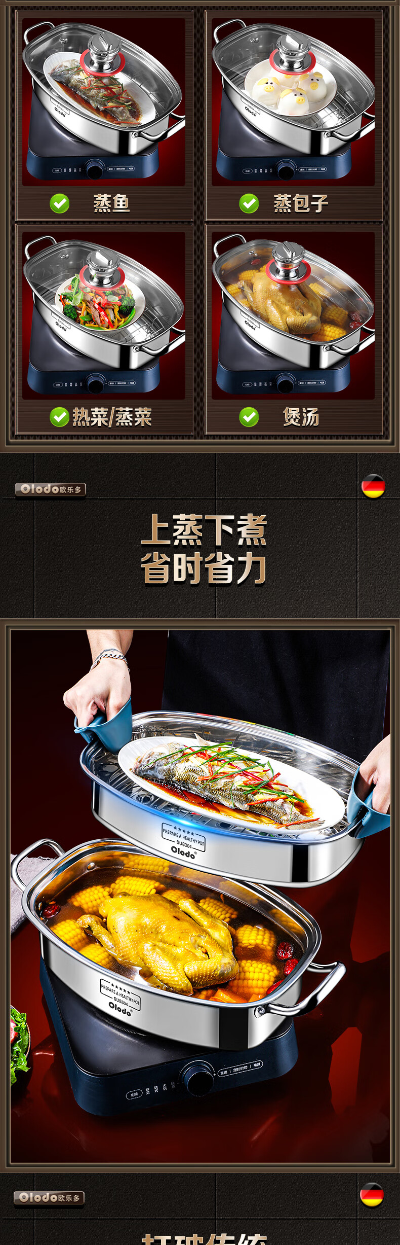 Olodo German 304 stainless steel fish steaming pot steamer large household large capacity oval fish steaming artifact steamer pot timer 304 fish steaming pot five gifts 2 layers 34cm