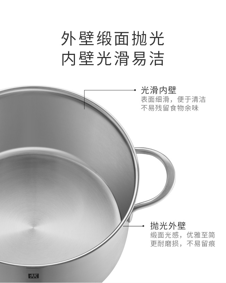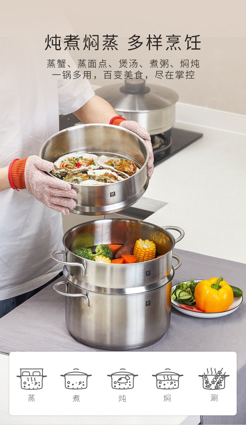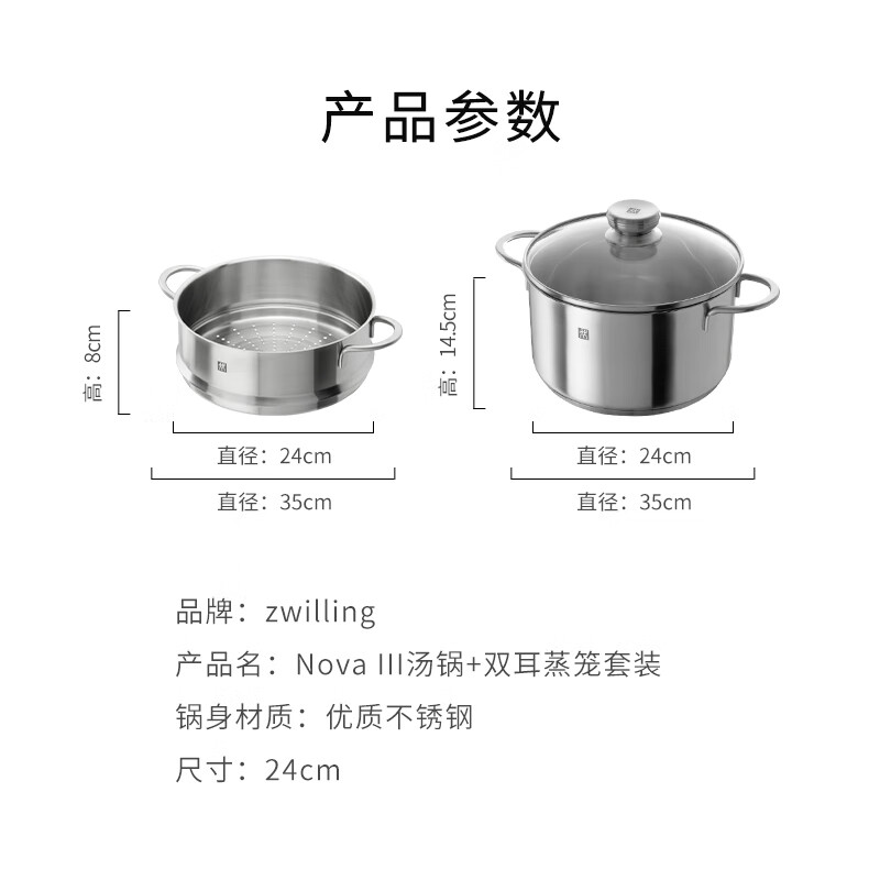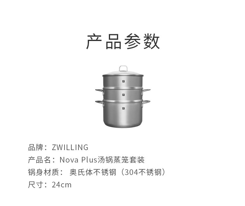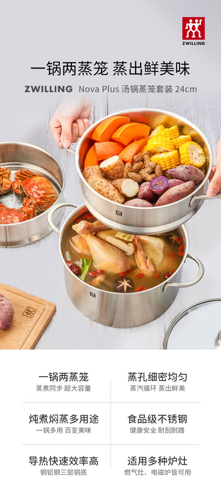 Zwilling stainless steel soup pot steamer household stew pot steamer large capacity soup pot induction cooker universal kitchen utensils Nova III soup pot + 2 double-ear steamer 24cm