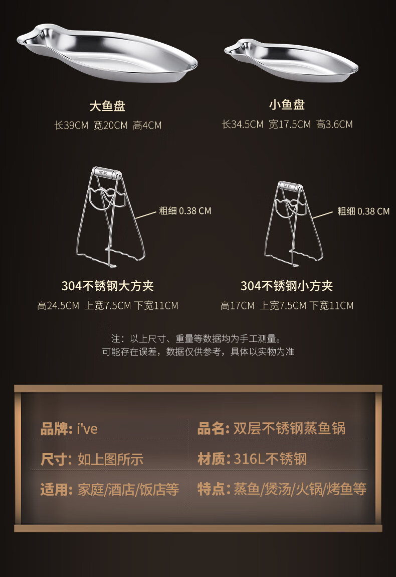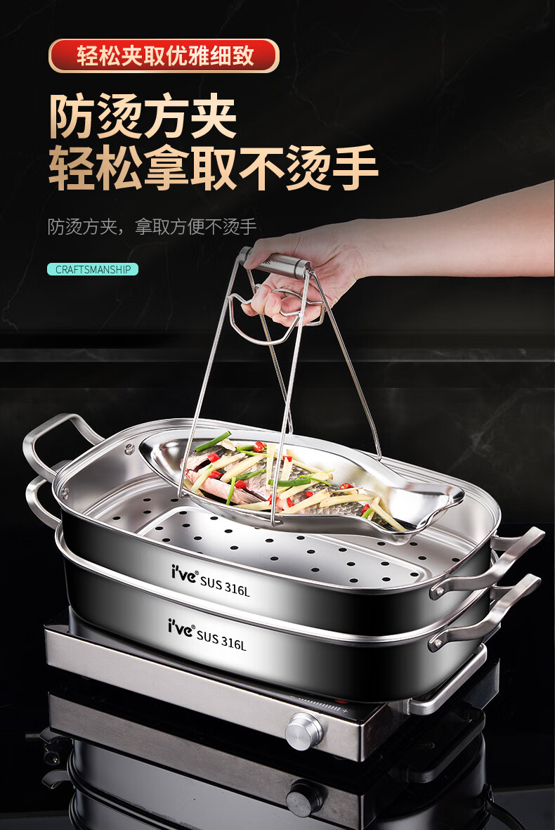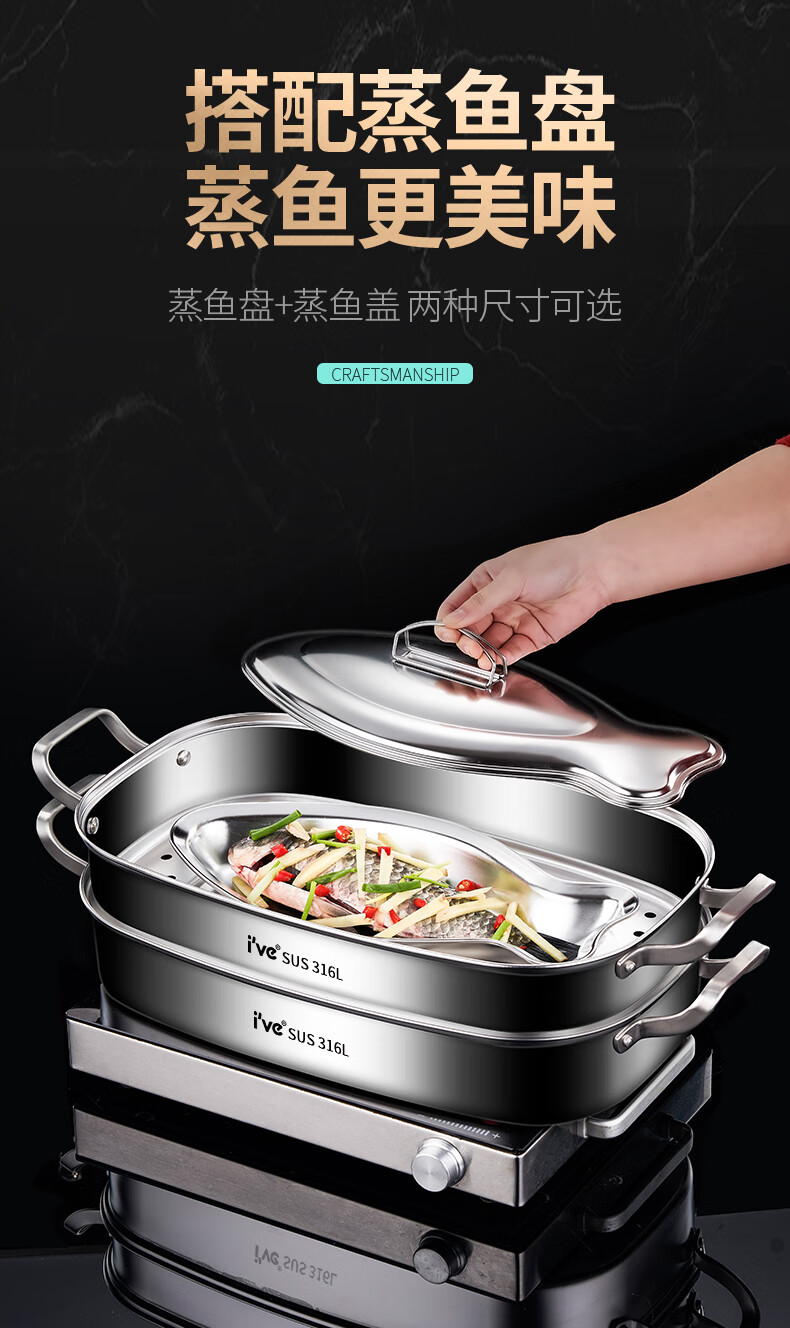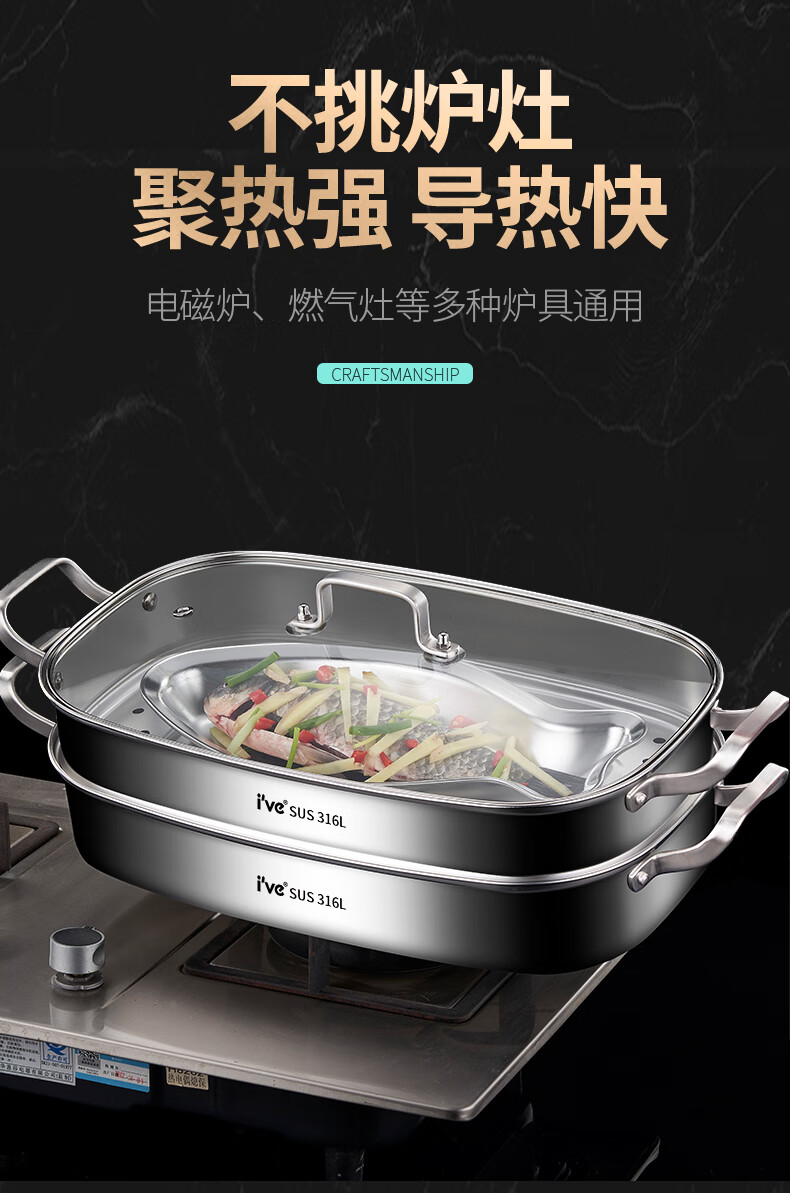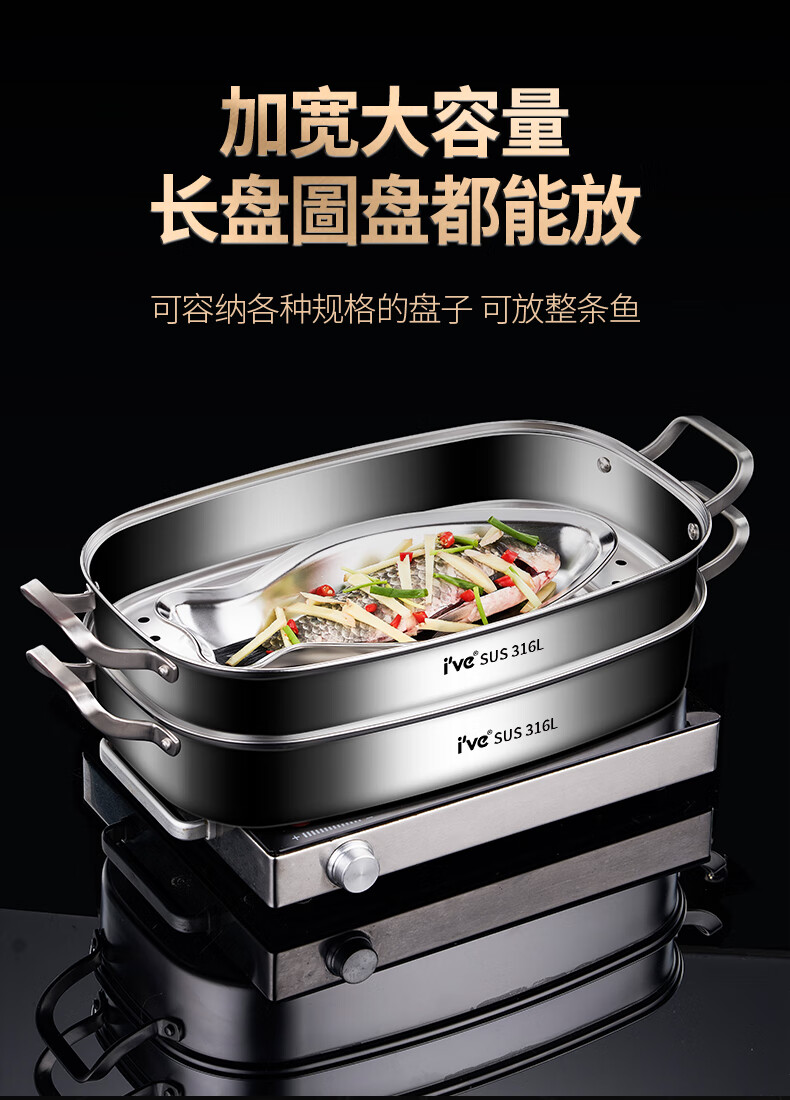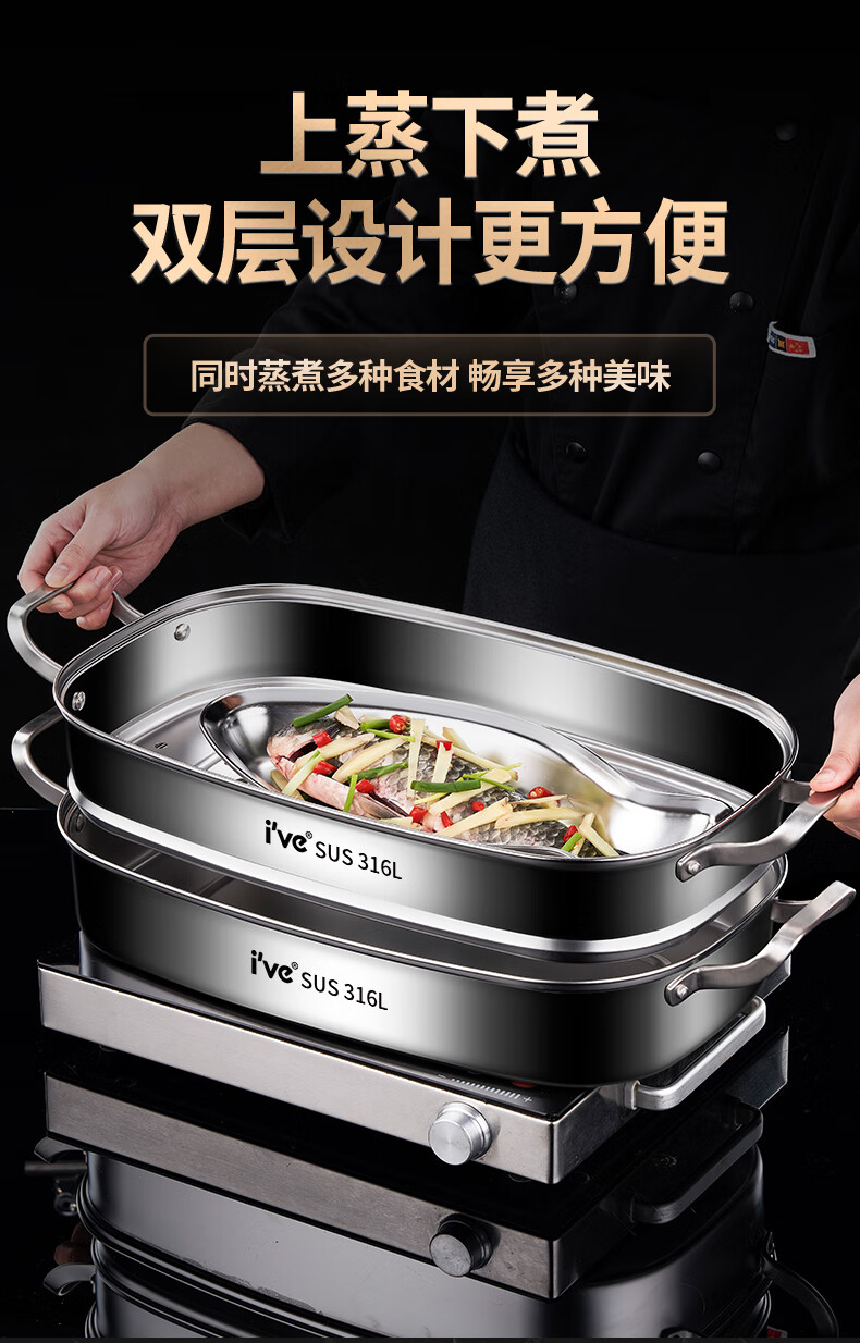 I VE316 stainless steel fish steamer household large-capacity fish steamer artifact special steamer steamer for steamed buns induction cooker gas stove German 316L extra thick double-layer fish pot 43cm
