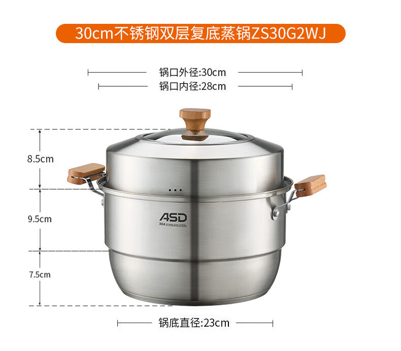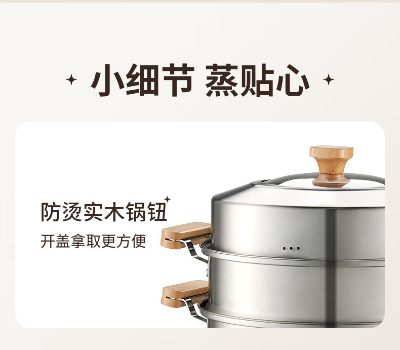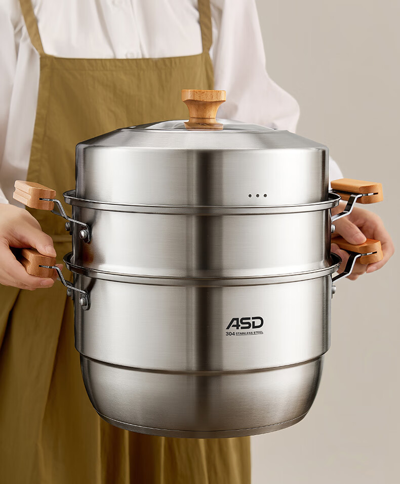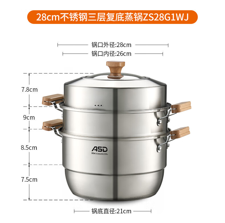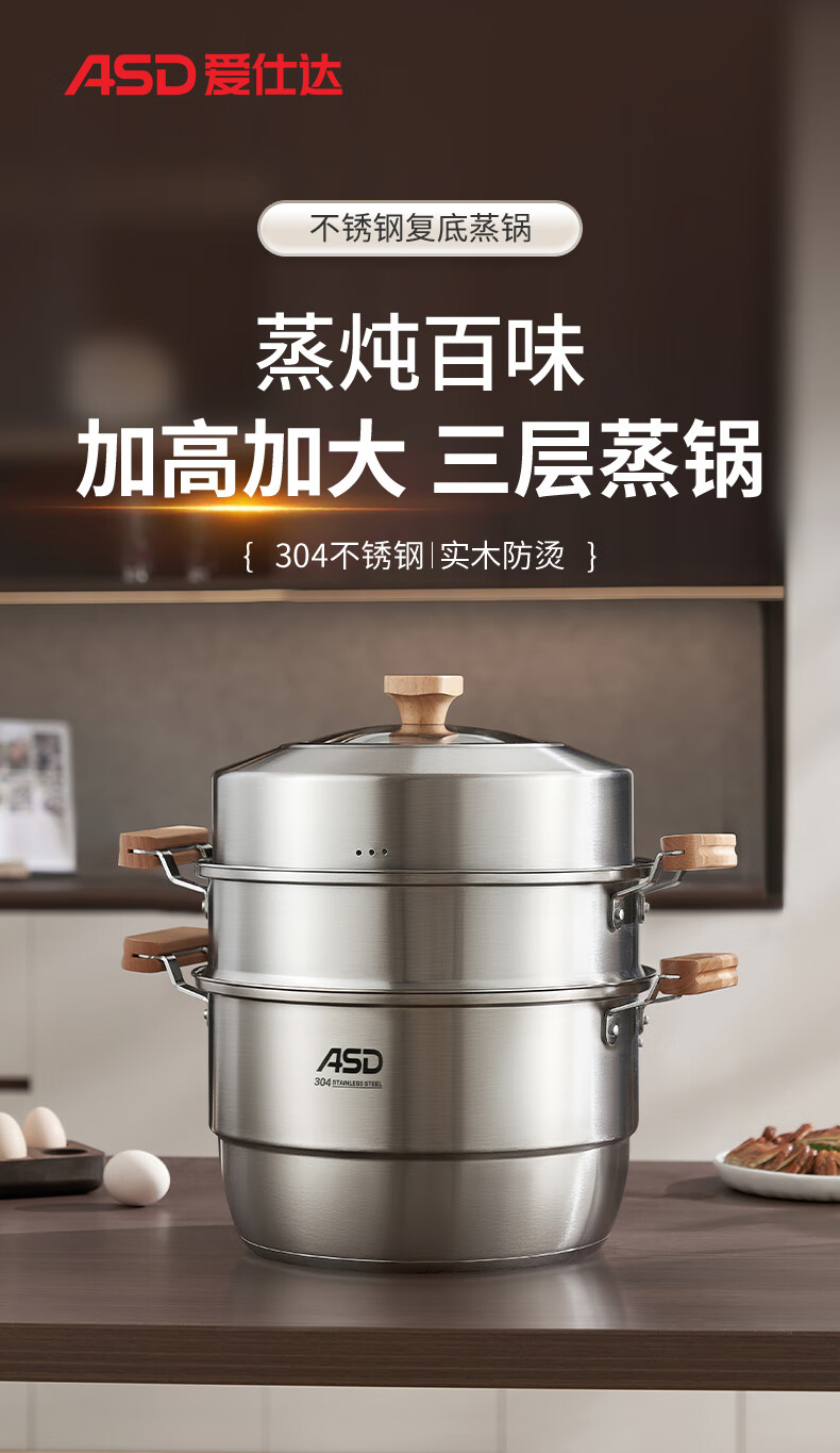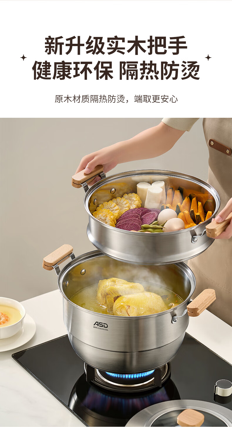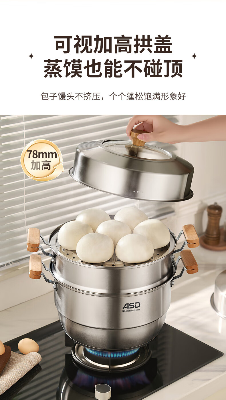 Aistar steamer 304 stainless steel thickened large capacity kitchen household double bottom steamed bun pot gas induction cooker universal heightened double-layer steamer 28cm