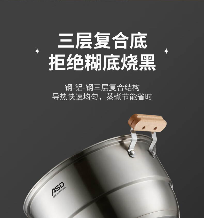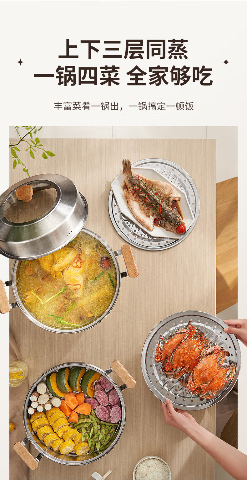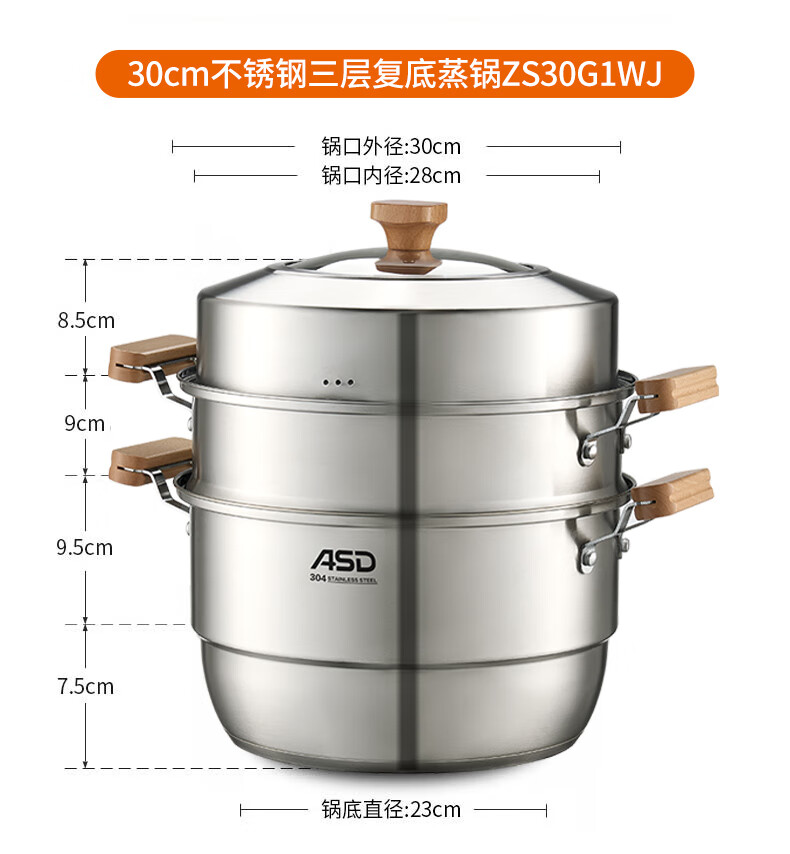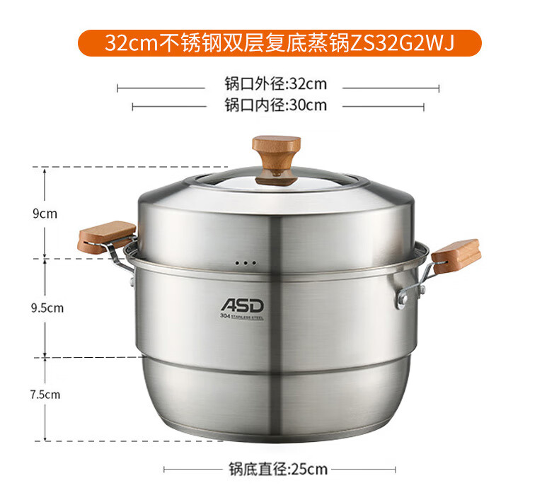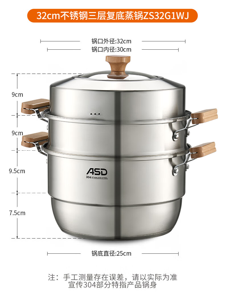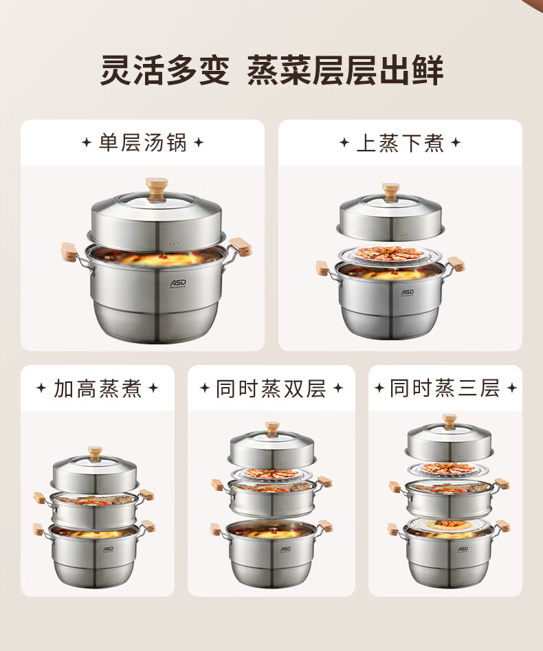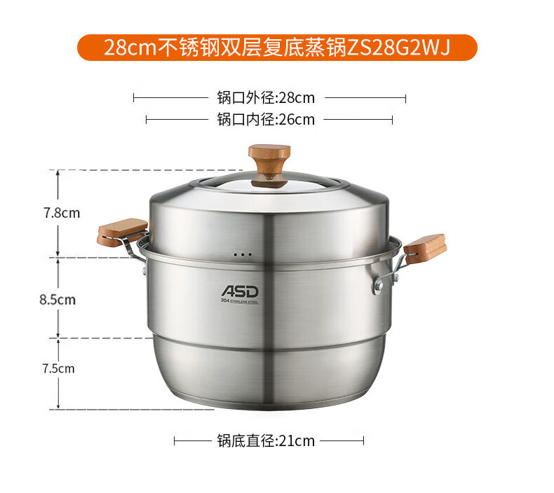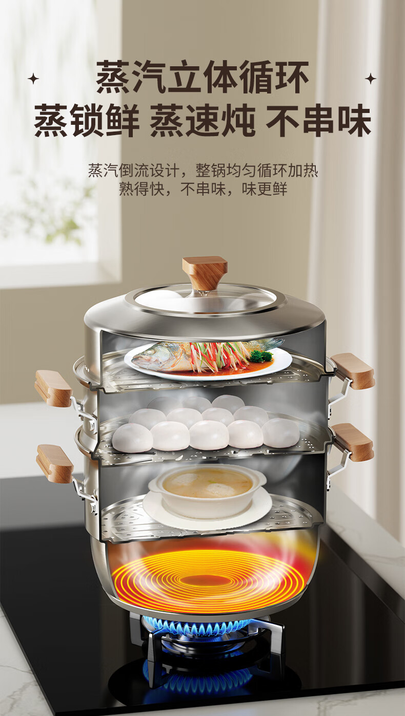 Aistar steamer 304 stainless steel thickened large capacity kitchen household double bottom steamed bun pot gas induction cooker universal heightened double-layer steamer 28cm
