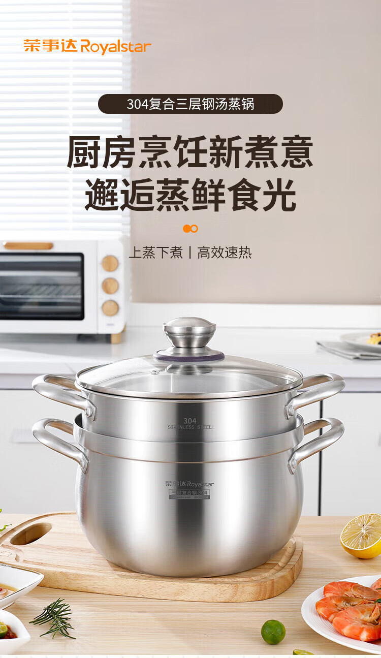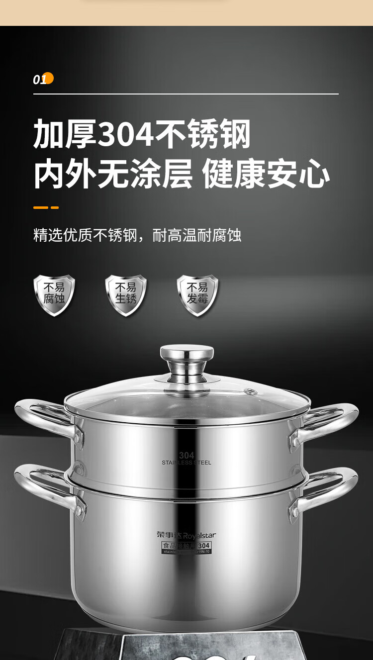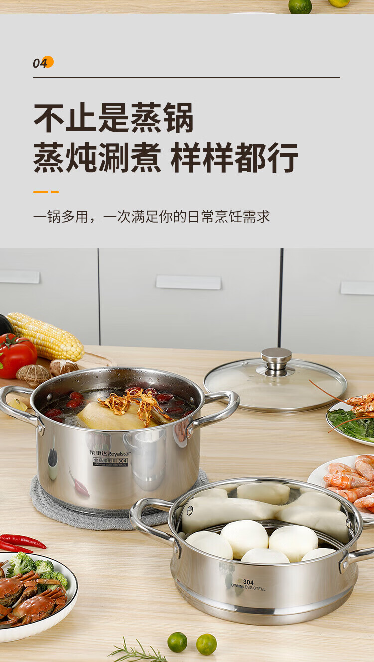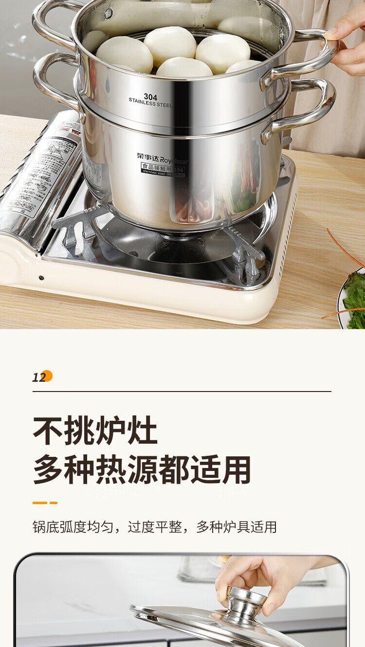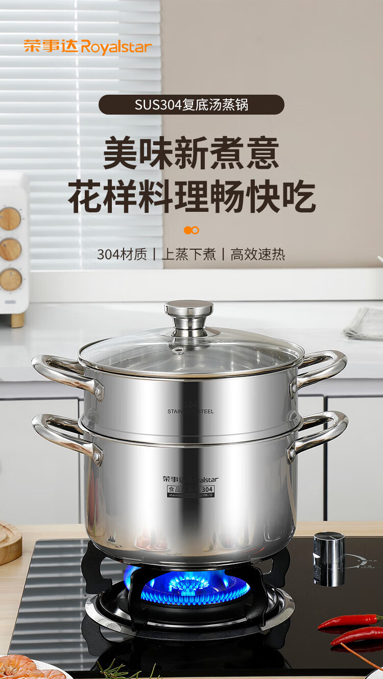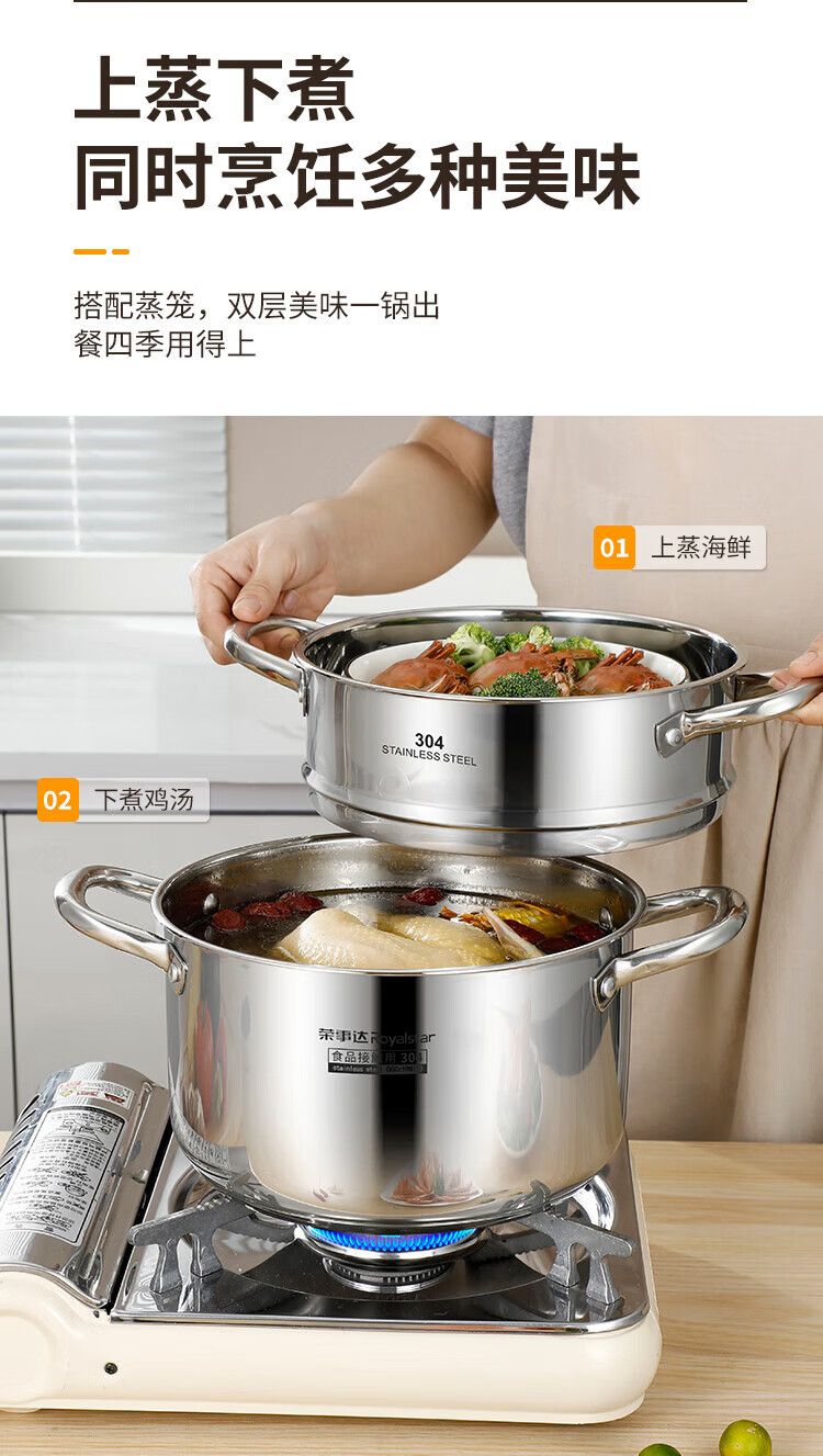 Royalstar steamer household stainless steel pot steamer thickened double bottom soup pot gas induction cooker universal steaming dual-purpose double-layer steamer 22cm