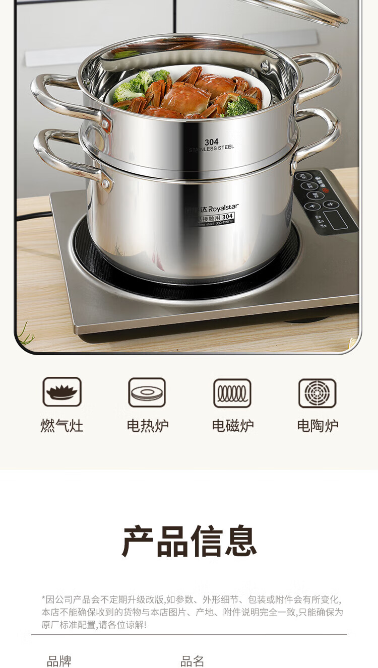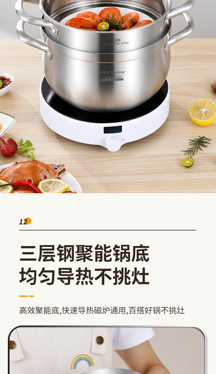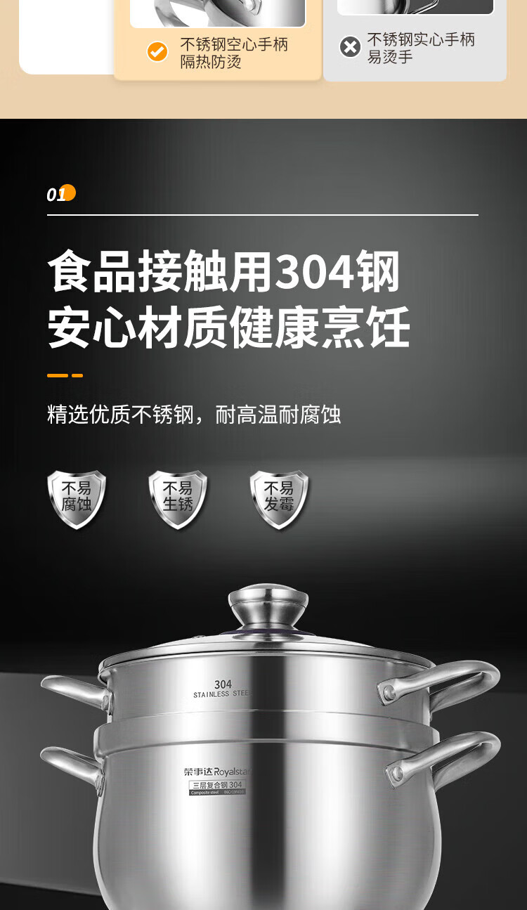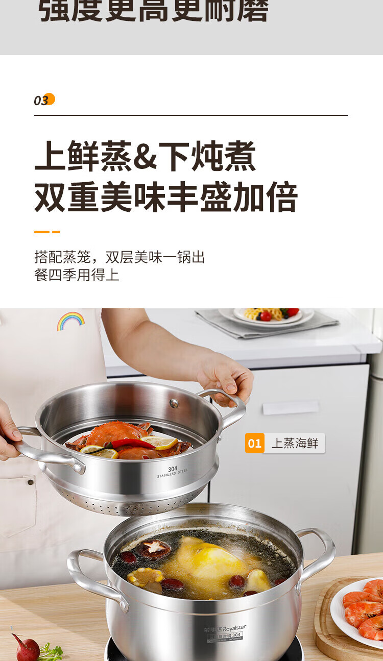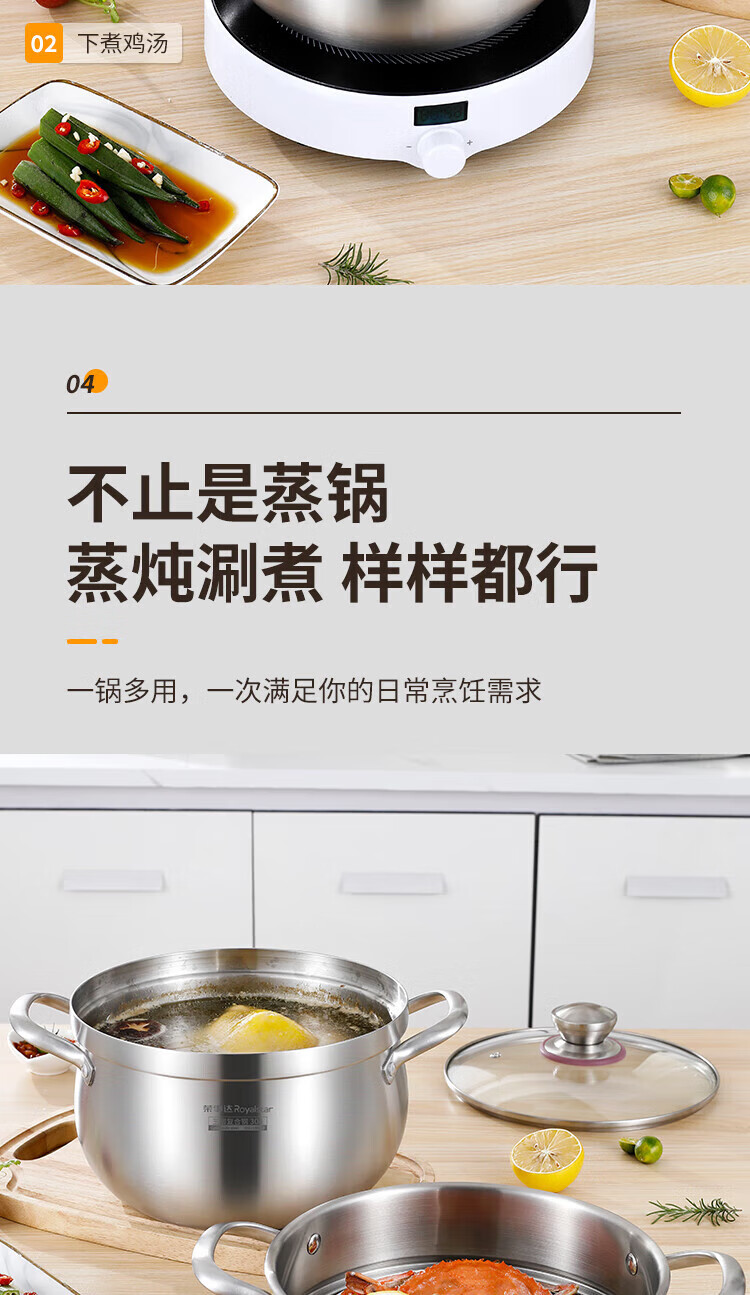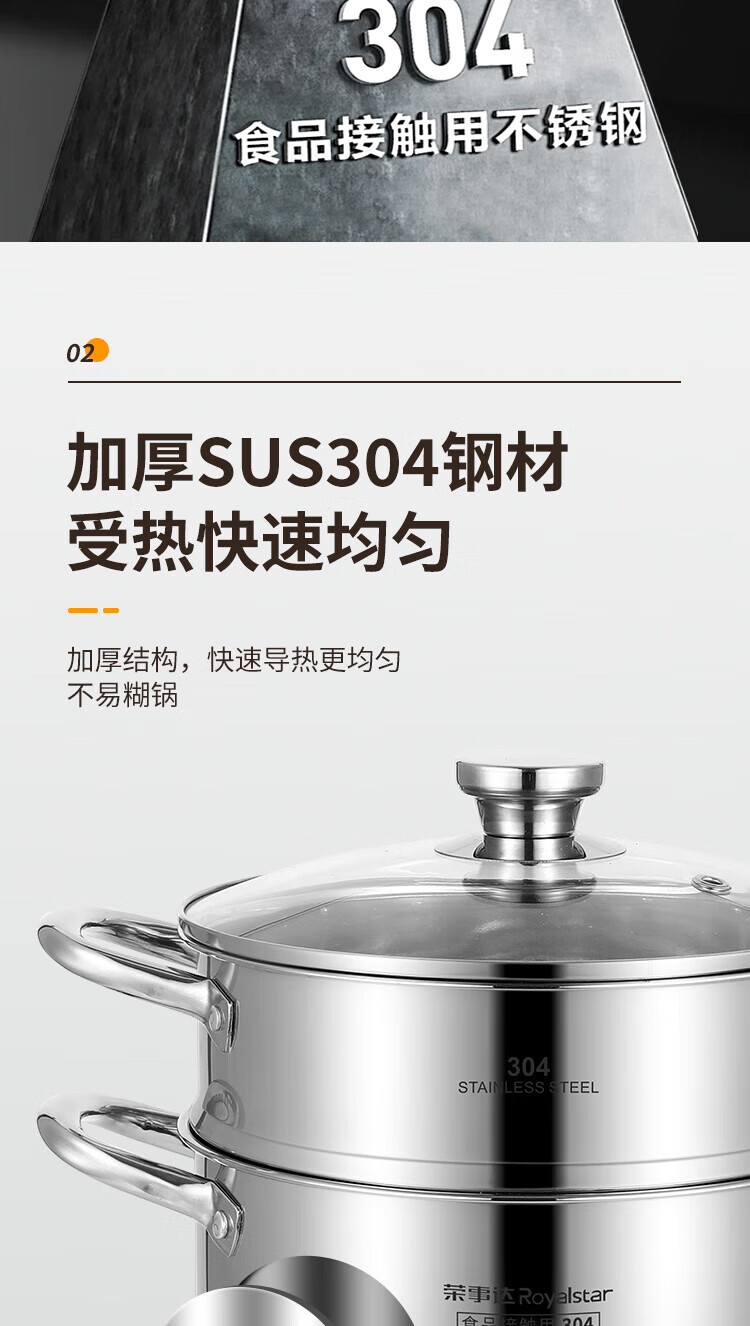 Royalstar steamer household stainless steel pot steamer thickened double bottom soup pot gas induction cooker universal steaming dual-purpose double-layer steamer 22cm