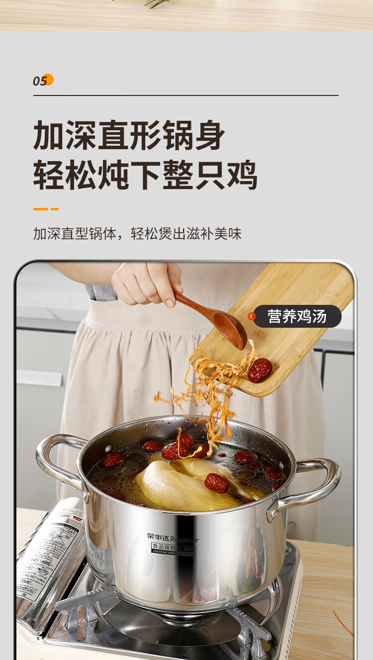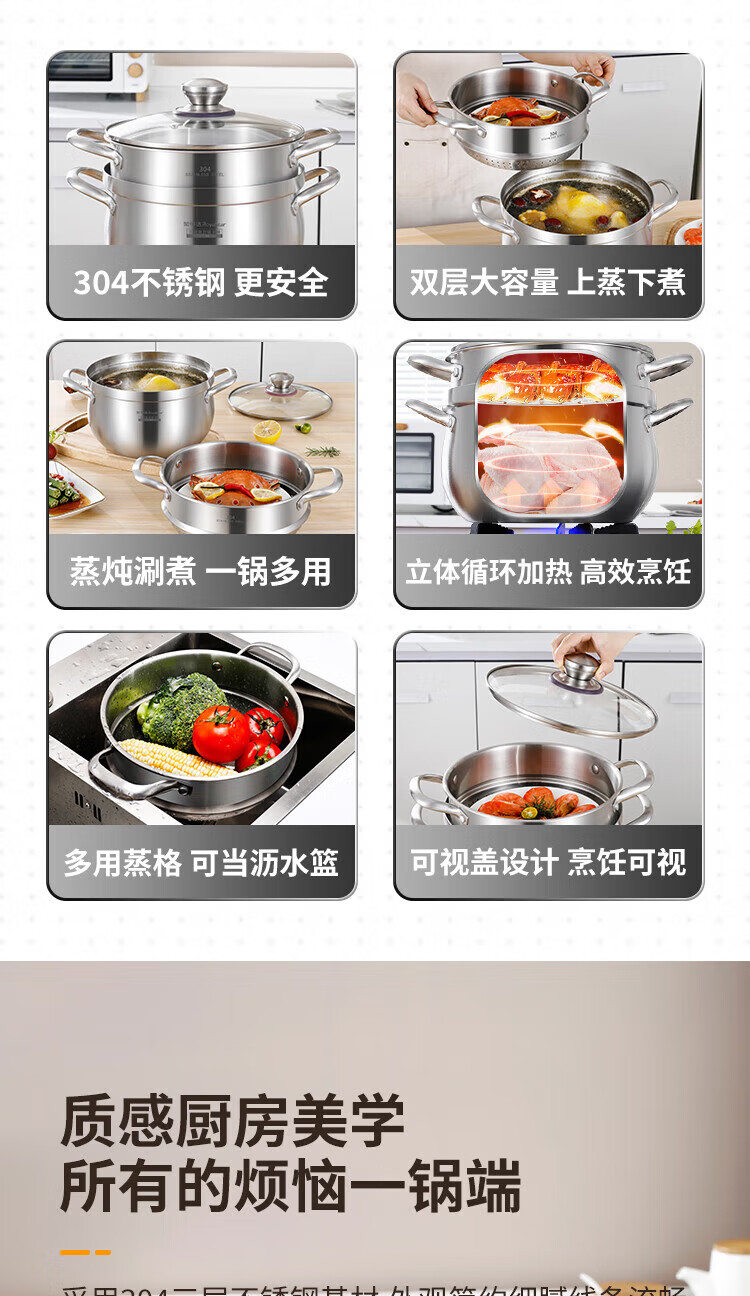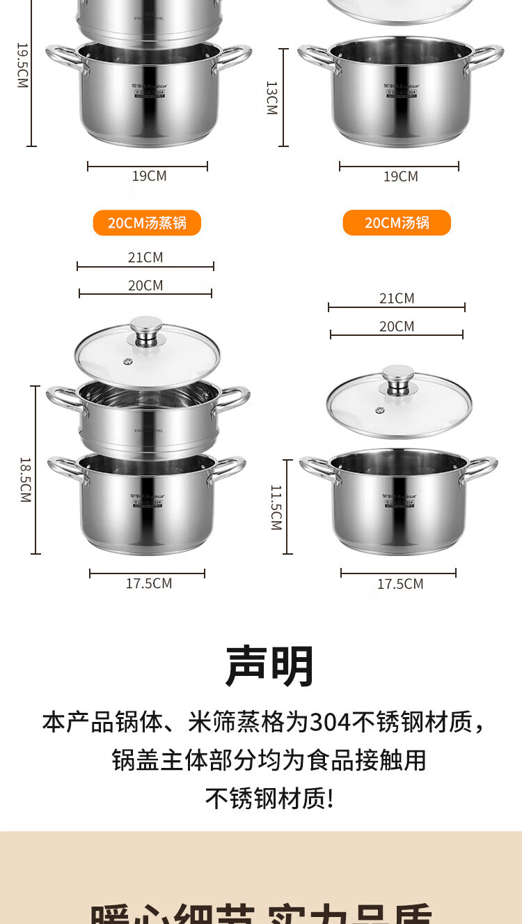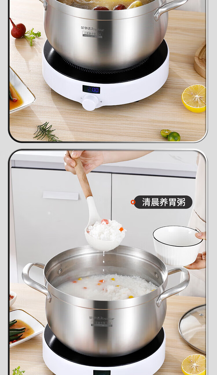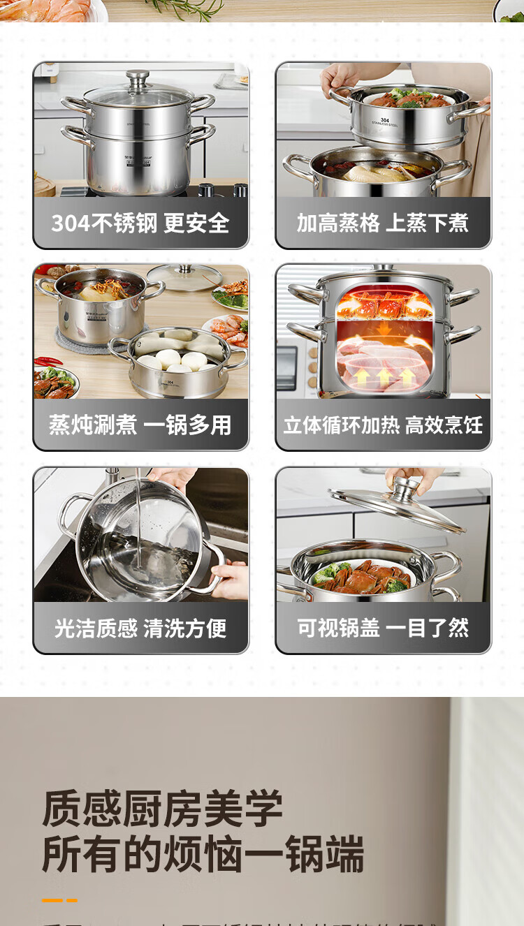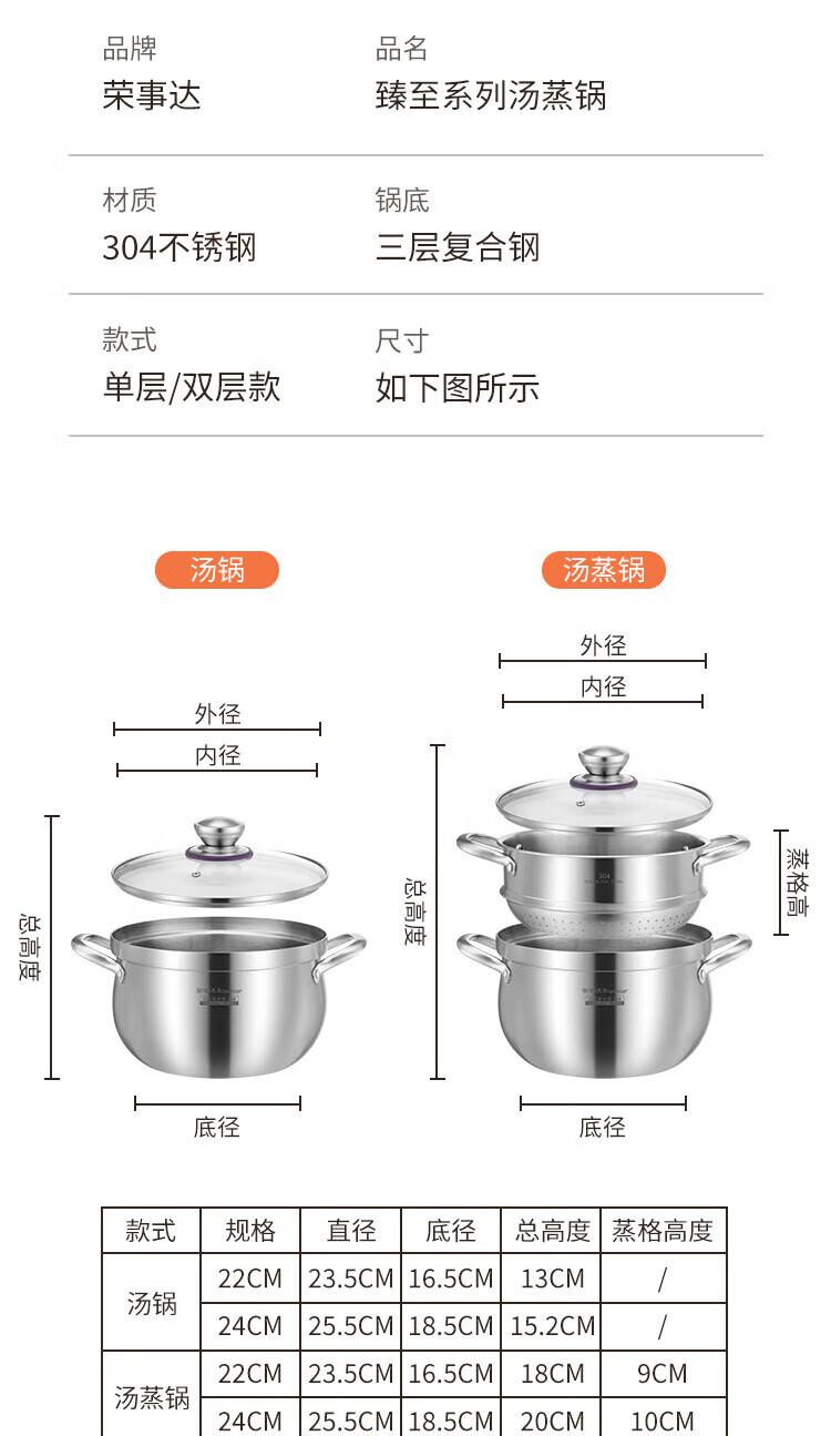 Royalstar steamer household stainless steel pot steamer thickened double bottom soup pot gas induction cooker universal steaming dual-purpose double-layer steamer 22cm