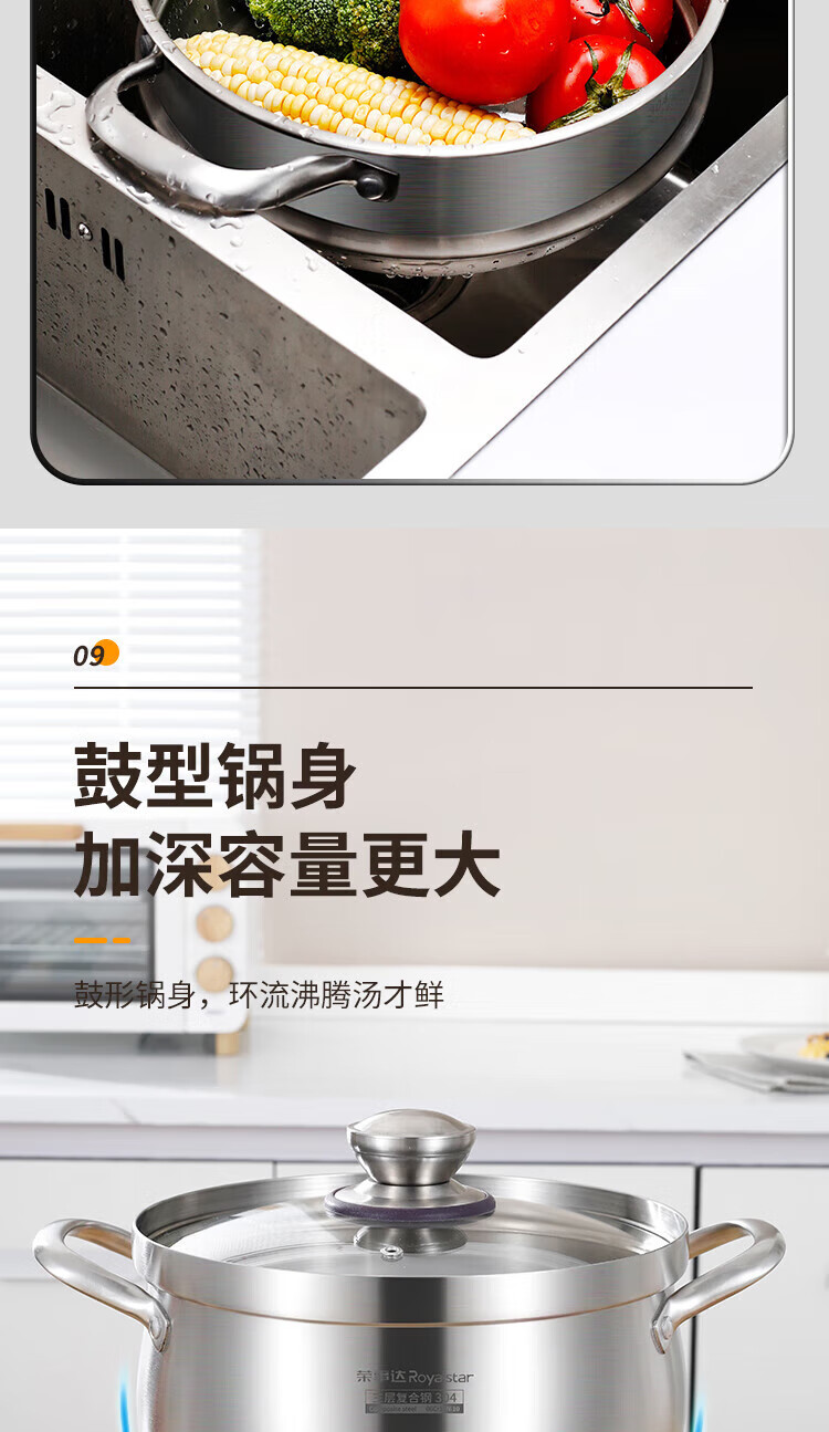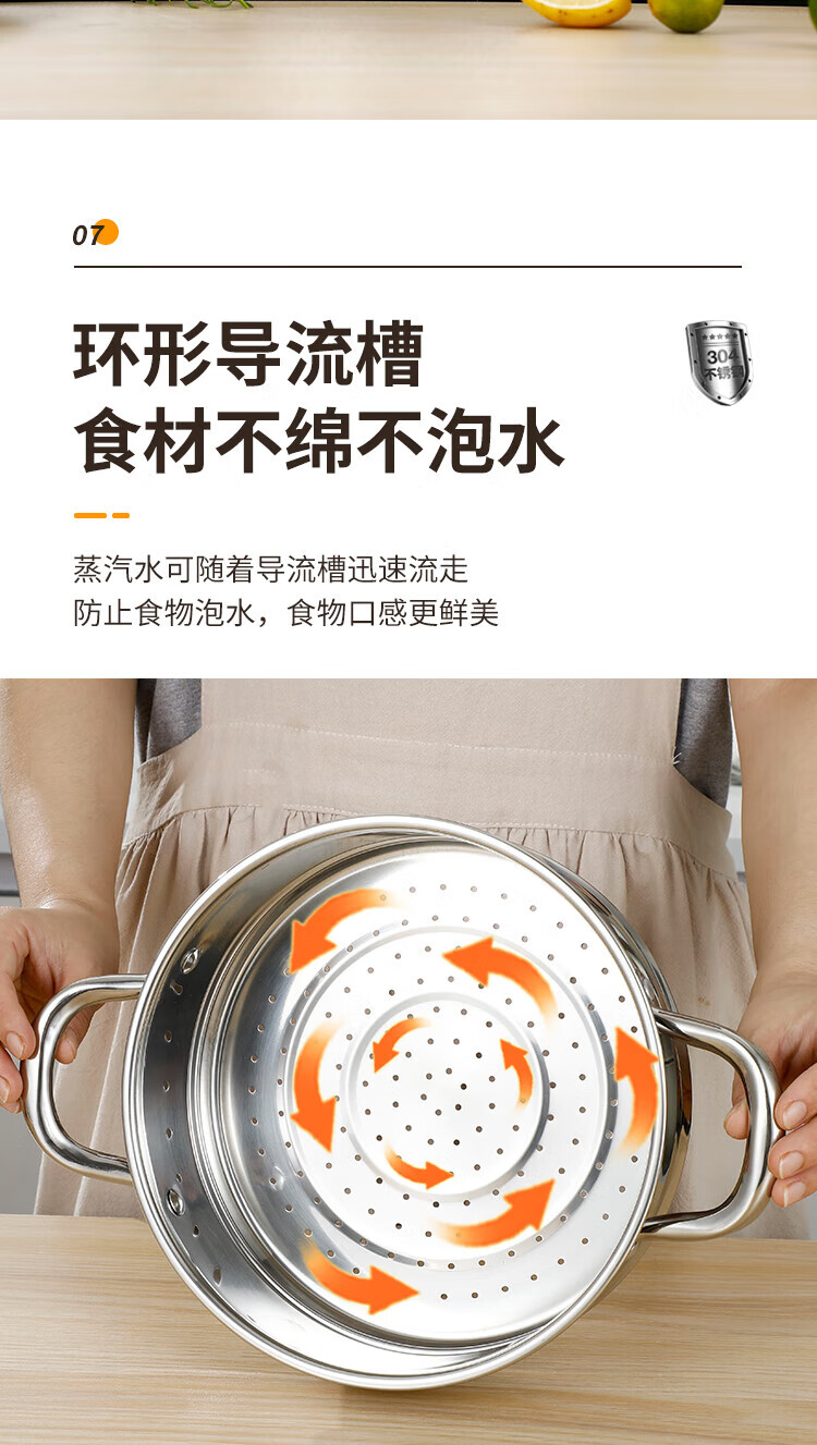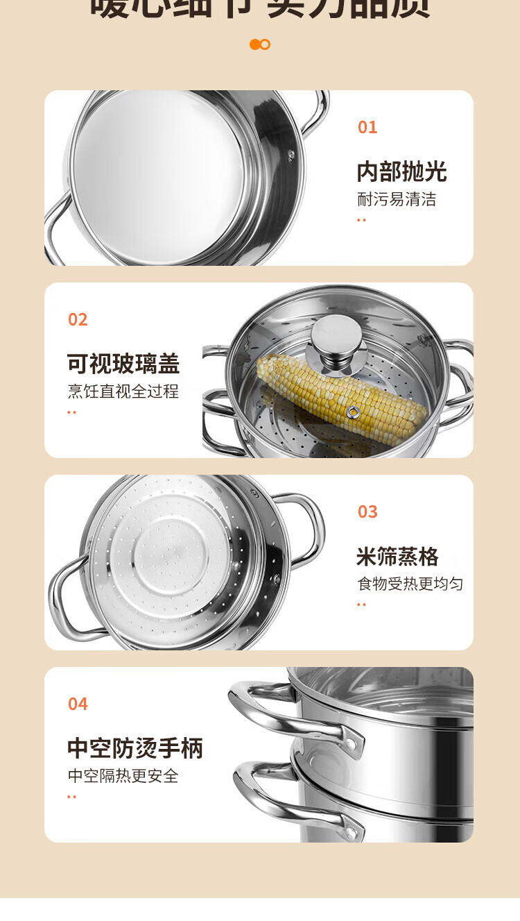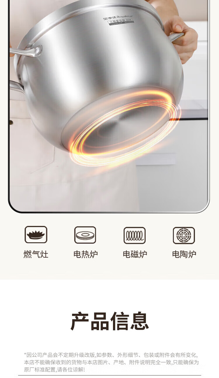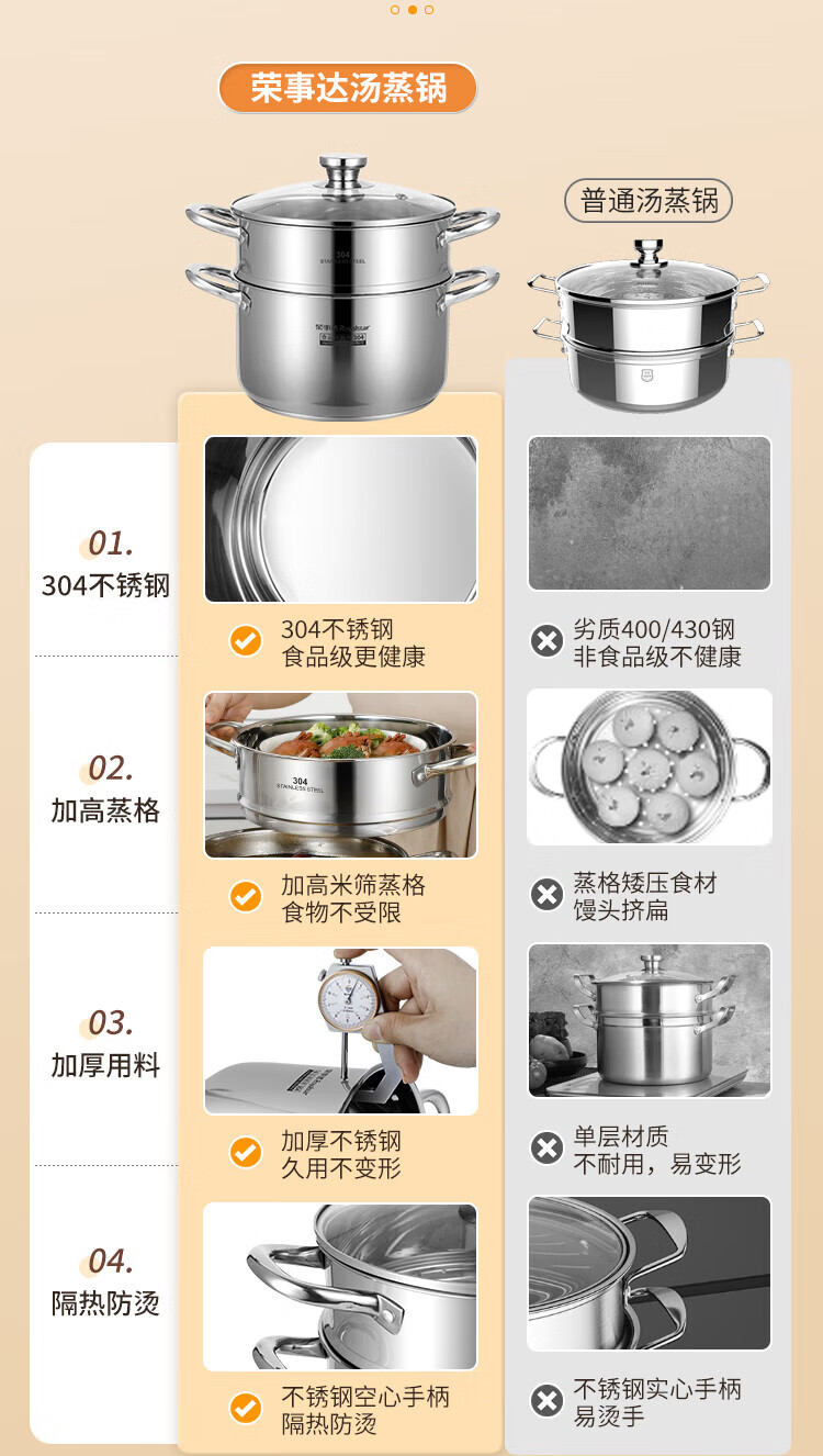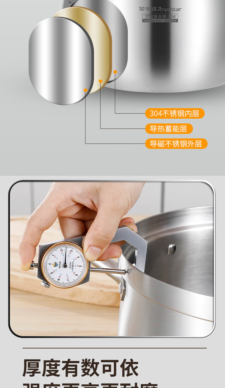 Royalstar steamer household stainless steel pot steamer thickened double bottom soup pot gas induction cooker universal steaming dual-purpose double-layer steamer 22cm