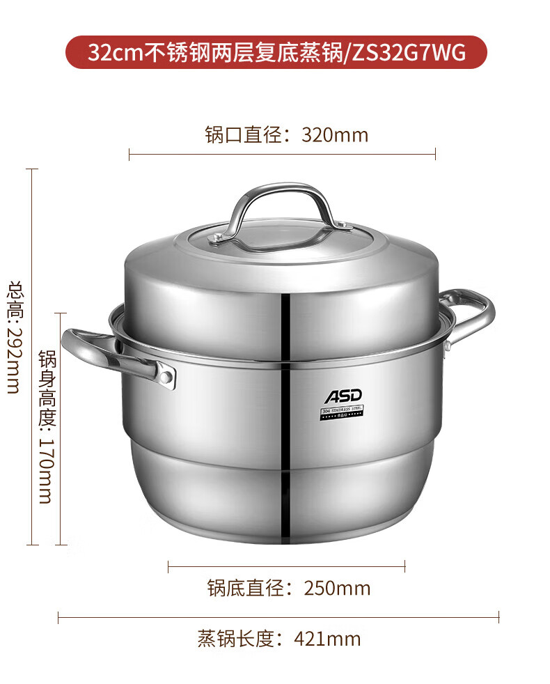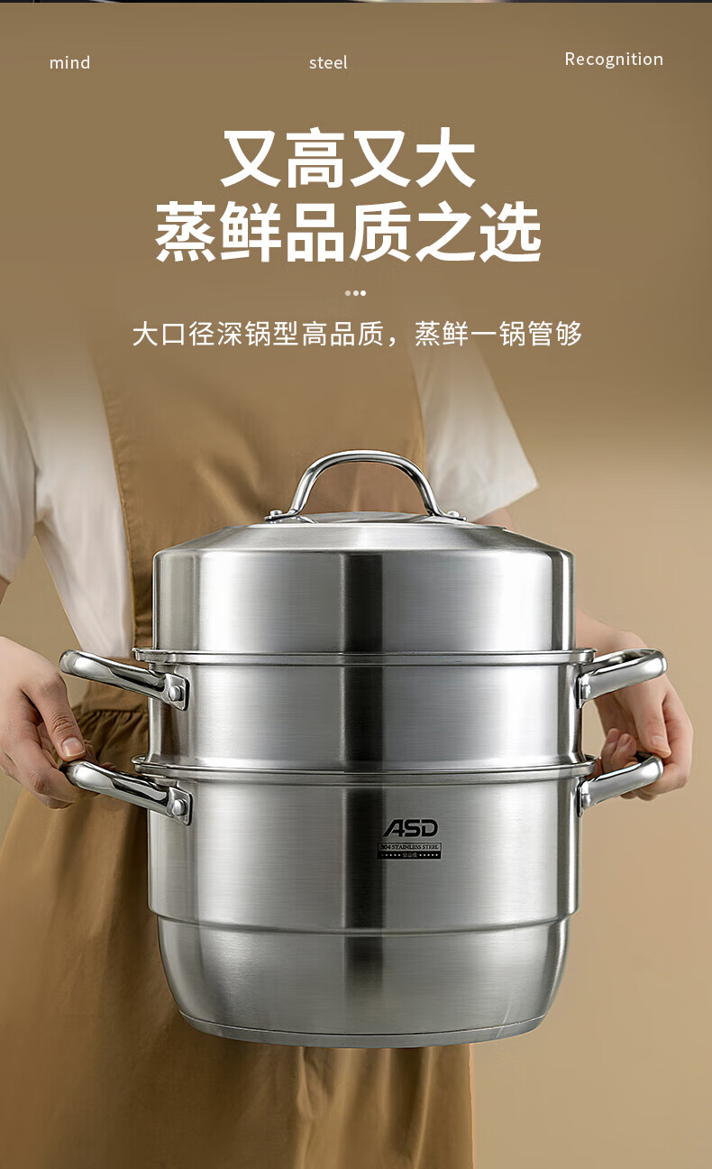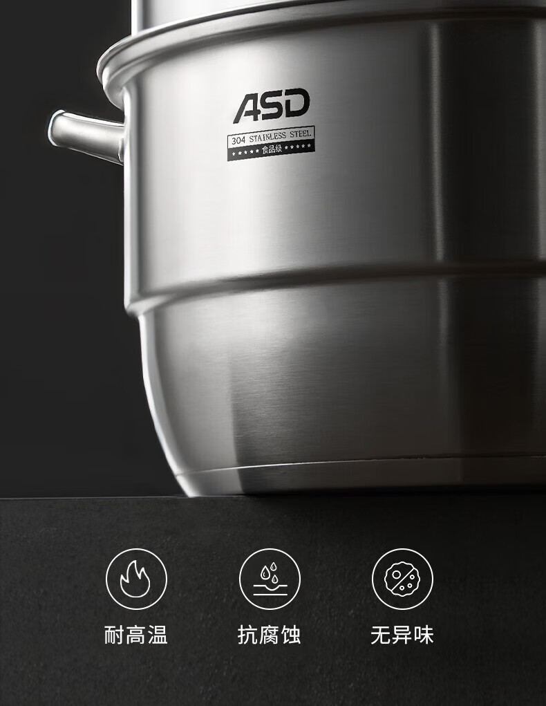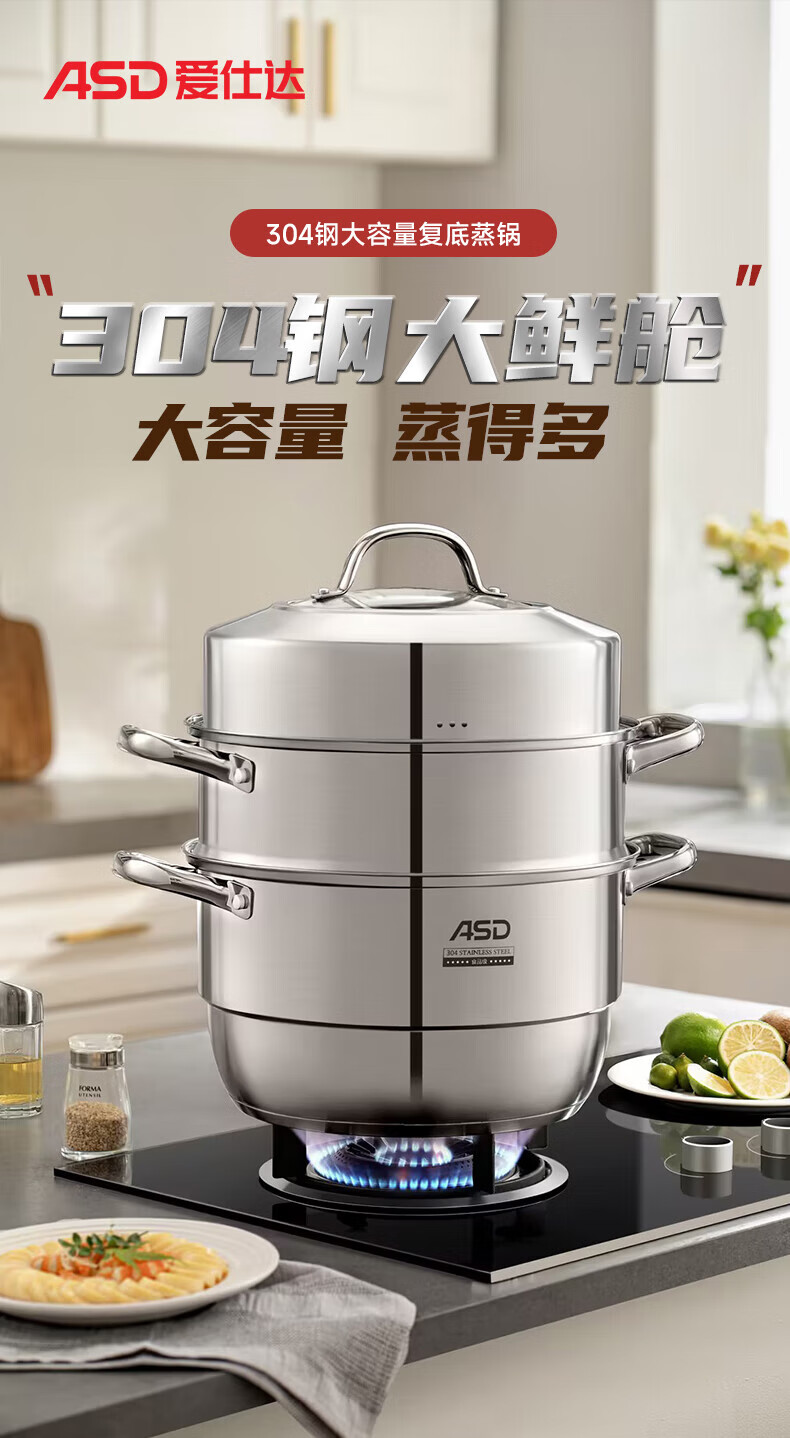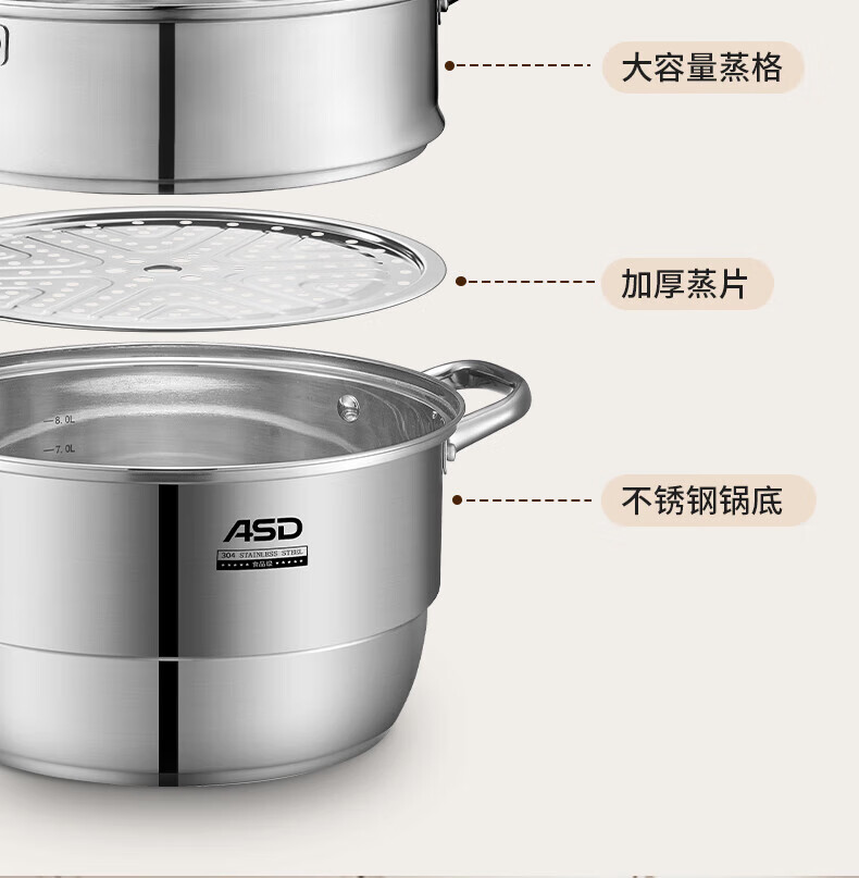 ASD (ASD) 304 stainless steel steamer, gas stove, induction cooker, universal steamer for steamed buns, steamed buns, household fish steamer, thickened pot, large three-layer steamer, 32cm