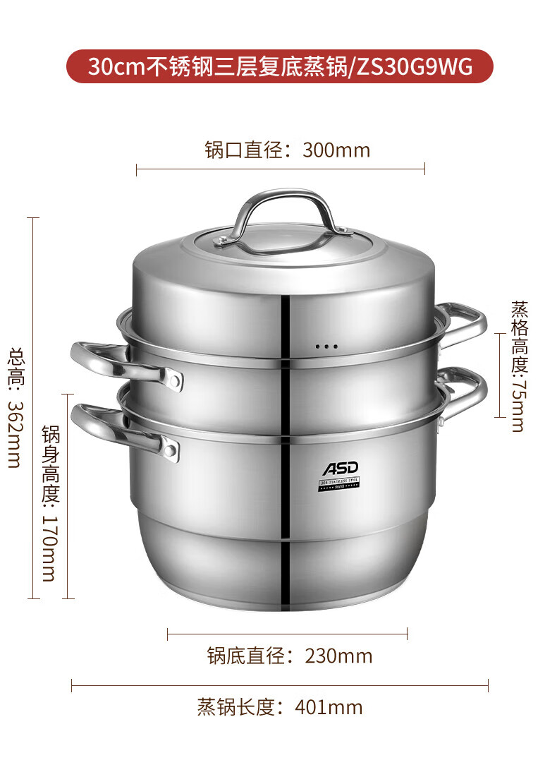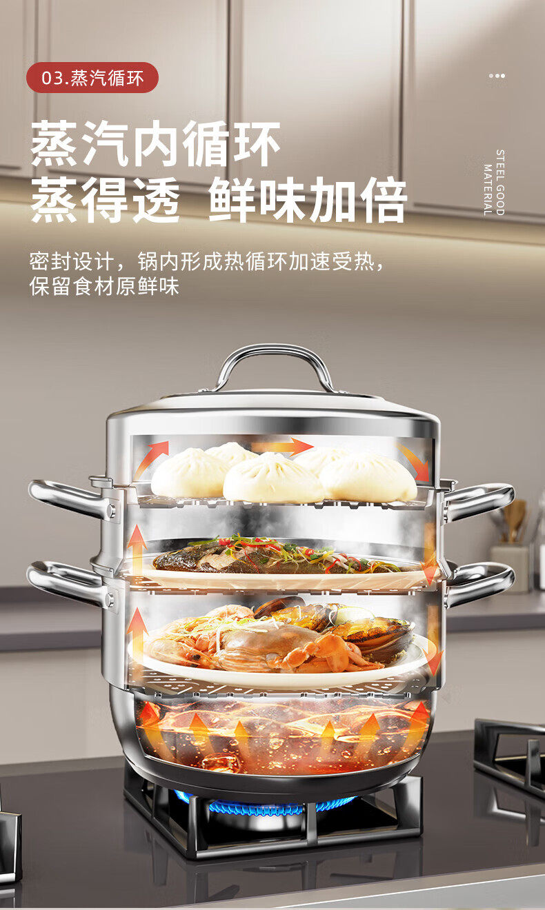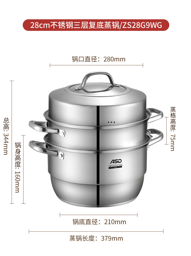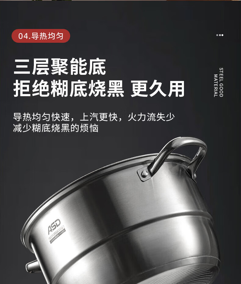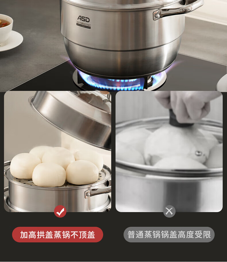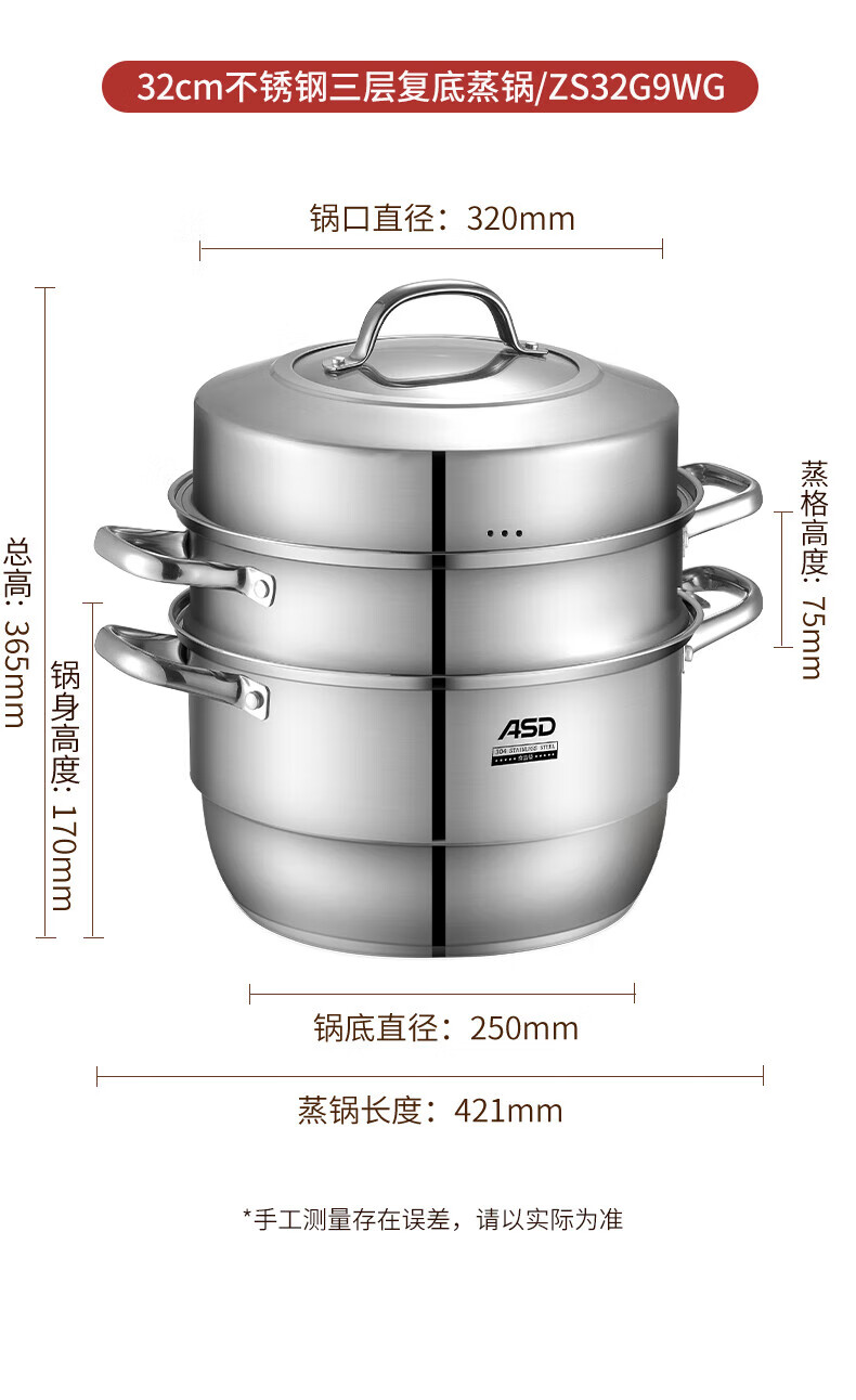 ASD (ASD) 304 stainless steel steamer, gas stove, induction cooker, universal steamer for steamed buns, steamed buns, household fish steamer, thickened pot, large three-layer steamer, 32cm