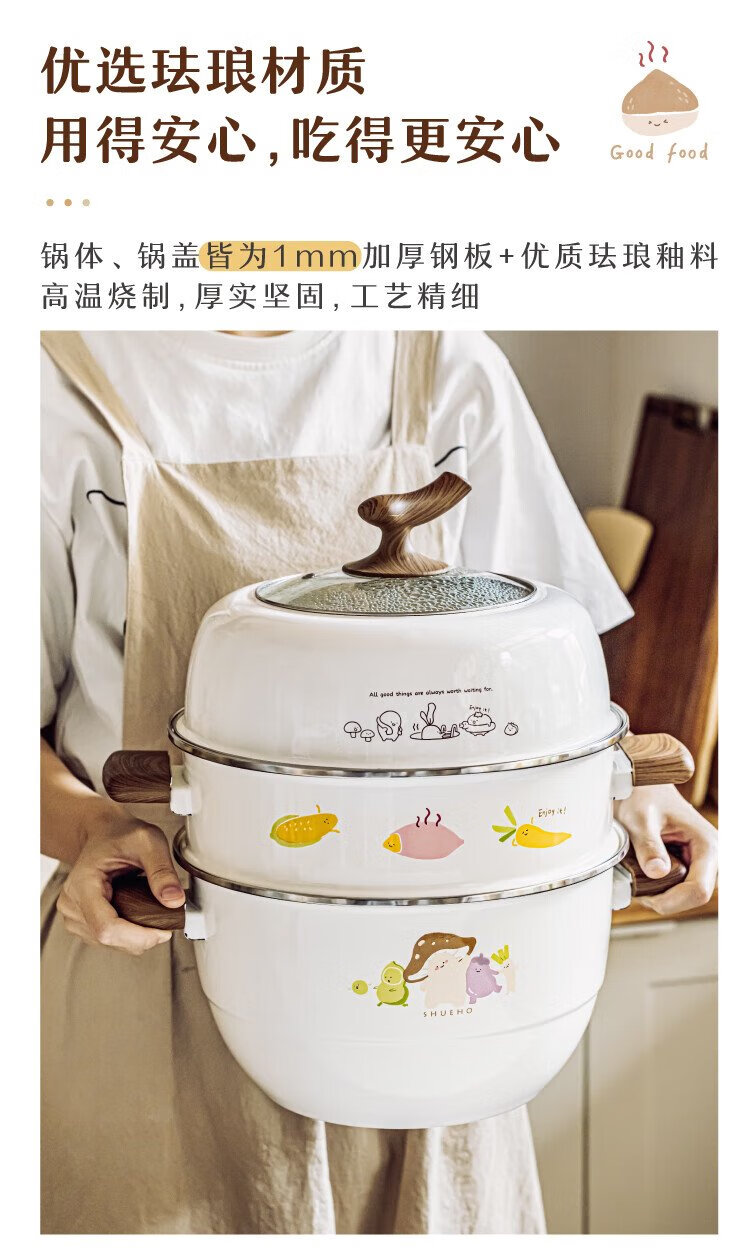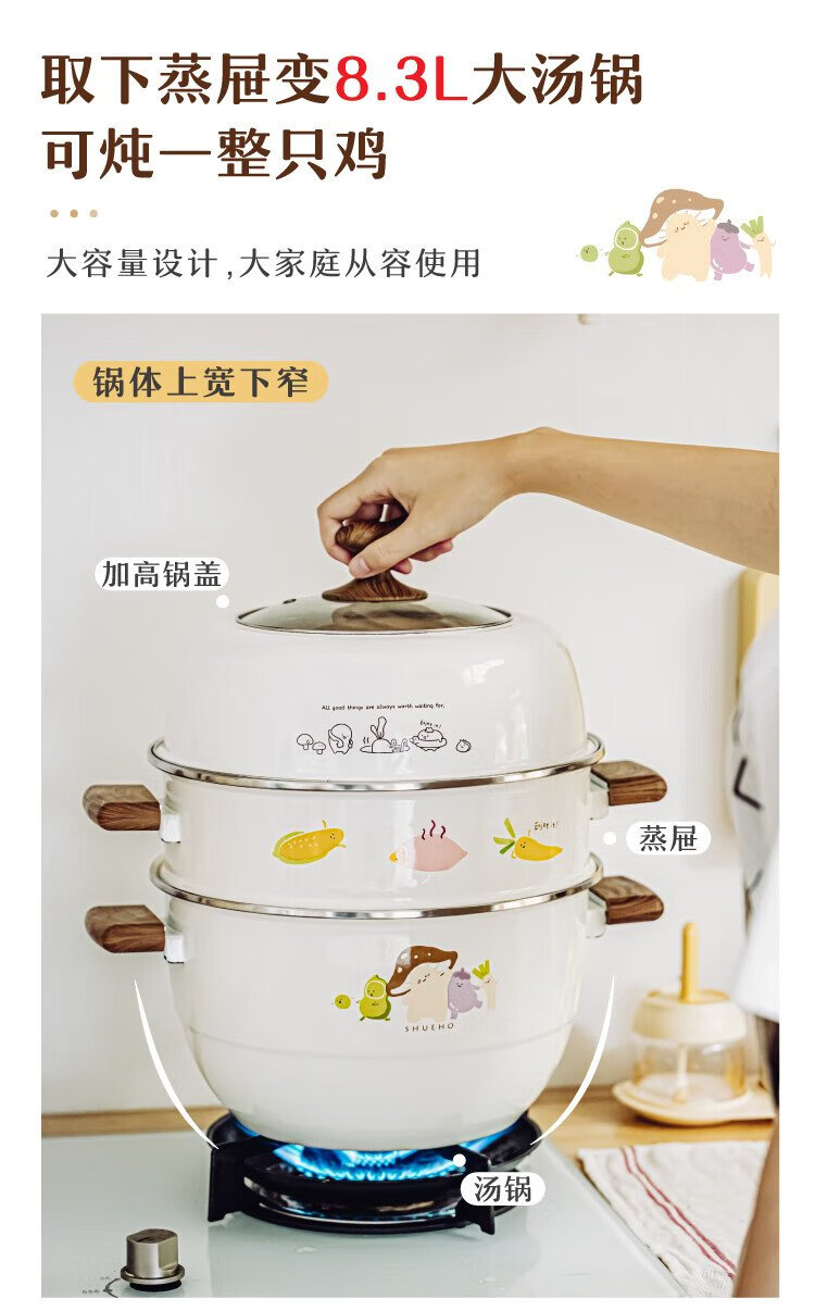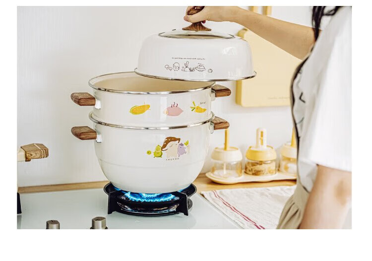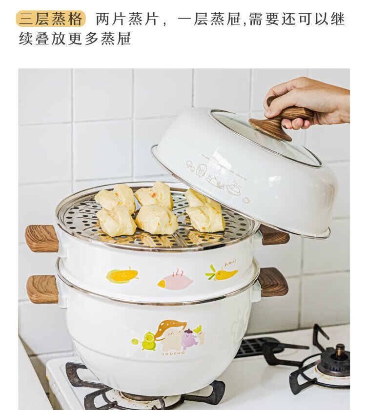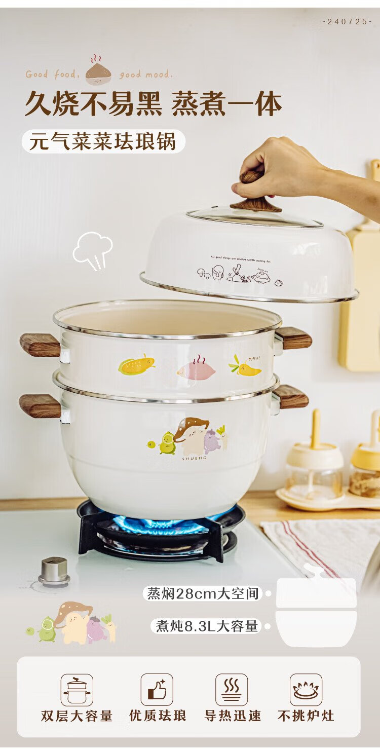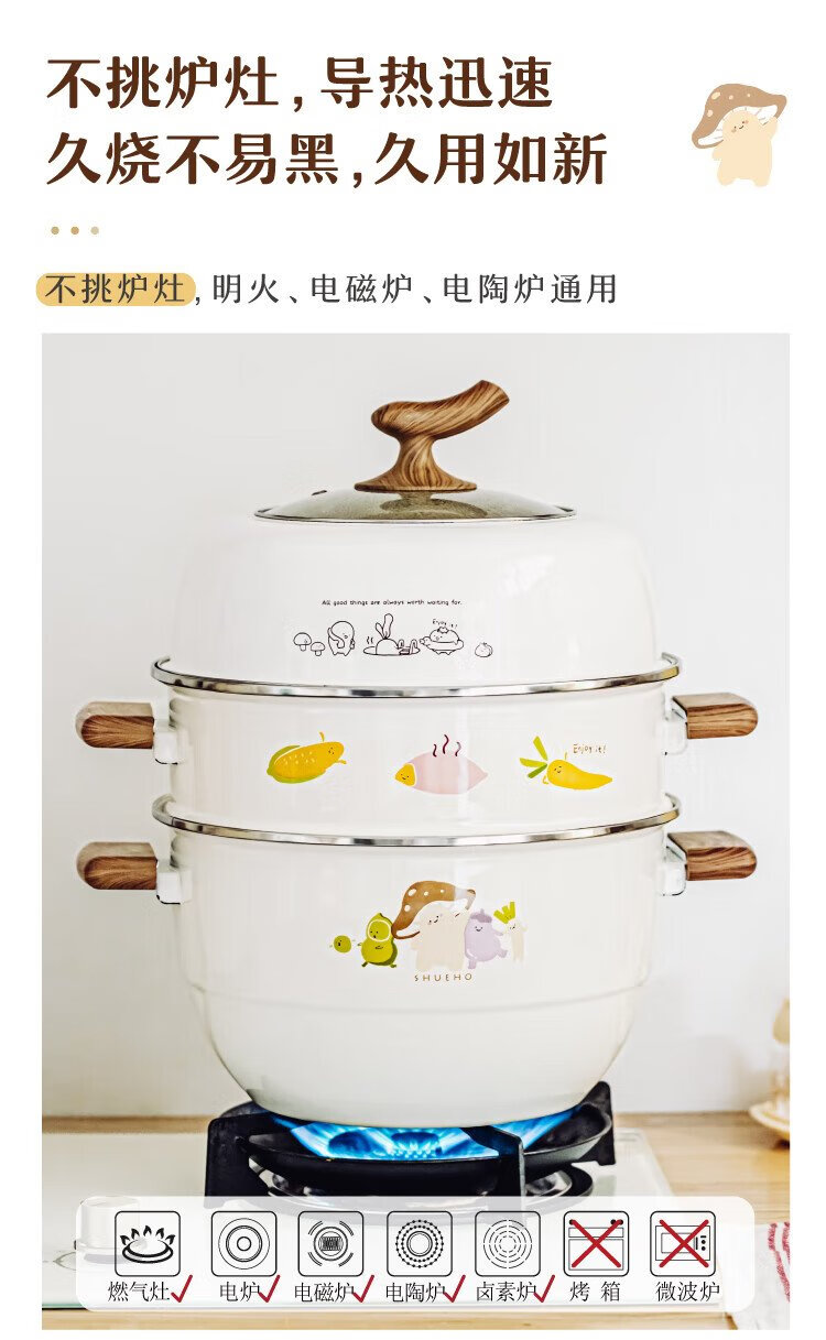 Shuke Yuanqi vegetable enamel steamer household steaming, cooking and stewing all-in-one gas induction cooker universal super large capacity double layer with steamer 28cm steamer single pot + single layer steamer 28cm
