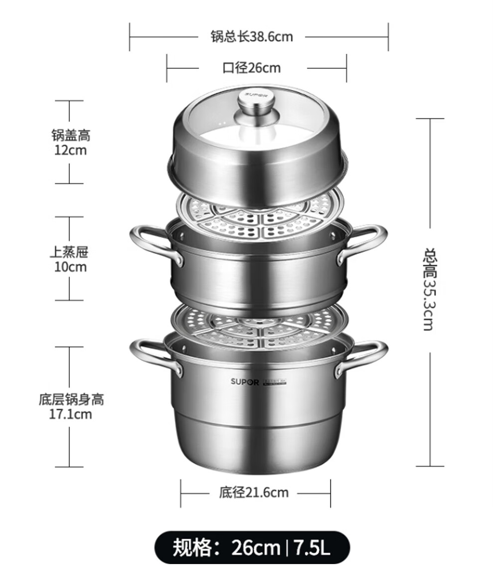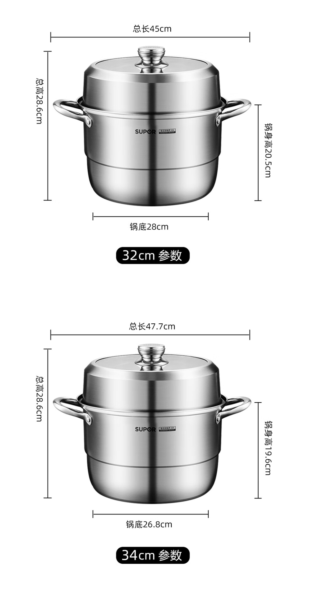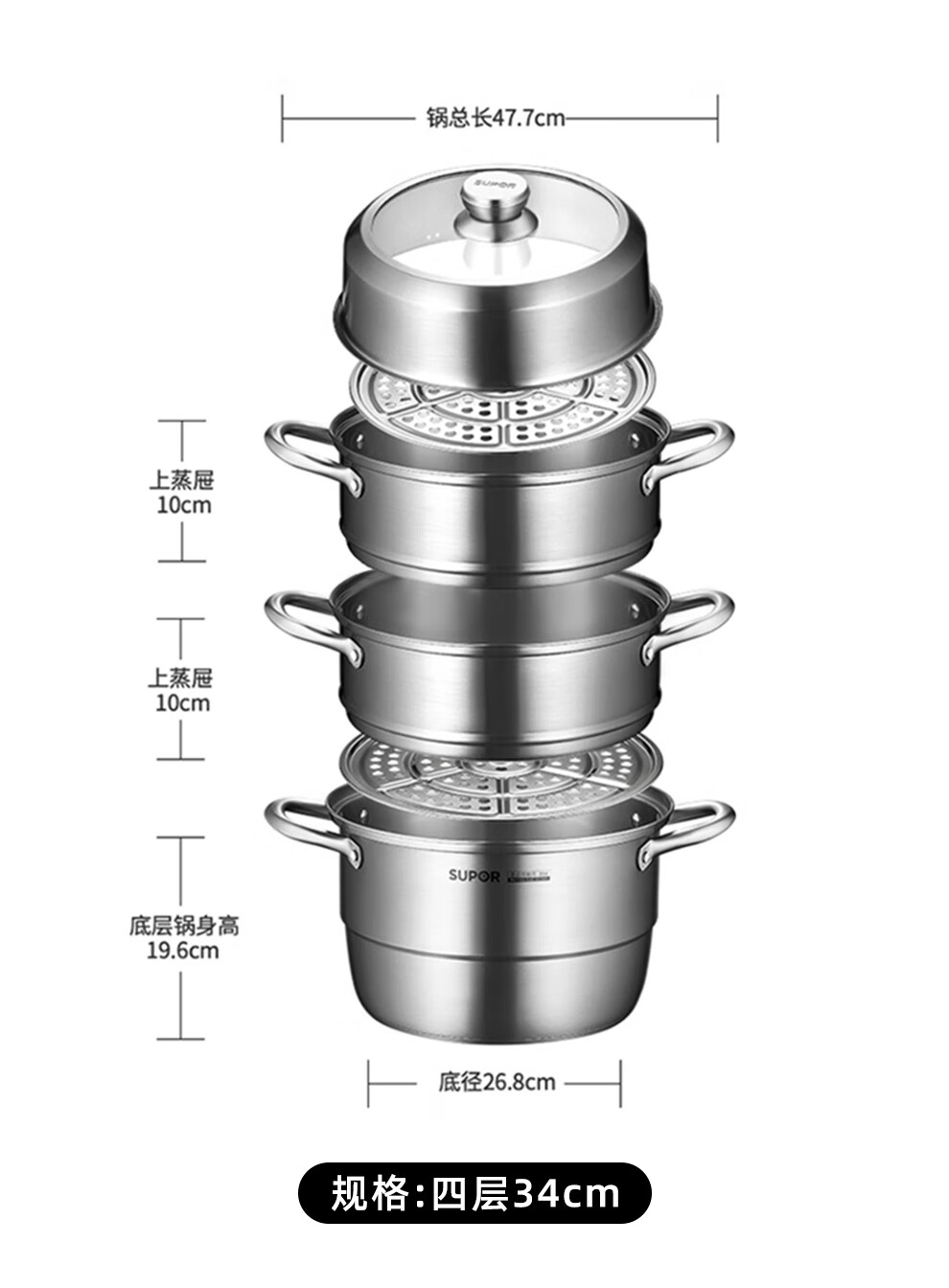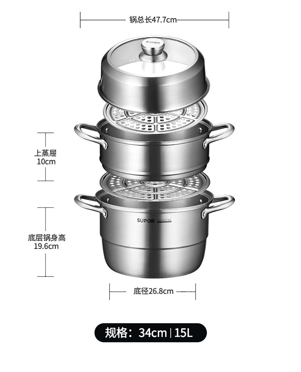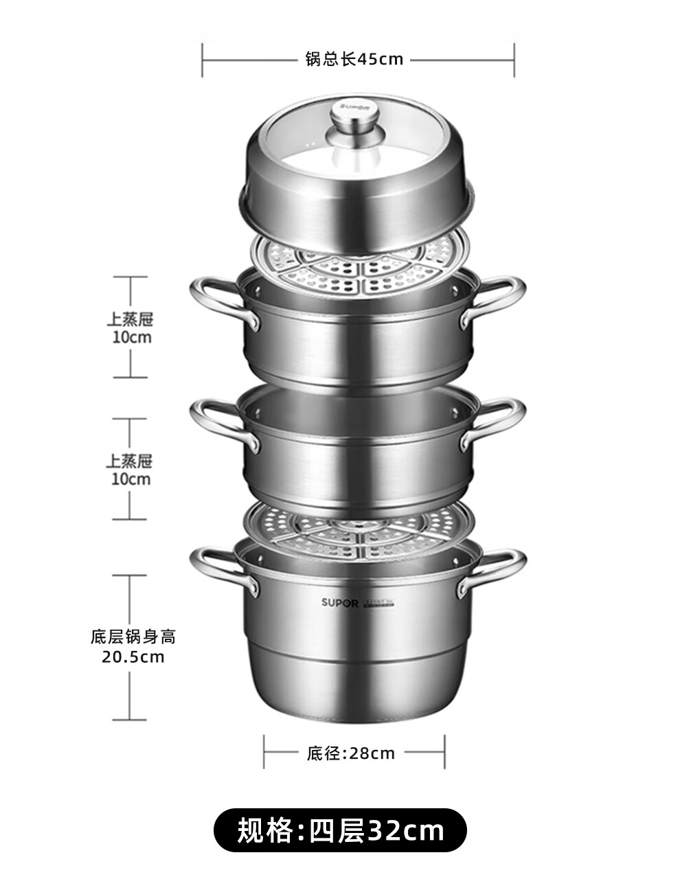 Supor steamer three-layer multi-bottom 304 stainless steel large-capacity basket soup pot double-layer 3-layer large steamer steamer steamer pot universal three-layer multi-bottom steamer 32cm