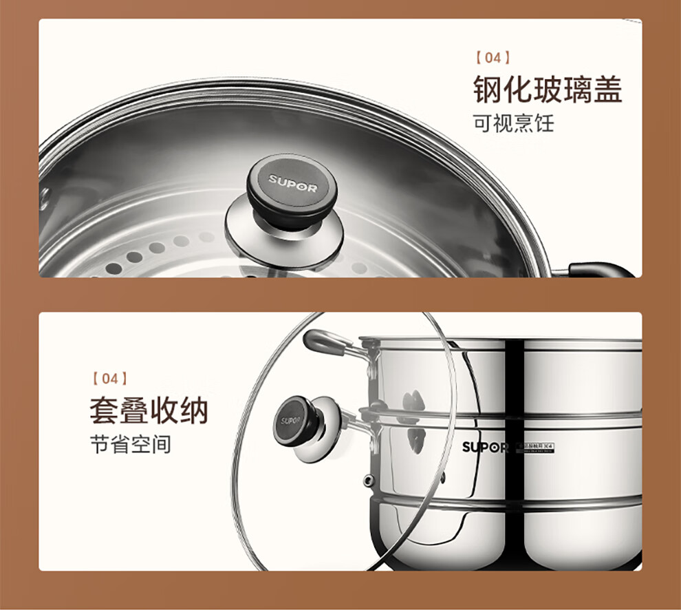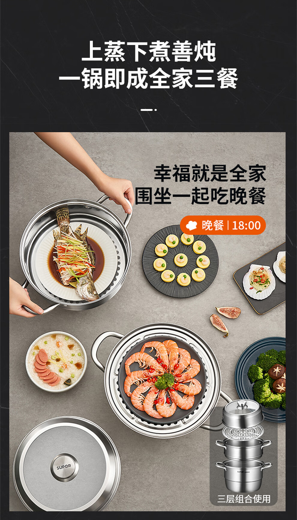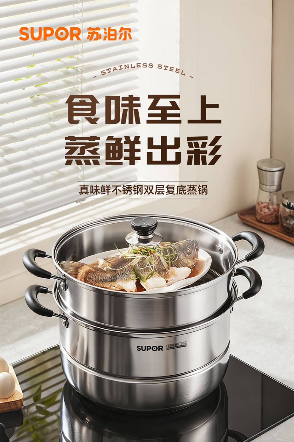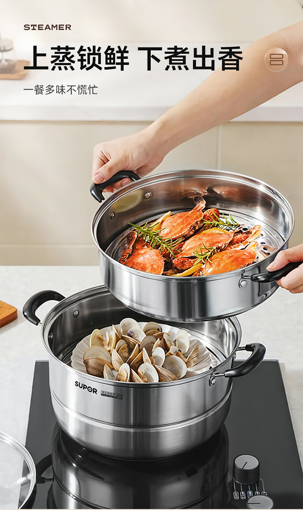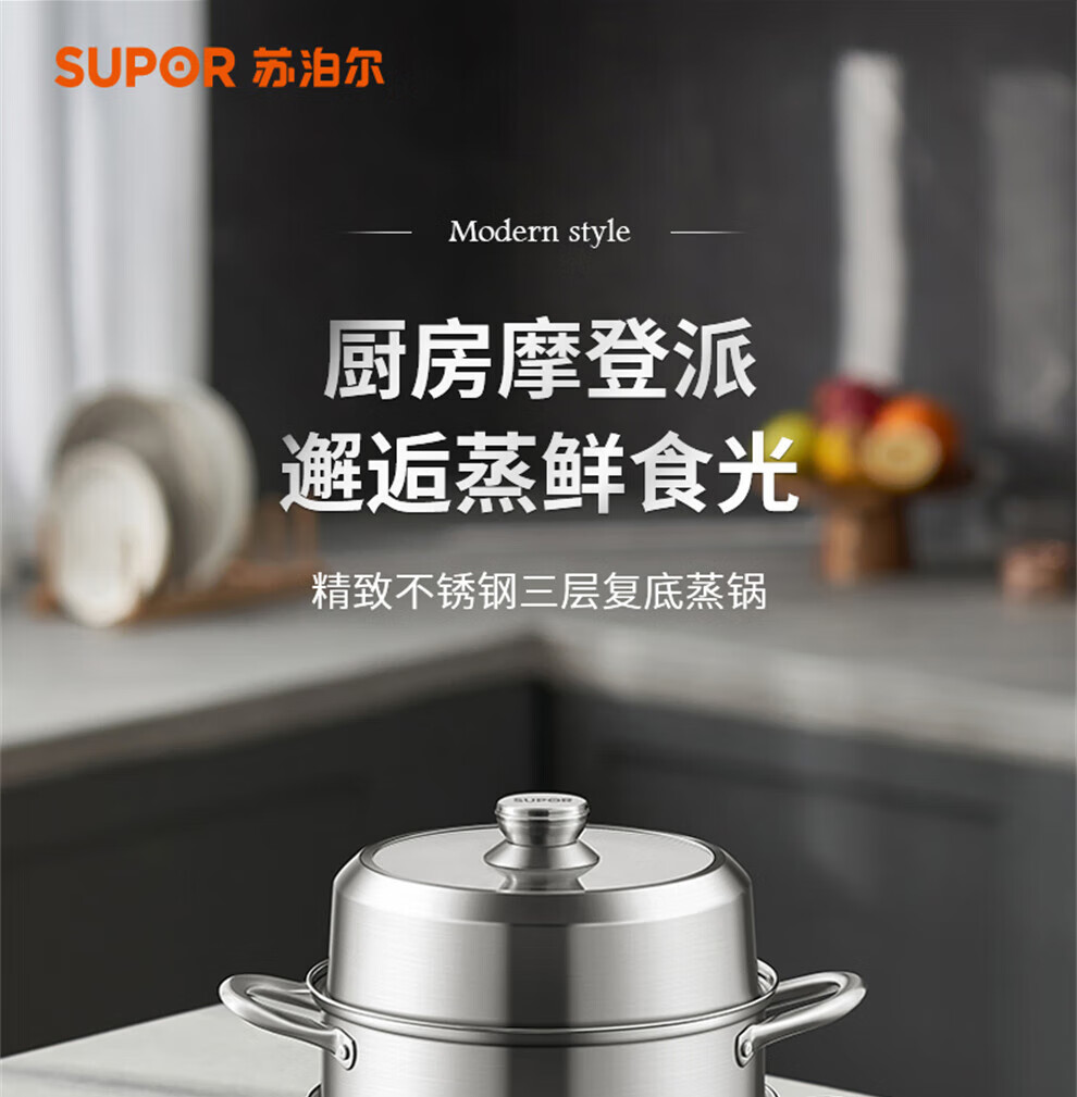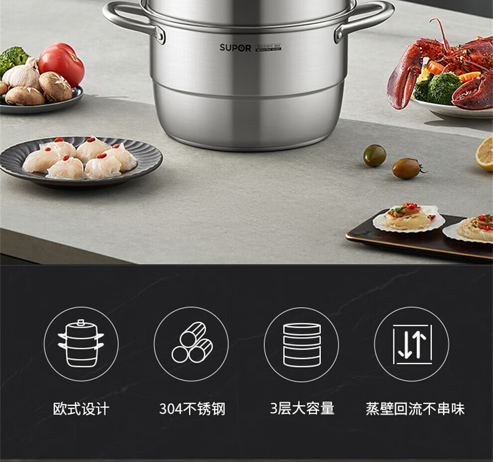 Supor steamer three-layer multi-bottom 304 stainless steel large-capacity basket soup pot double-layer 3-layer large steamer steamer steamer pot universal three-layer multi-bottom steamer 32cm