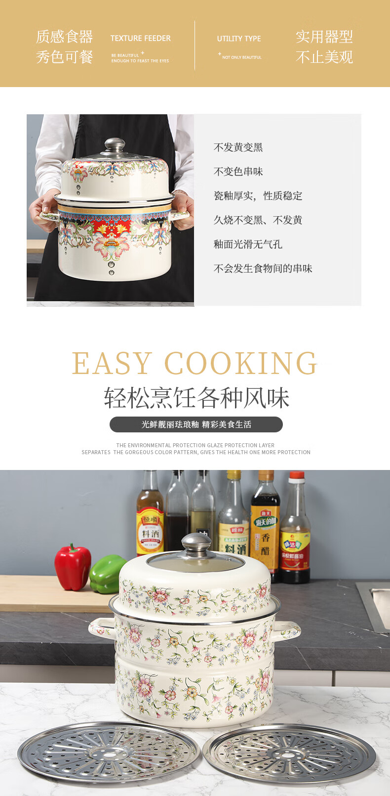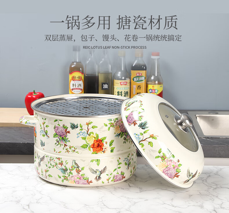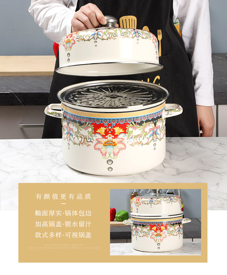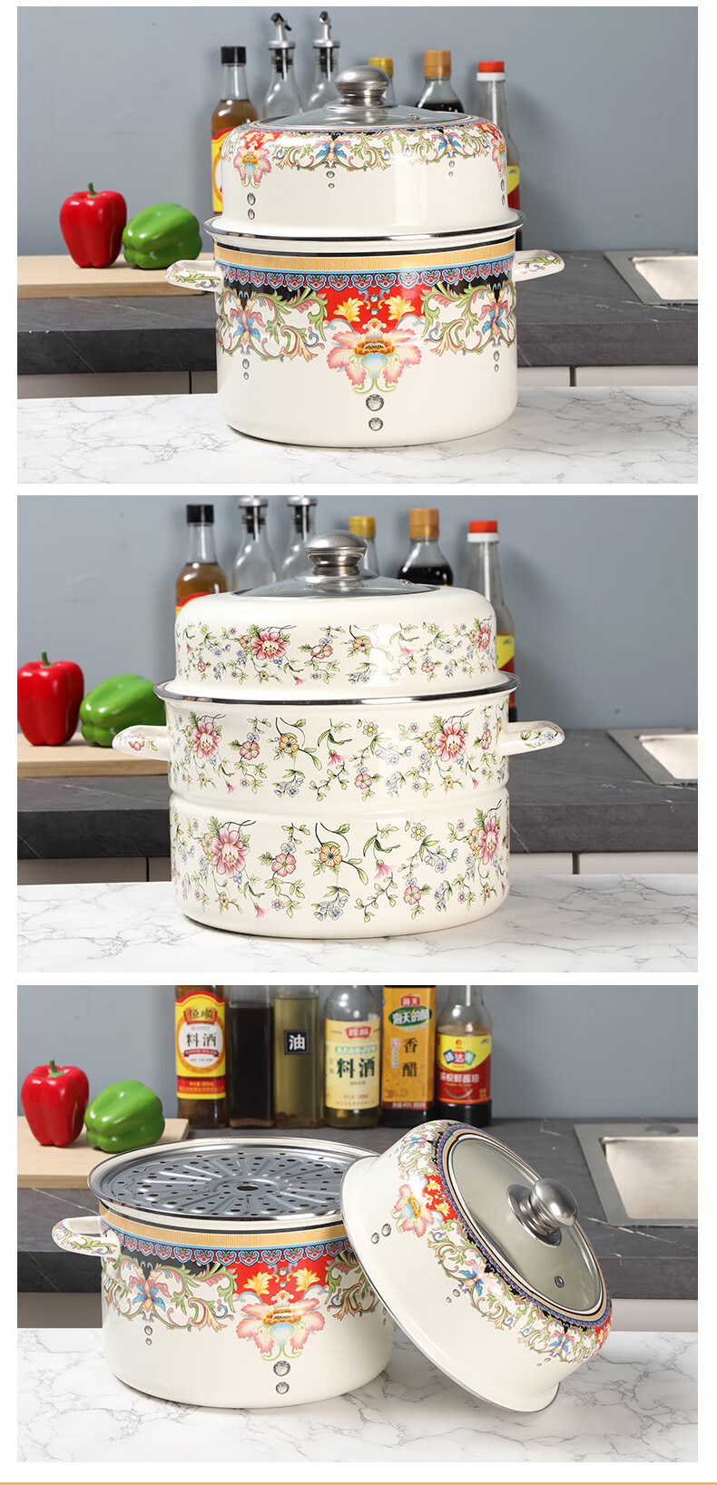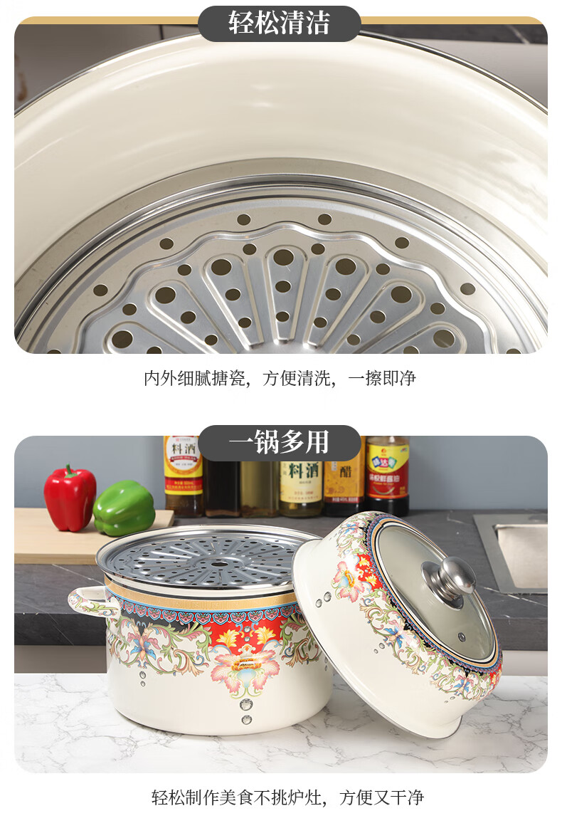 Oulijia enamel steamer with steaming grate, stew pot, soup pot, steamed buns, steamed buns, induction cooker, gas universal, aromatic - visible lid, 2 layers, 26cm