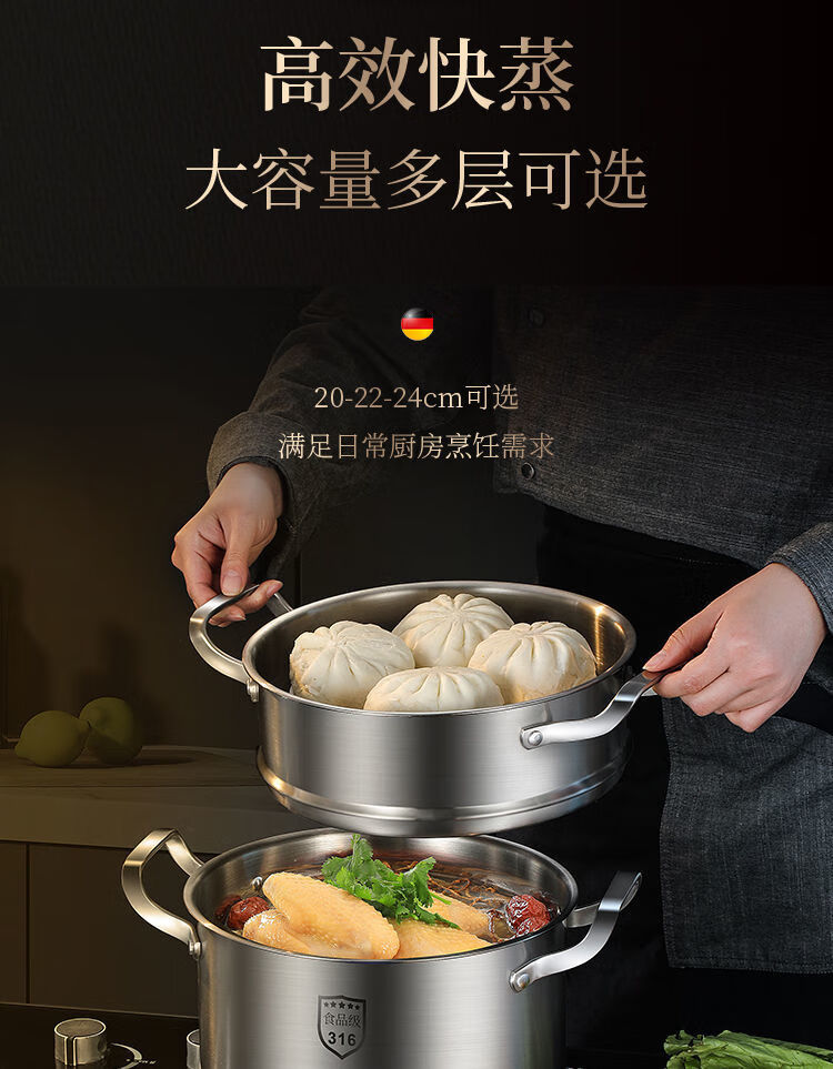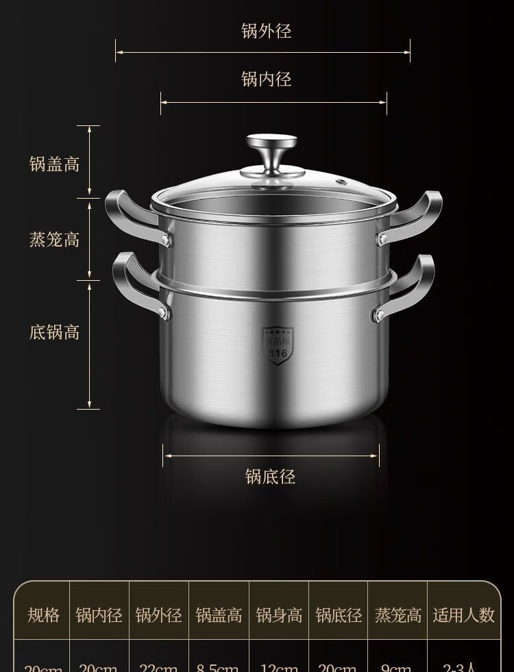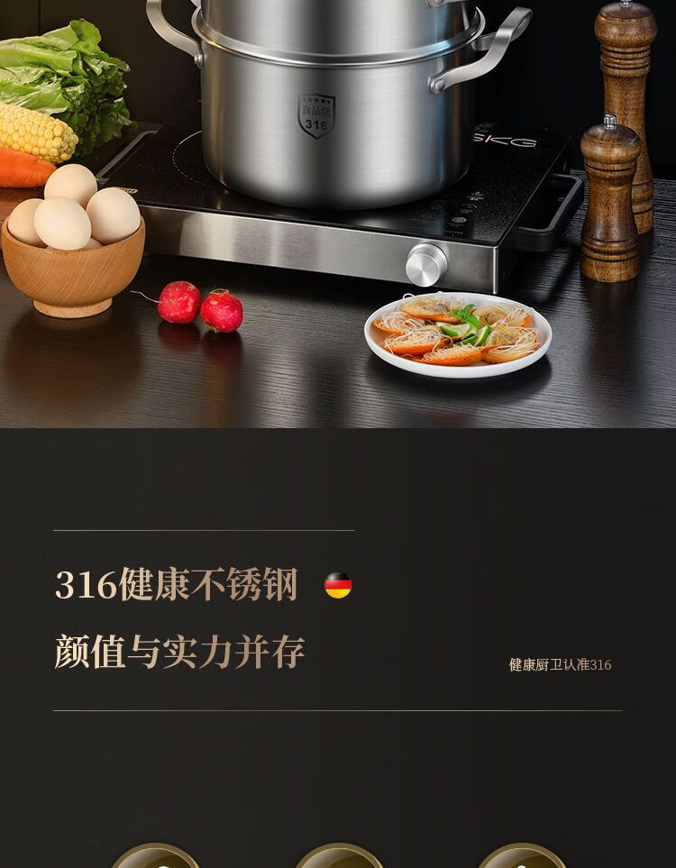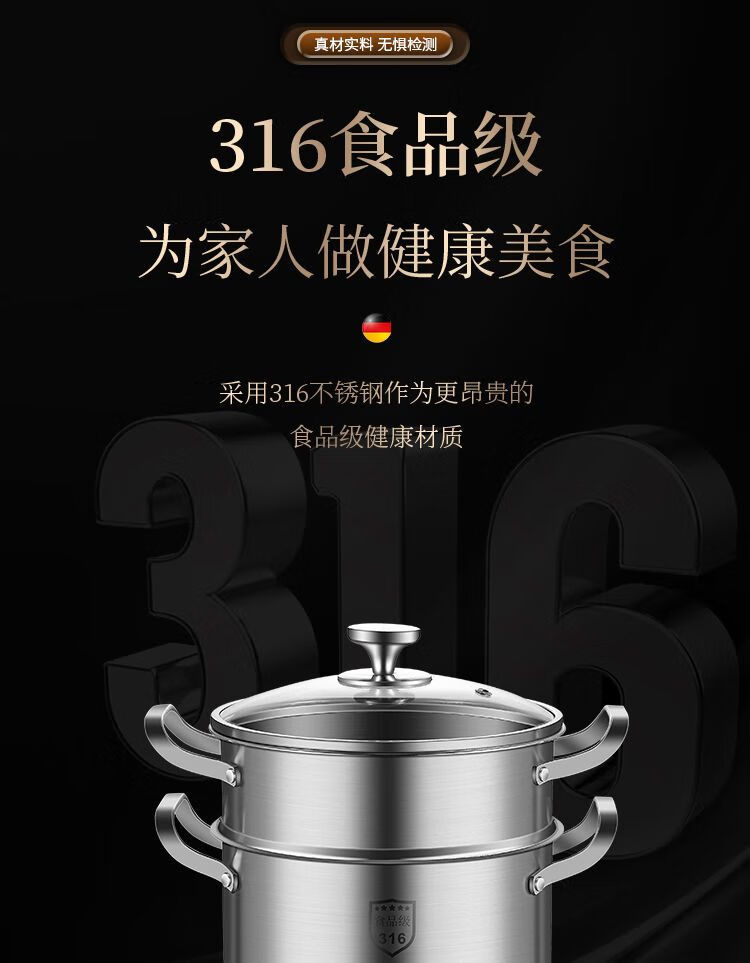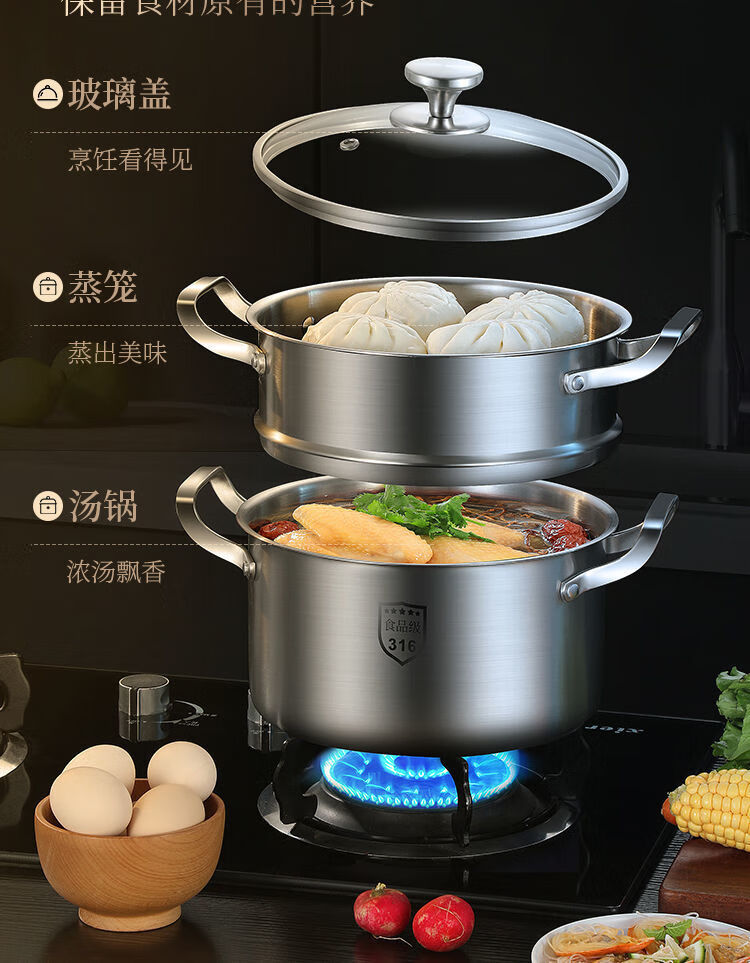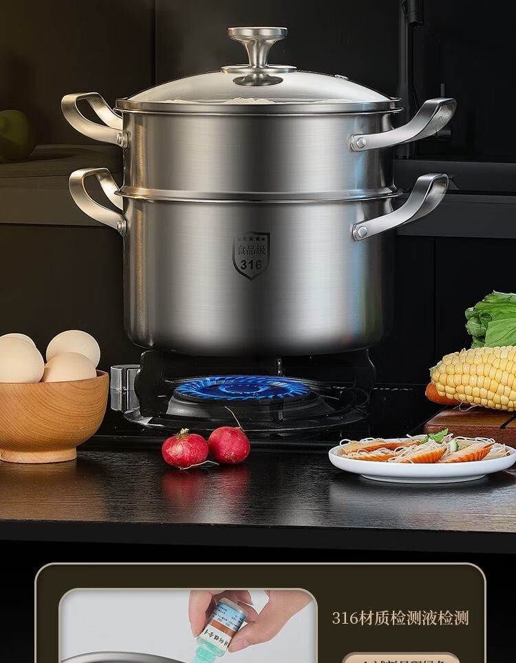 Billion Bear extra thick 316 stainless steel steamer gas stove double-layer soup pot household food-grade electric steamer stew and steam all-in-one double-layer soup steamer steel handle 28cm